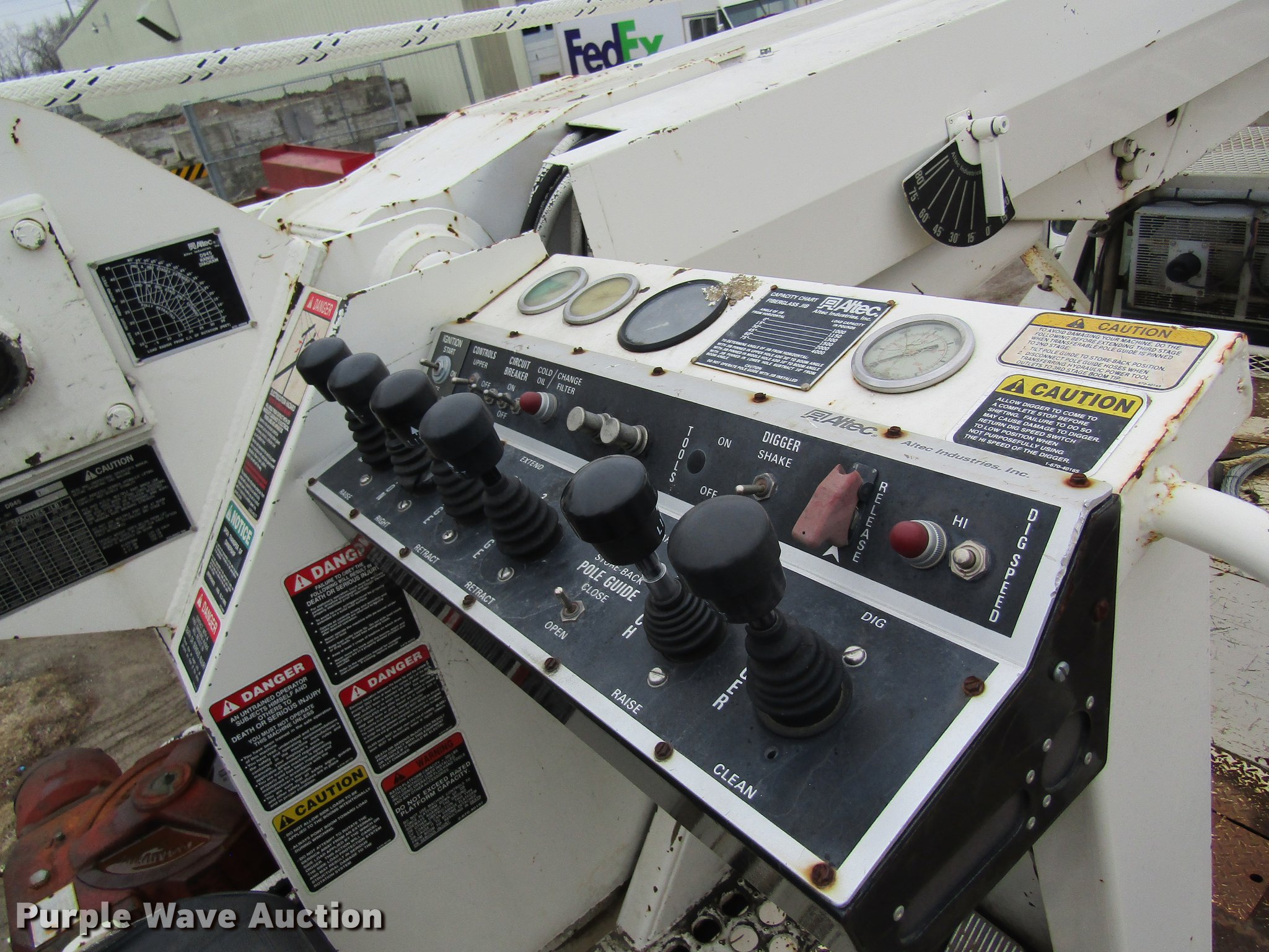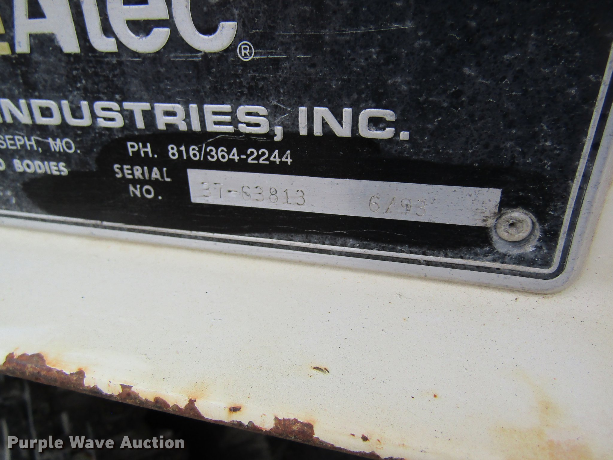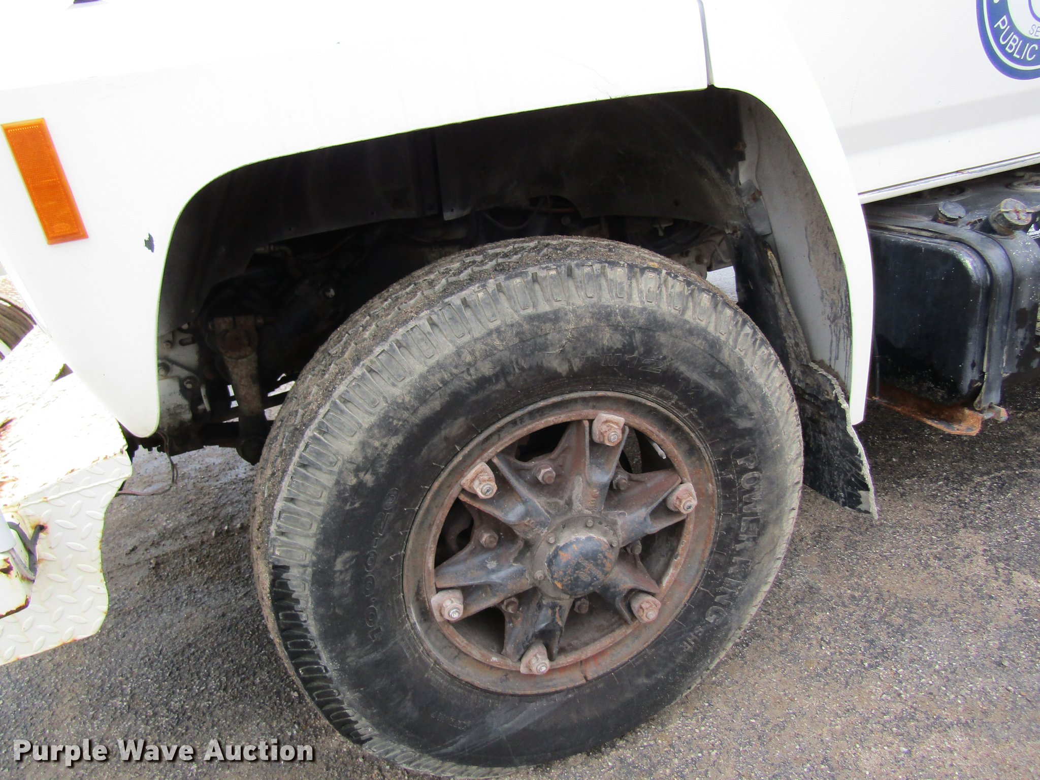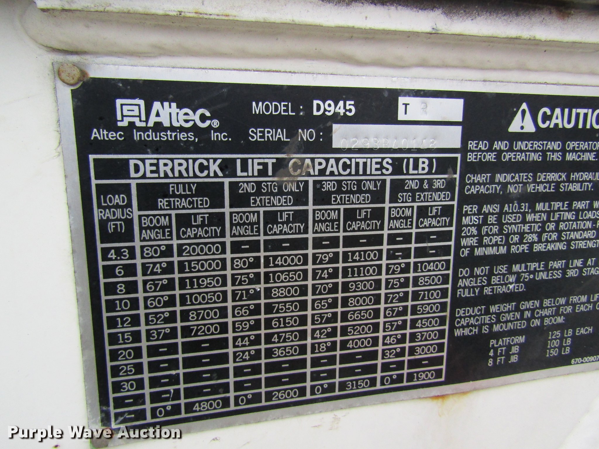 Purple Wave is selling a used Bucket Truck in Missouri. This item is a 1993 Ford F700 digger derrick truck with the following: 46,384 miles on odometer, 85,301 hours on meter, 7.0L V8 gas engine, Five speed manual transmission, Two speed rear end, Single axle, Heat, AM/FM, Suspension seat, Front tow hooks, PTO, Altec D945 service bed, 13'L, Winch, Serial 37-63813, Altec D945 digger derrick, 20,000 lbs max lift capacity, 45' max lift height, Ground boom controls, Boom rotation, Telescopic boom, 18" diameter auger, Rope material handler, Outriggers, Serial 0293RA0148, Pintle hitch, Trailer wiring, Spring suspension, Hydraulic brakes, 10.00-20 tires, View dielectric test, 06/2017, Unit# 8