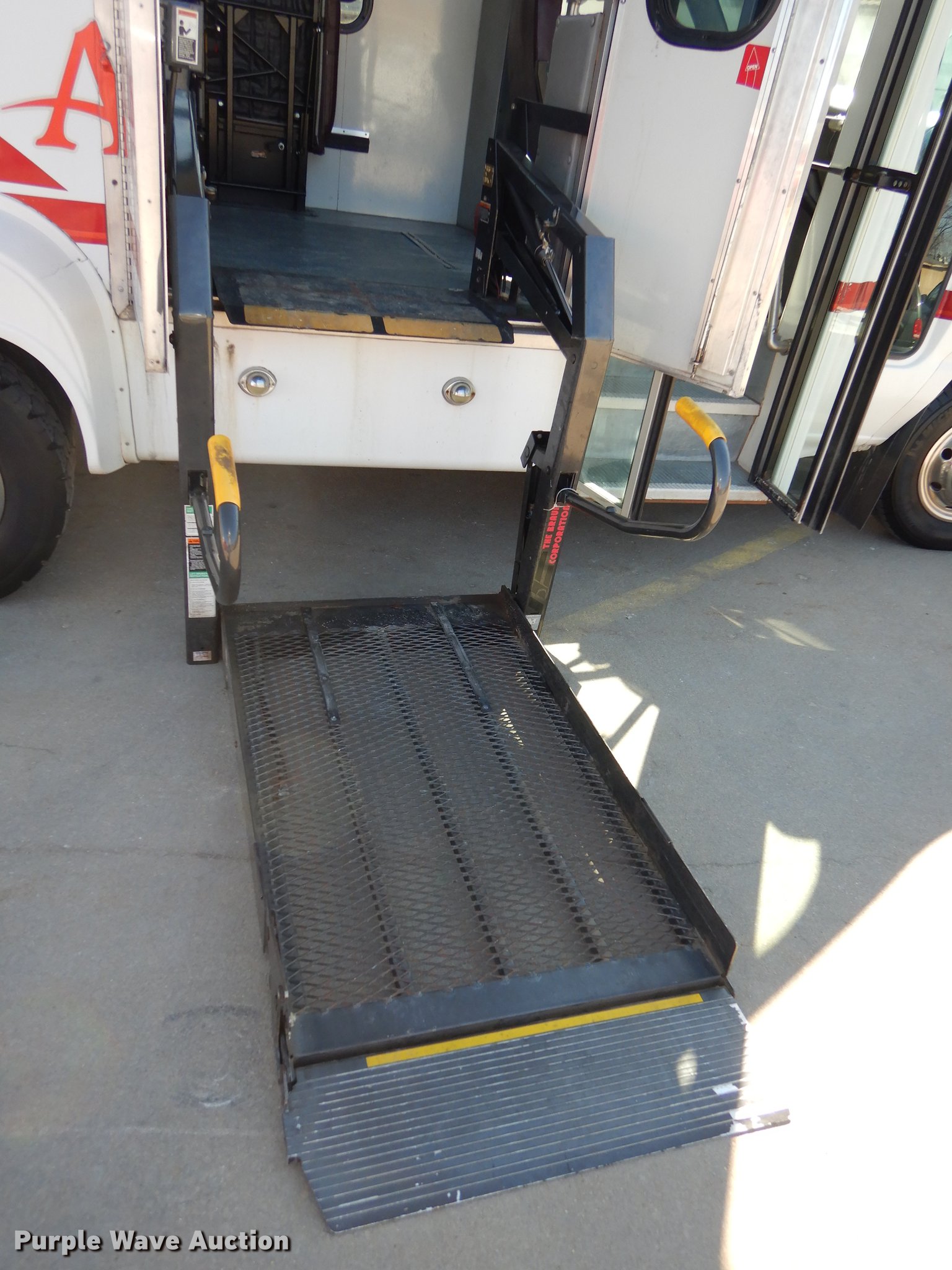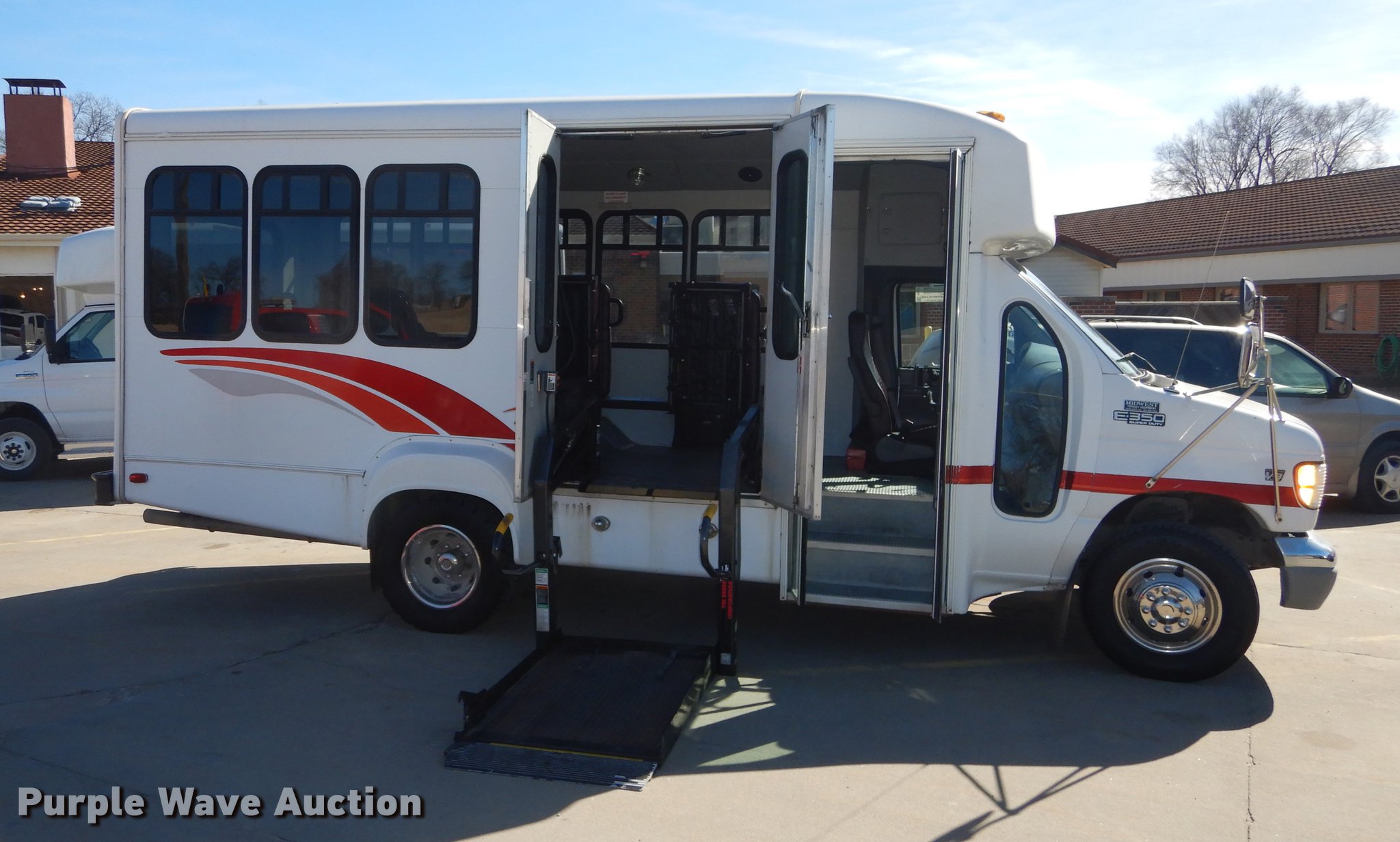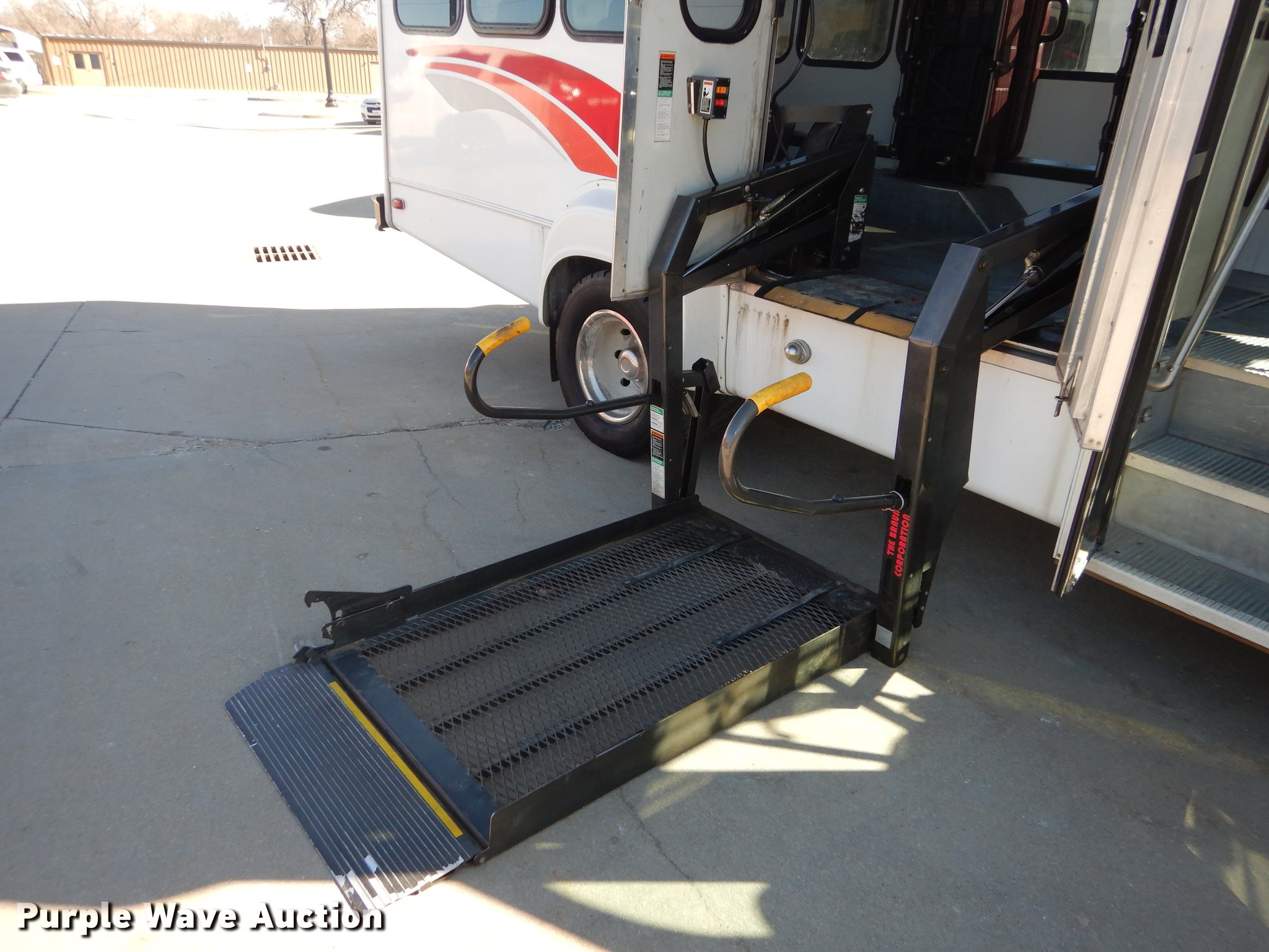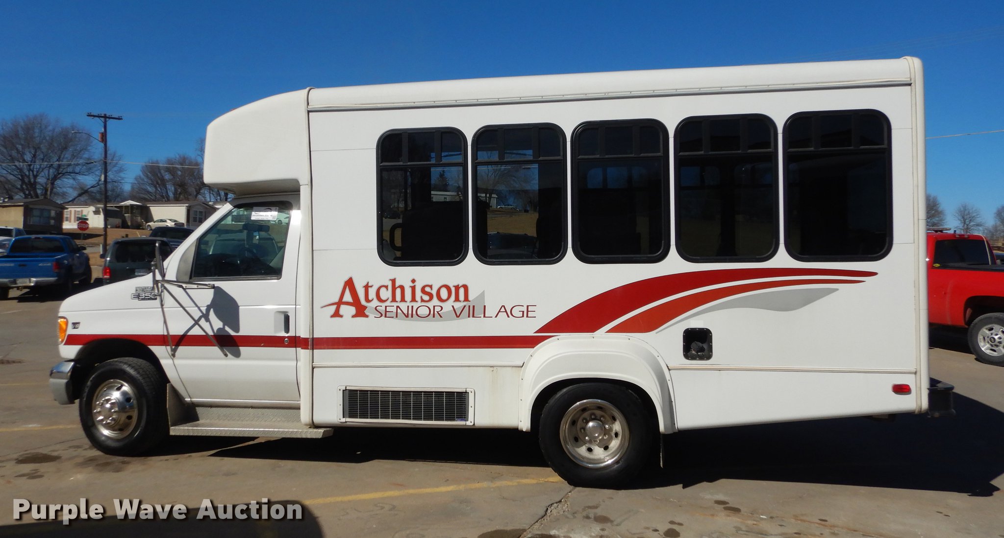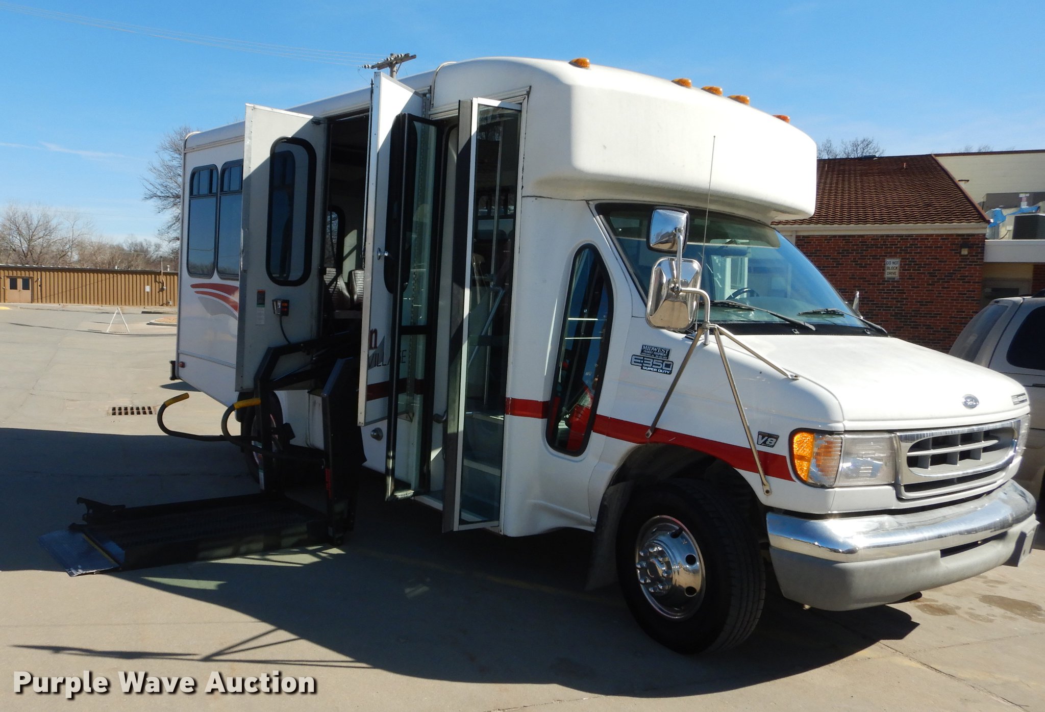 Purple Wave is selling a used Bus in Kansas. This item is a 2000 Ford Econoline E350 Super Duty Goshen Coach shuttle bus with the following: 96,942 miles on odometer, 7.3L V8 OHV 16V turbo diesel engine, Automatic transmission, Single axle, AC and heat, AM/FM/CD, Rear AC, Vinyl interior, Nine passenger capacity, Seat belts, Braun L915 wheelchair lift, Serial A107022214C8, (2) wheelchair tie down areas, Rear and side emergency exits, Carrier roof AC units, Receiver hitch, Spring suspension, Hydraulic brakes, 144" wheelbase, 225/75R16 tires, GVWR 10,700 lbs, Drivers seat torn, Decals will be removed prior to auction