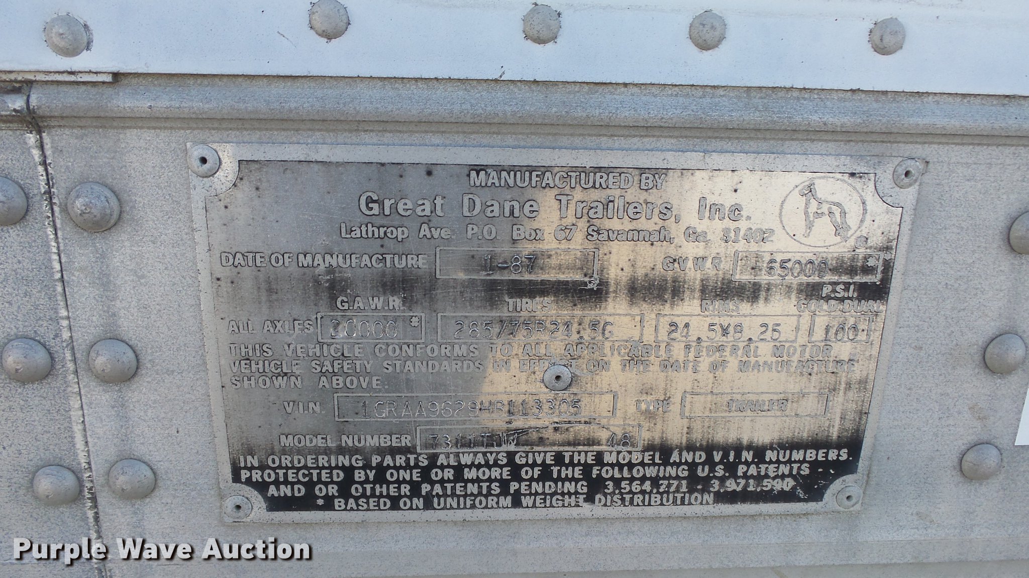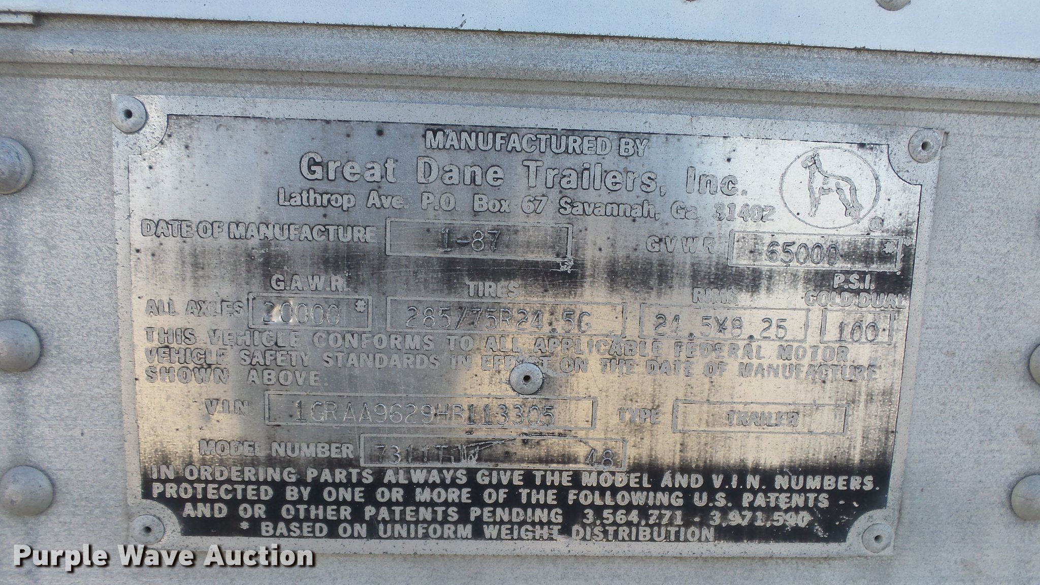 Purple Wave is selling a used Dry Van Trailer in Kansas. This item is a 1987 Great Dane 7311TJW-48 dry van trailer with the following: 48'L x 8'W, Wood floor, Rear swing-out doors, One door missing, Tandem axle, Spring suspension, Air brakes, 295/75R22.5 tires, GVWR 65,000 lbs