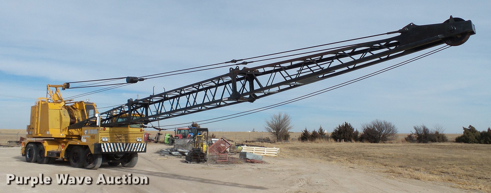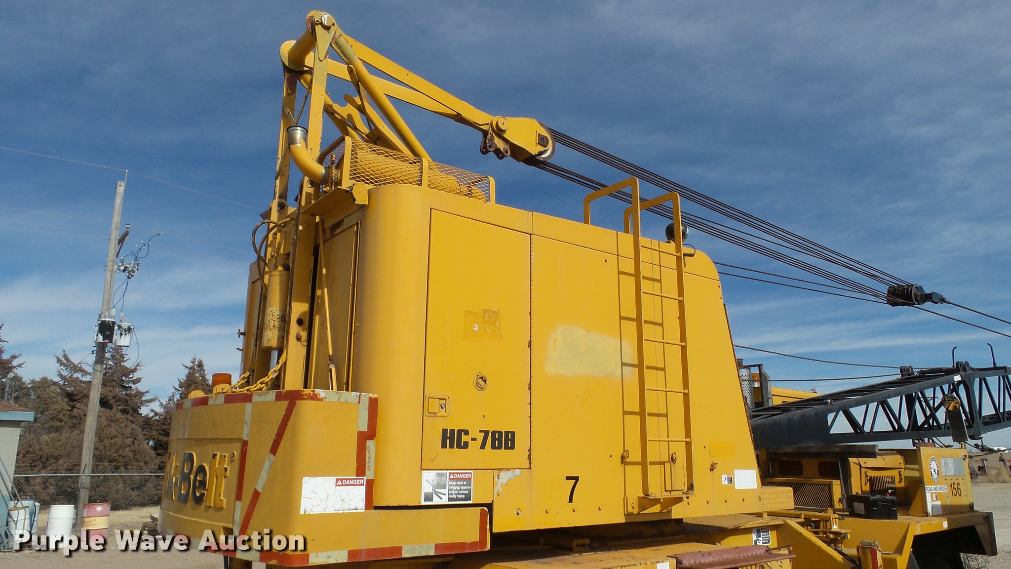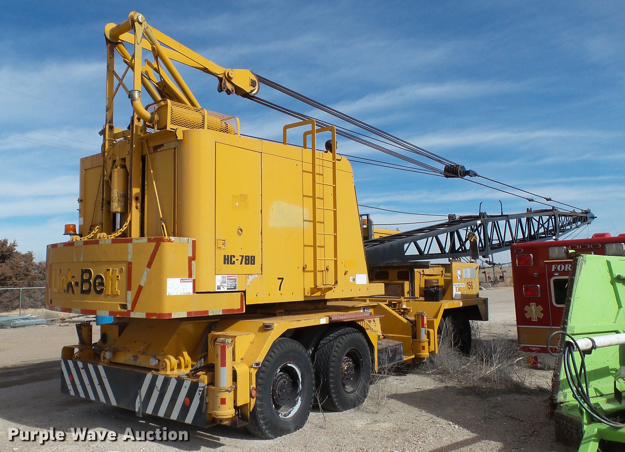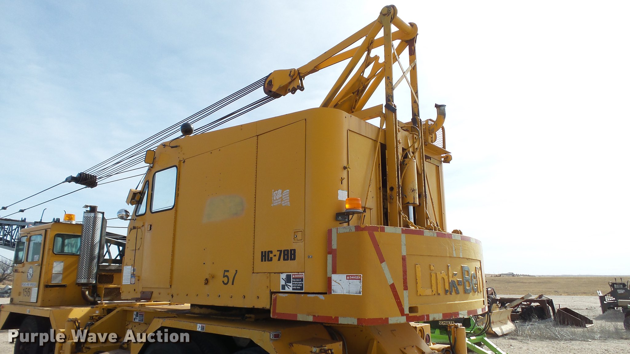 Purple Wave is selling a used Truck Crane in Kansas. This item is a 1991 Link Belt HC-78B crane with the following: 2,765 miles on odometer, Eight cylinder turbo diesel lower engine, Model 40877300, Serial 0860238714, Caterpillar 3304B four cylinder diesel upper engine, Serial 10E03597, Nine speed manual transmission, Tandem axle, Five stick crane controls, In-cab boom controls, Suspension seat, Work lights, Lattice boom, Approx. 61' boom length, Three boom sections, 35 ton max lift capacity, Removable counterweights, (2) winches, Two sheave crane block, (2) MCO 38"W buckets, 34"W drag bucket, (2) concrete buckets, (2) 16" diameter drivers, (2) 10'L crane boom extensions, (4) stabilizers, (2) pallets of assorted parts, Walking beam suspension, Air brakes, 12.00-20 tires, Cracked window, Dead batteries, Unit has not been used in approx. six years, Unknown operating condition, Serial 8HI1-480, Unit# 156