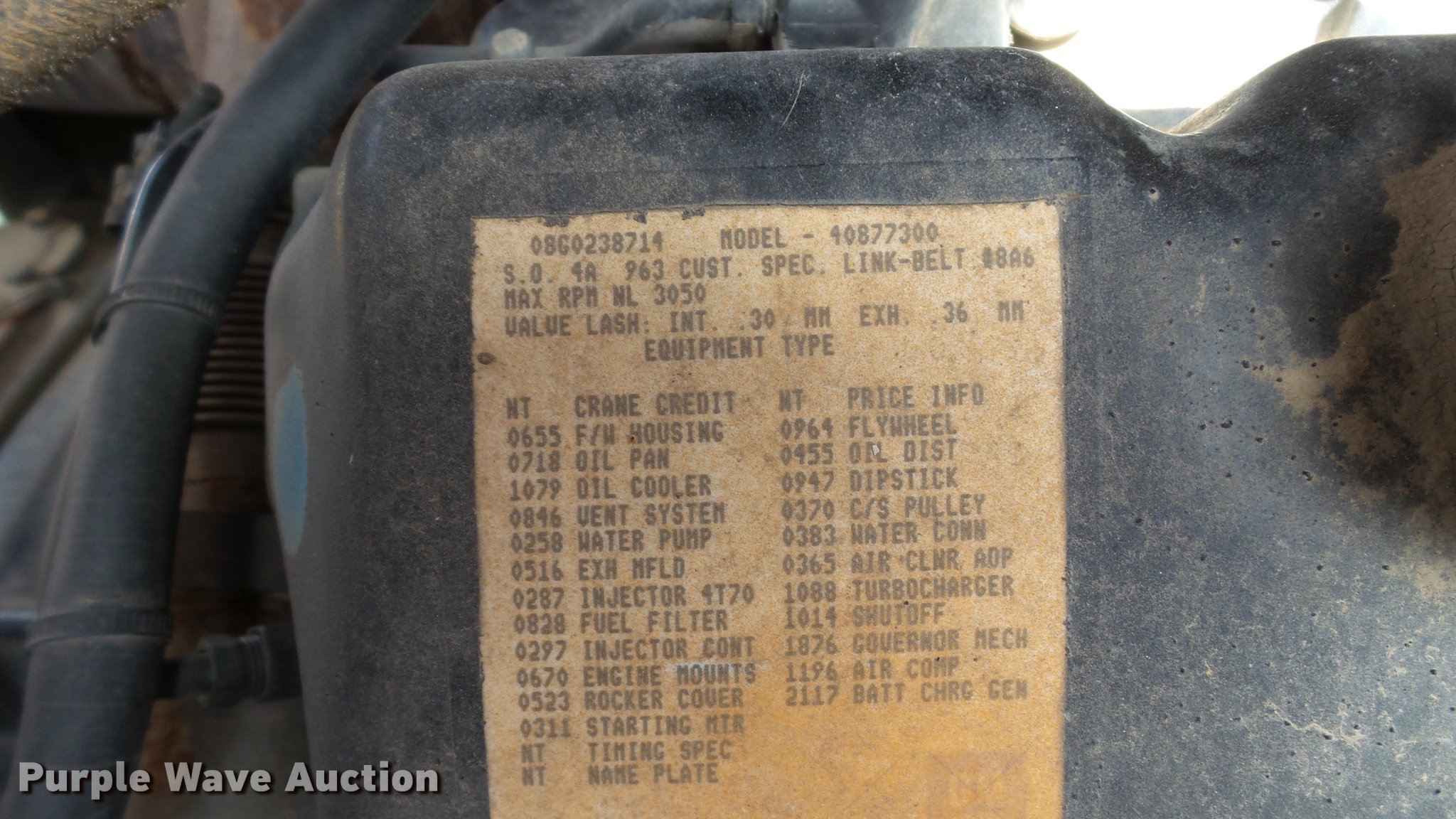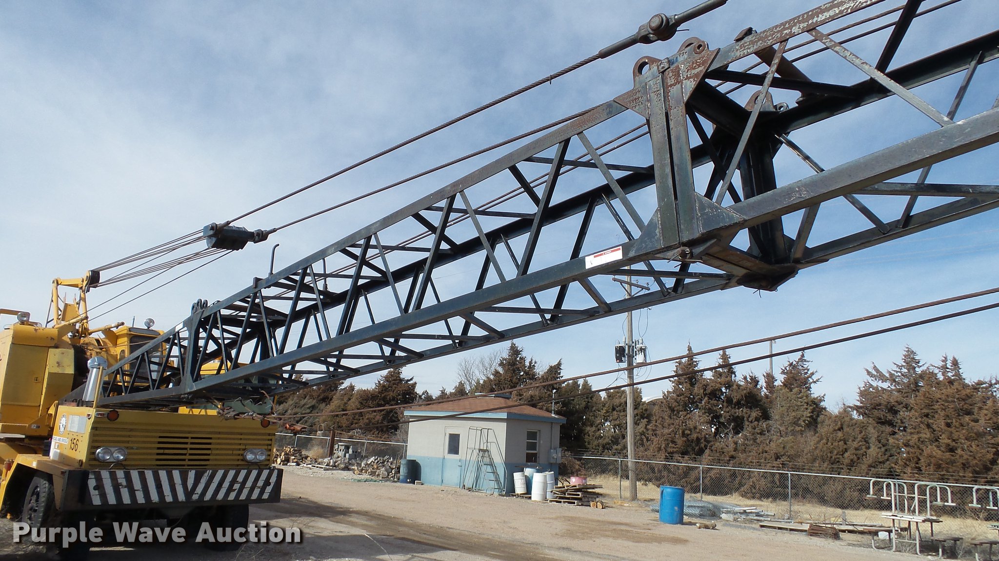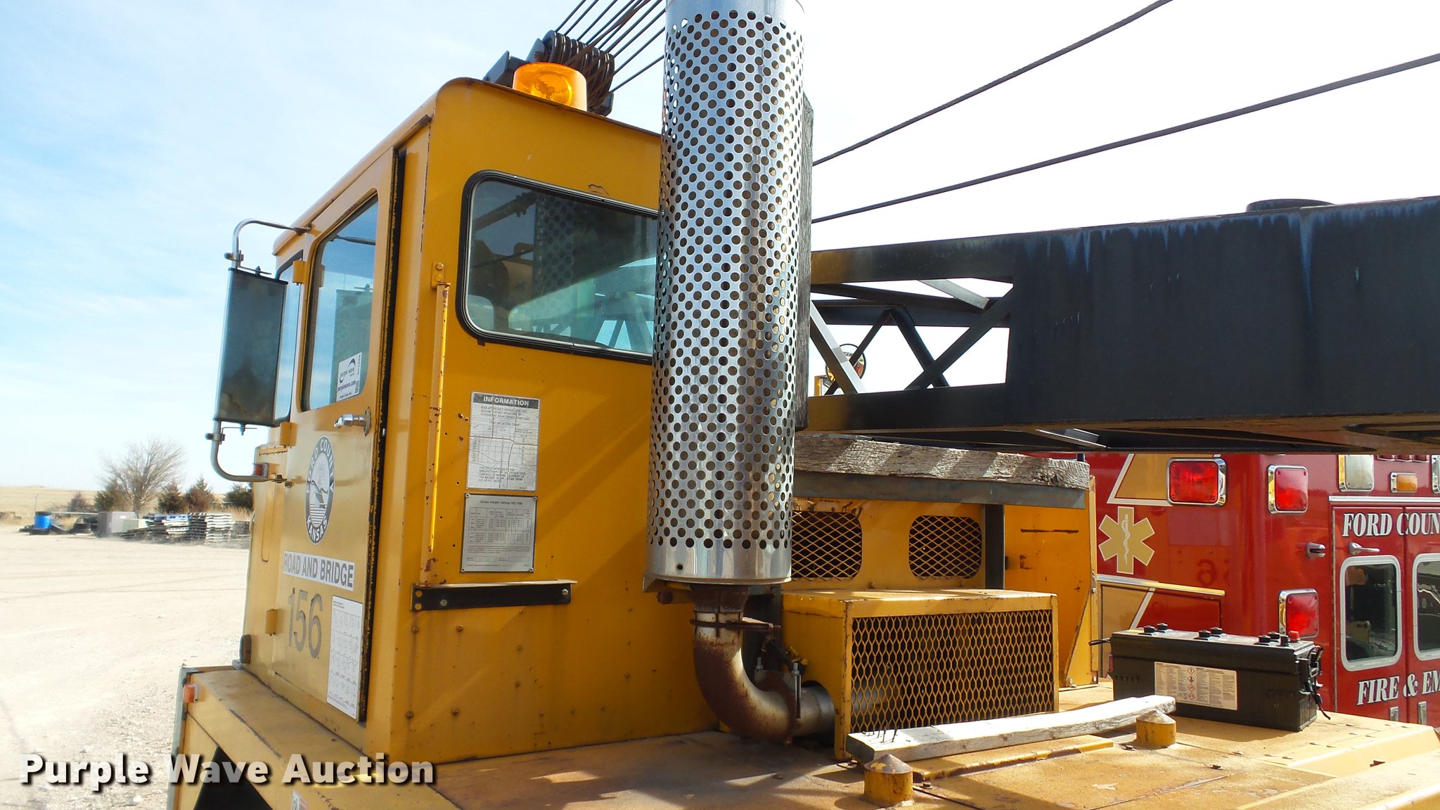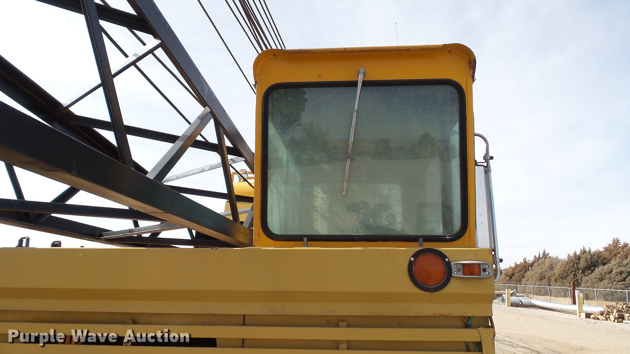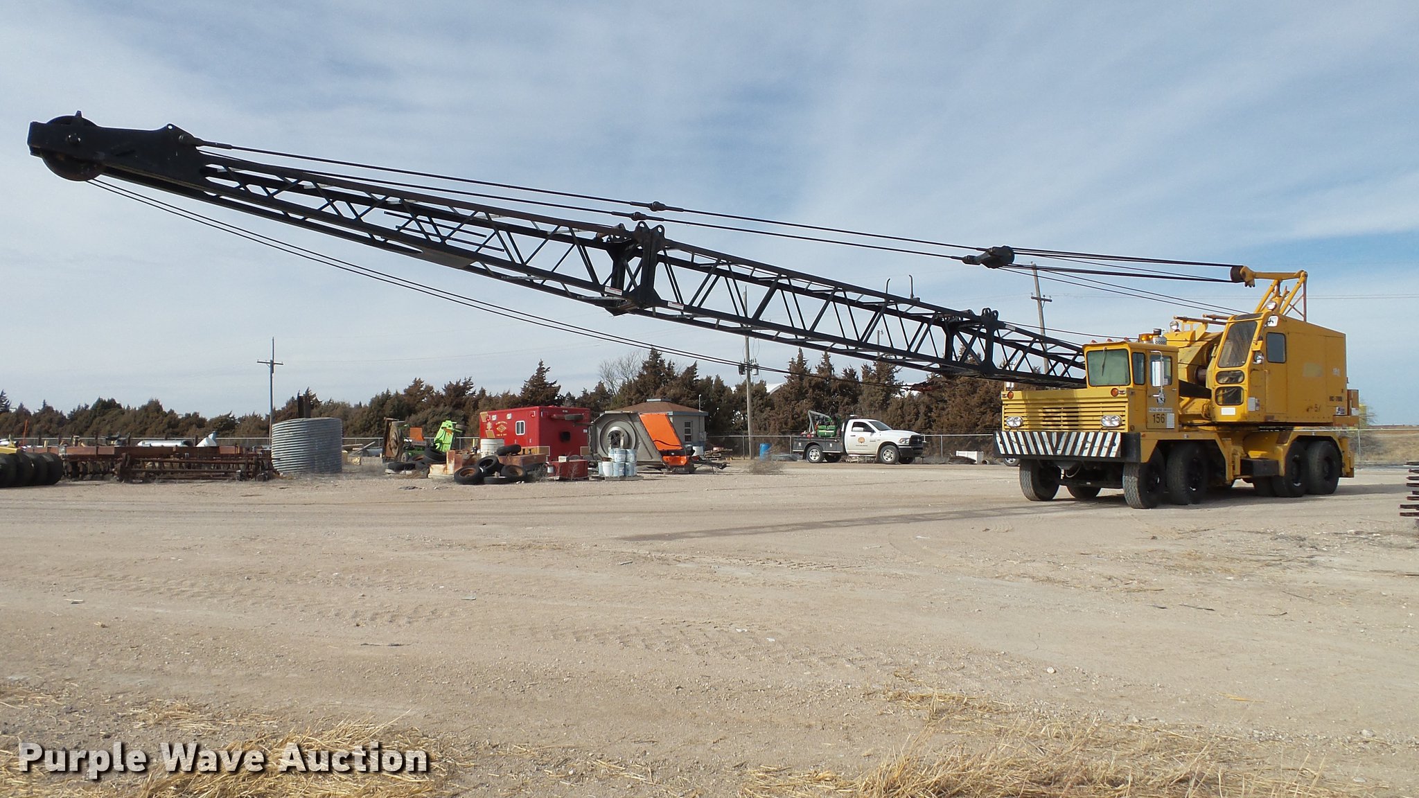 Purple Wave is selling a used Truck Crane in Kansas. This item is a 1991 Link Belt HC-78B crane with the following: 2,765 miles on odometer, Eight cylinder turbo diesel lower engine, Model 40877300, Serial 0860238714, Caterpillar 3304B four cylinder diesel upper engine, Serial 10E03597, Nine speed manual transmission, Tandem axle, Five stick crane controls, In-cab boom controls, Suspension seat, Work lights, Lattice boom, Approx. 61' boom length, Three boom sections, 35 ton max lift capacity, Removable counterweights, (2) winches, Two sheave crane block, (2) MCO 38"W buckets, 34"W drag bucket, (2) concrete buckets, (2) 16" diameter drivers, (2) 10'L crane boom extensions, (4) stabilizers, (2) pallets of assorted parts, Walking beam suspension, Air brakes, 12.00-20 tires, Cracked window, Dead batteries, Unit has not been used in approx. six years, Unknown operating condition, Serial 8HI1-480, Unit# 156