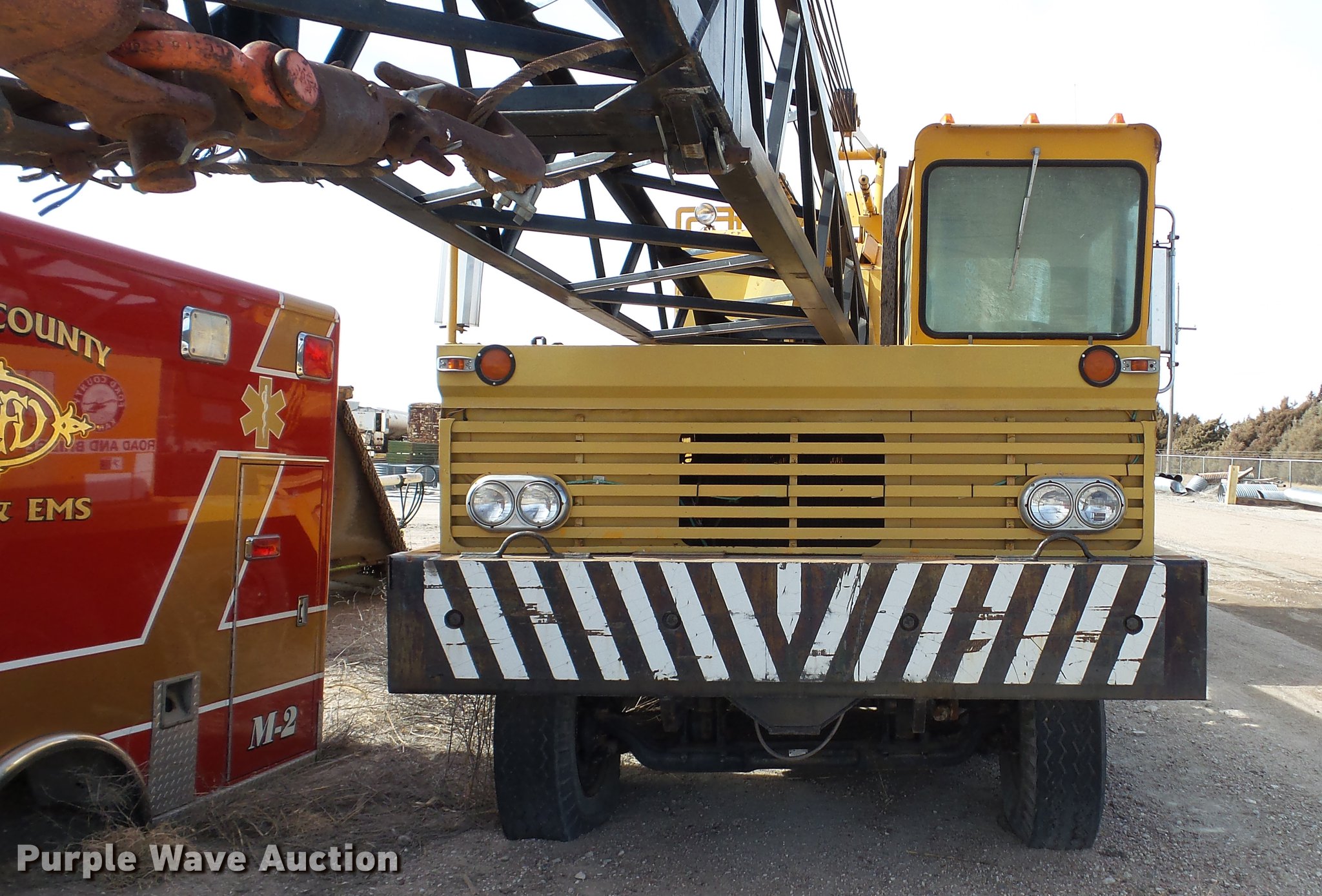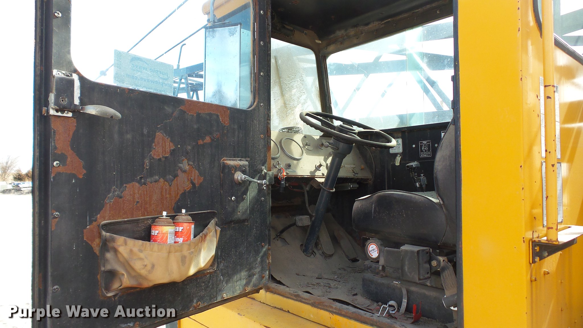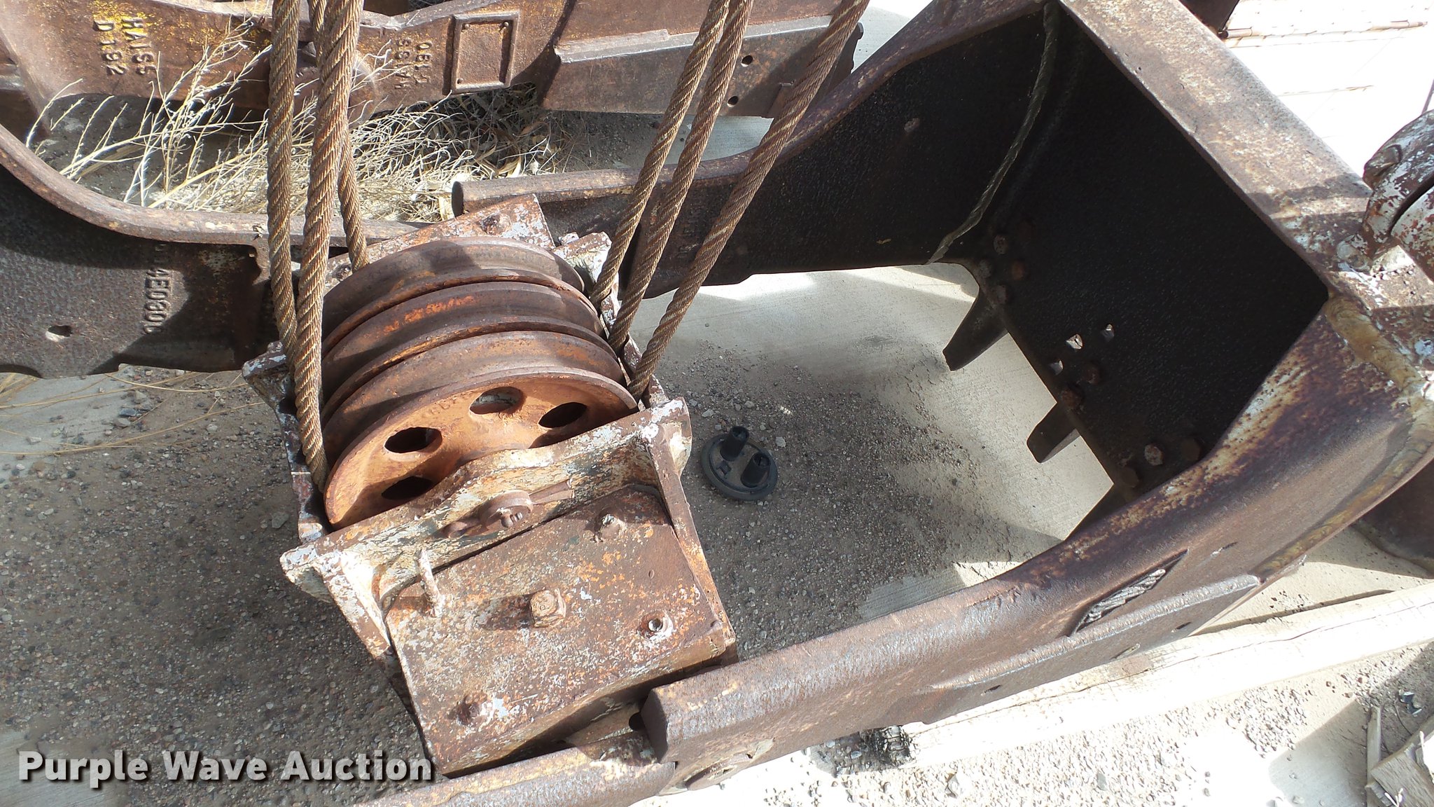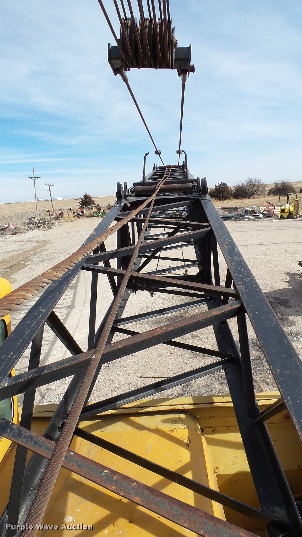 Purple Wave is selling a used Truck Crane in Kansas. This item is a 1991 Link Belt HC-78B crane with the following: 2,765 miles on odometer, Eight cylinder turbo diesel lower engine, Model 40877300, Serial 0860238714, Caterpillar 3304B four cylinder diesel upper engine, Serial 10E03597, Nine speed manual transmission, Tandem axle, Five stick crane controls, In-cab boom controls, Suspension seat, Work lights, Lattice boom, Approx. 61' boom length, Three boom sections, 35 ton max lift capacity, Removable counterweights, (2) winches, Two sheave crane block, (2) MCO 38"W buckets, 34"W drag bucket, (2) concrete buckets, (2) 16" diameter drivers, (2) 10'L crane boom extensions, (4) stabilizers, (2) pallets of assorted parts, Walking beam suspension, Air brakes, 12.00-20 tires, Cracked window, Dead batteries, Unit has not been used in approx. six years, Unknown operating condition, Serial 8HI1-480, Unit# 156