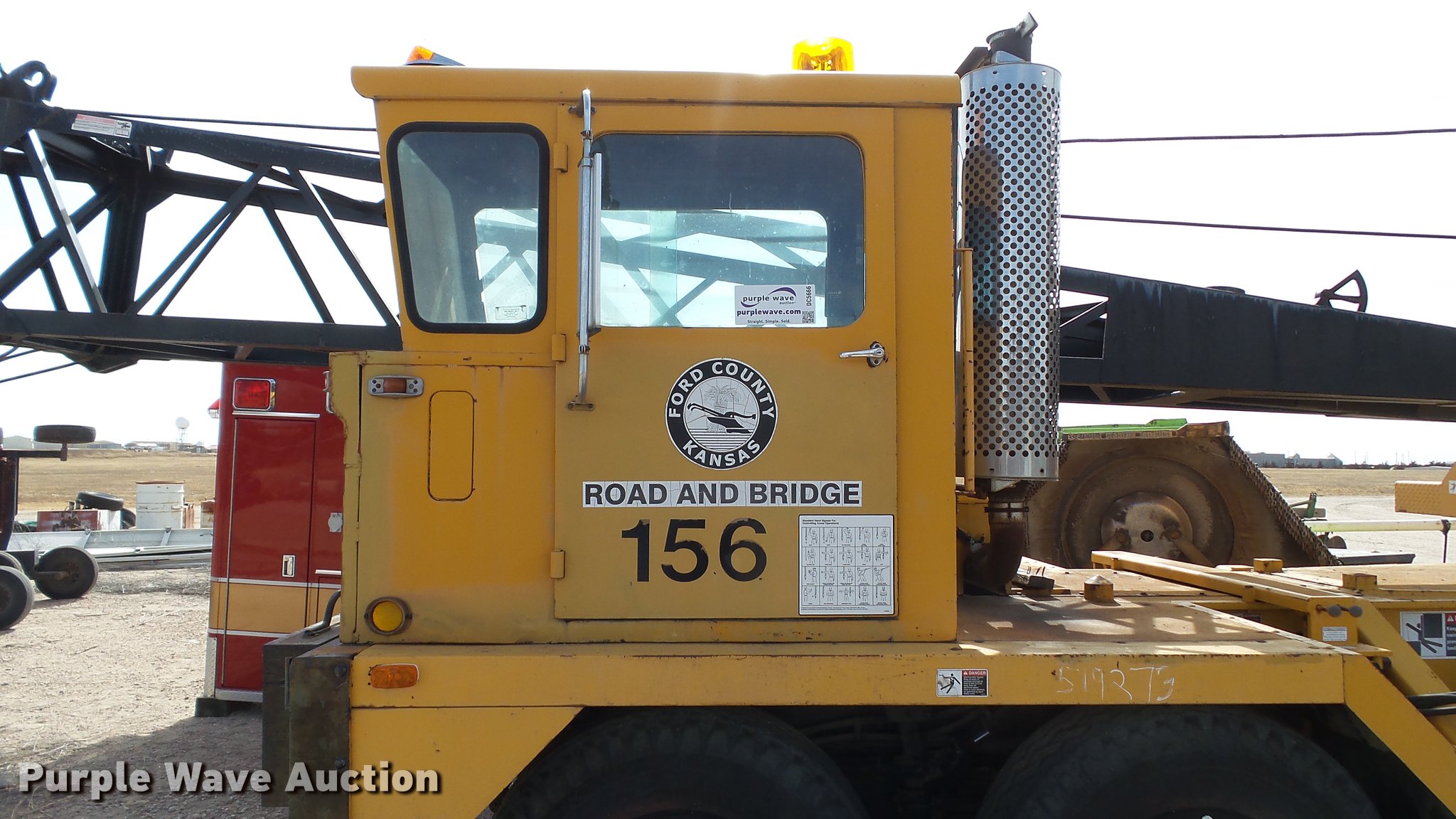 1991 Link Belt HC-78B crane. 2,765 miles on odometer, Eight cylinder turbo diesel lower engine Model 40877300, Serial 0860238714, Caterpillar 3304B four cylinder diesel upper engine Serial 10E03597, Nine speed manual transmission, Tandem axle, Five stick crane controls, In-cab boom controls, Suspension seat, Work lights, Lattice boom Approx. 61' boom length Three boom sections, 35 ton max lift capacity, Removable counterweights, (2) winches, Two sheave crane block, (2) MCO 38"W buckets, 34"W drag bucket, (2) concrete buckets, (2) 16" diameter drivers, (2) 10'L crane boom extensions, (4) stabilizers, (2) pallets of assorted parts, Walking beam suspension, Air brakes, 12.00-20 tires, Cracked window, Dead batteries, Unit has not been used in approx. six years, Unknown operating condition, Serial 8HI1-480, Unit# 156. Ford County. Dodge City, KS 67801
