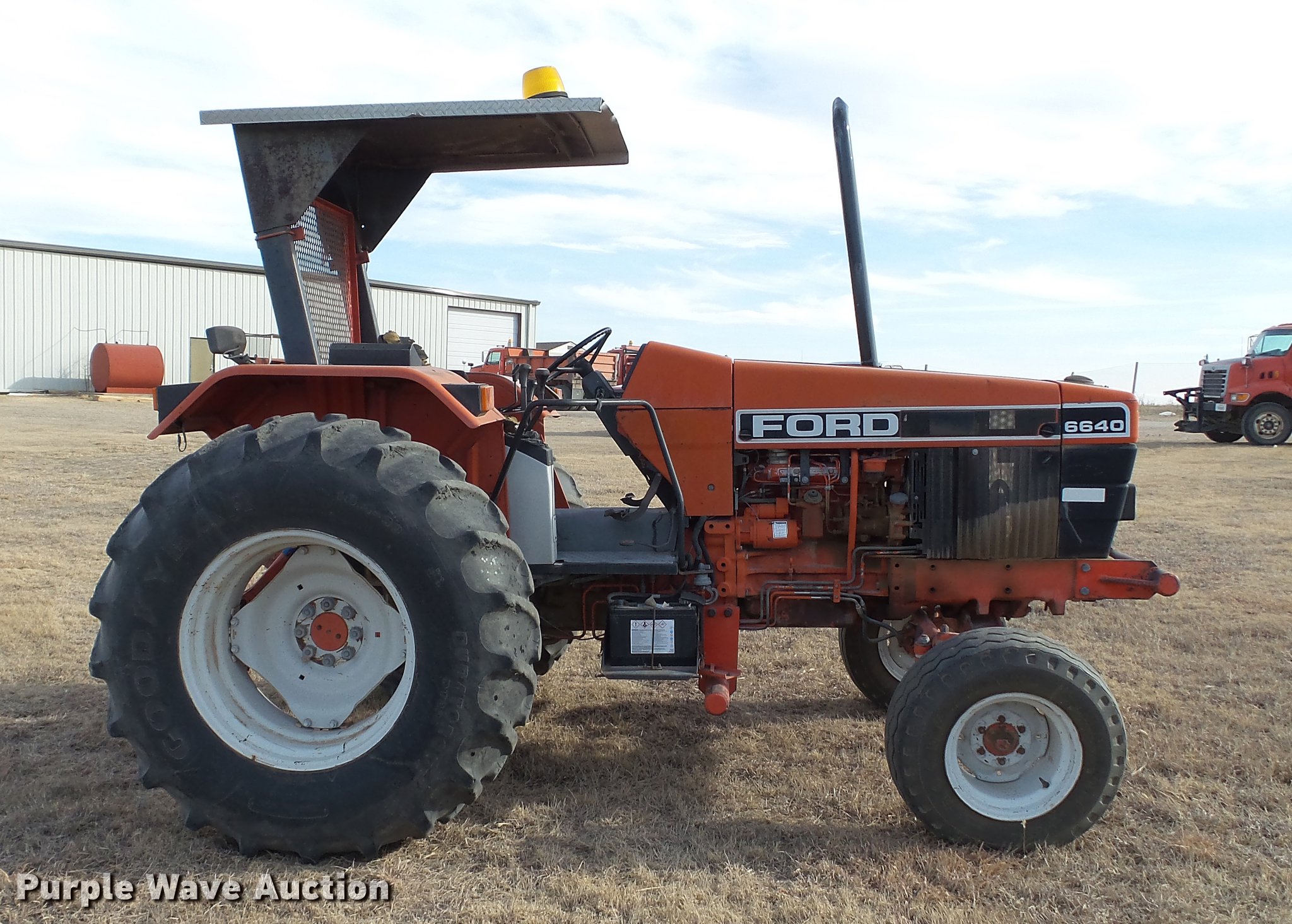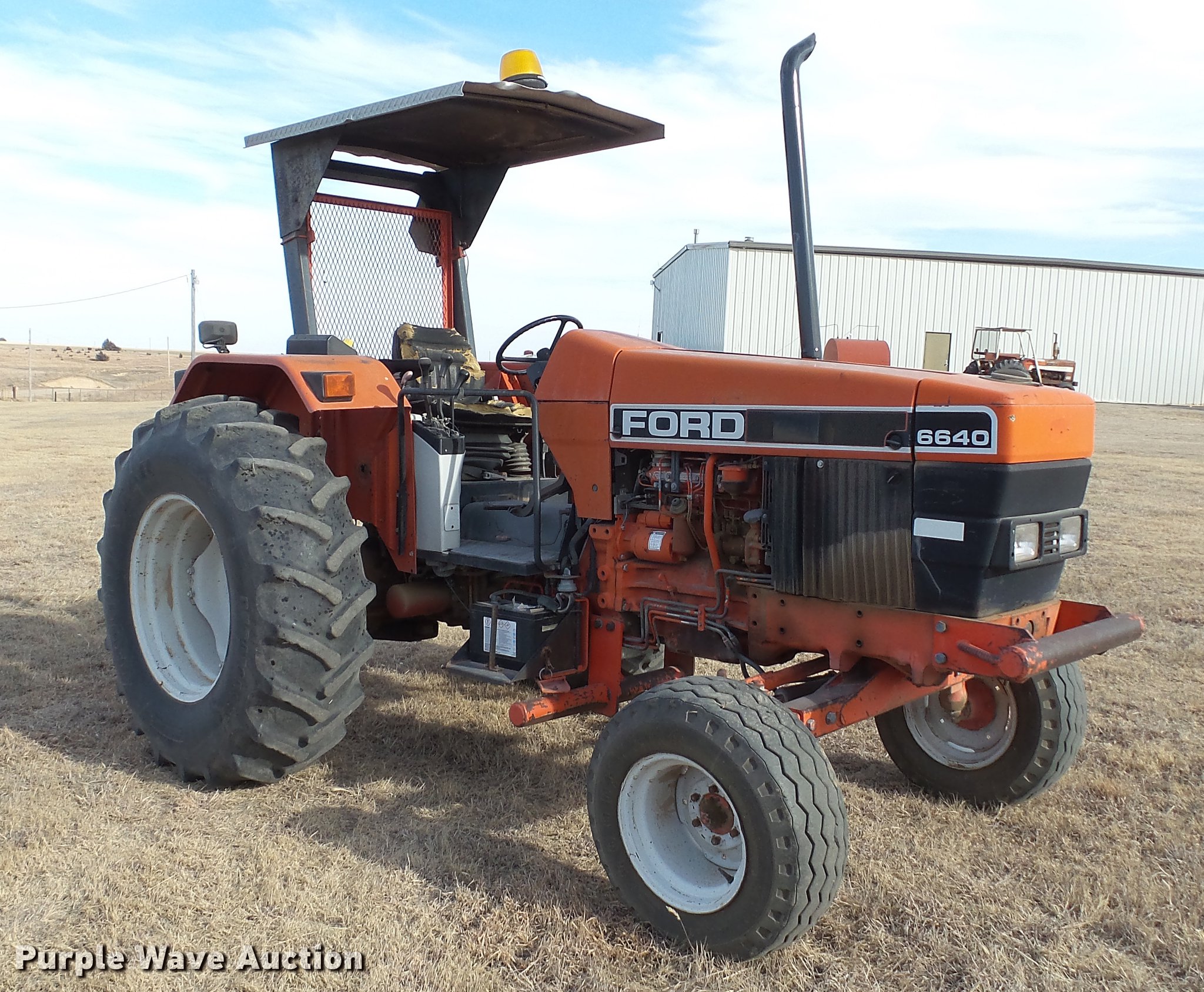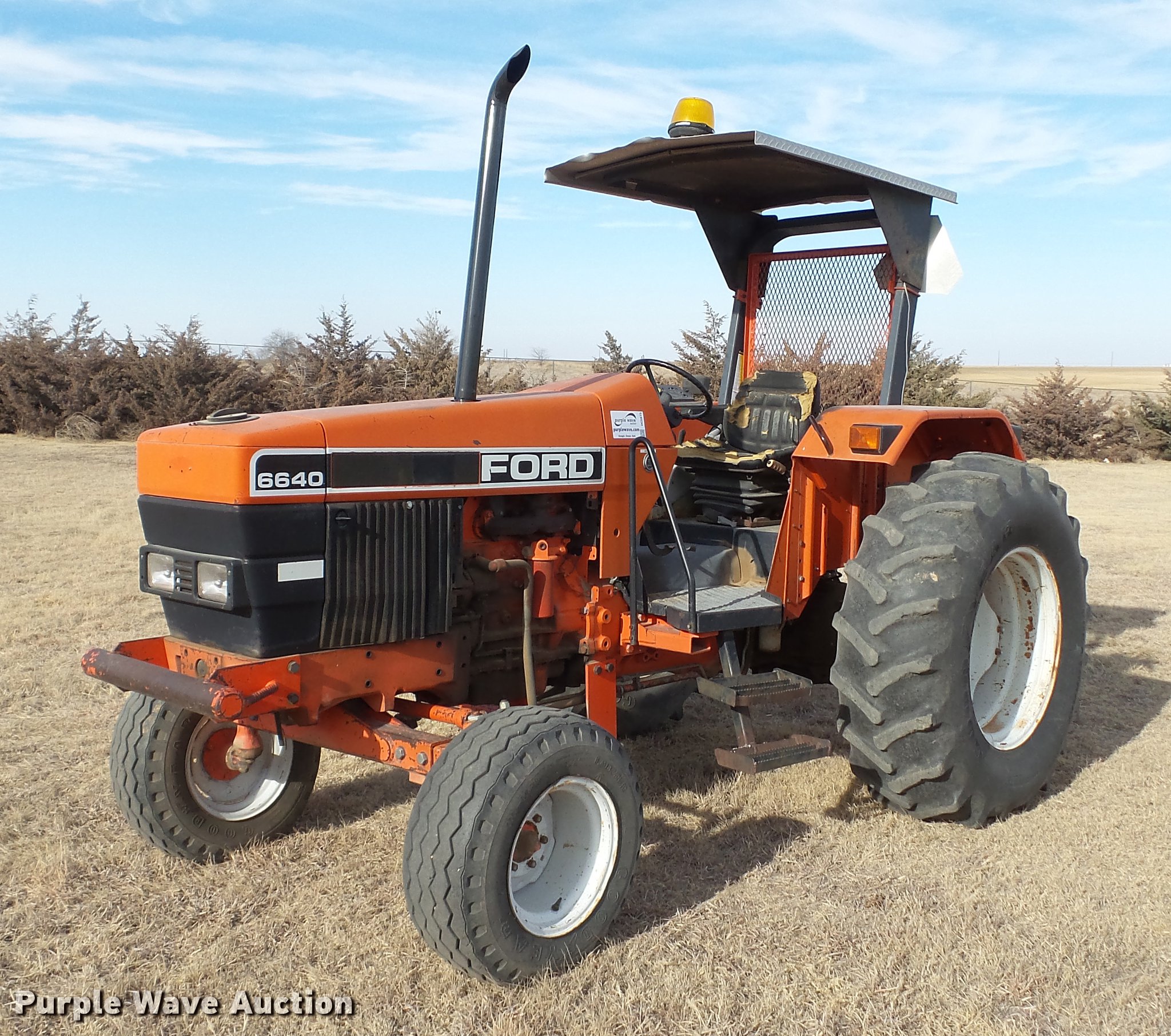 Purple Wave is selling a used Tractor in Kansas. This item is a 1994 Ford 6640 tractor with the following: Approx. 6,780 hours, Ford four cylinder diesel engine, Serial 4926494J02, Powershift transmission, 4F-4R gears, Suspension seat, Shade, Beacon light, 540 PTO, (4) rear hydraulic remote sets, 11L-16 front tires, 18.4-30 rear tires, Serial BD88645