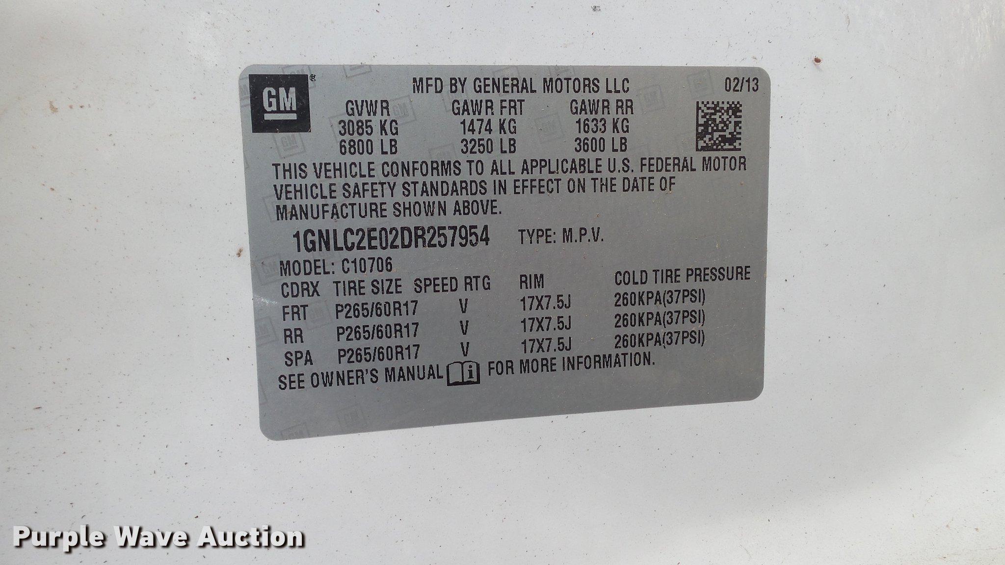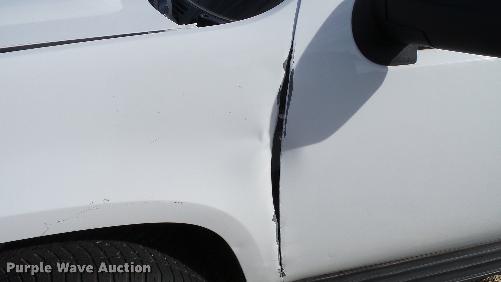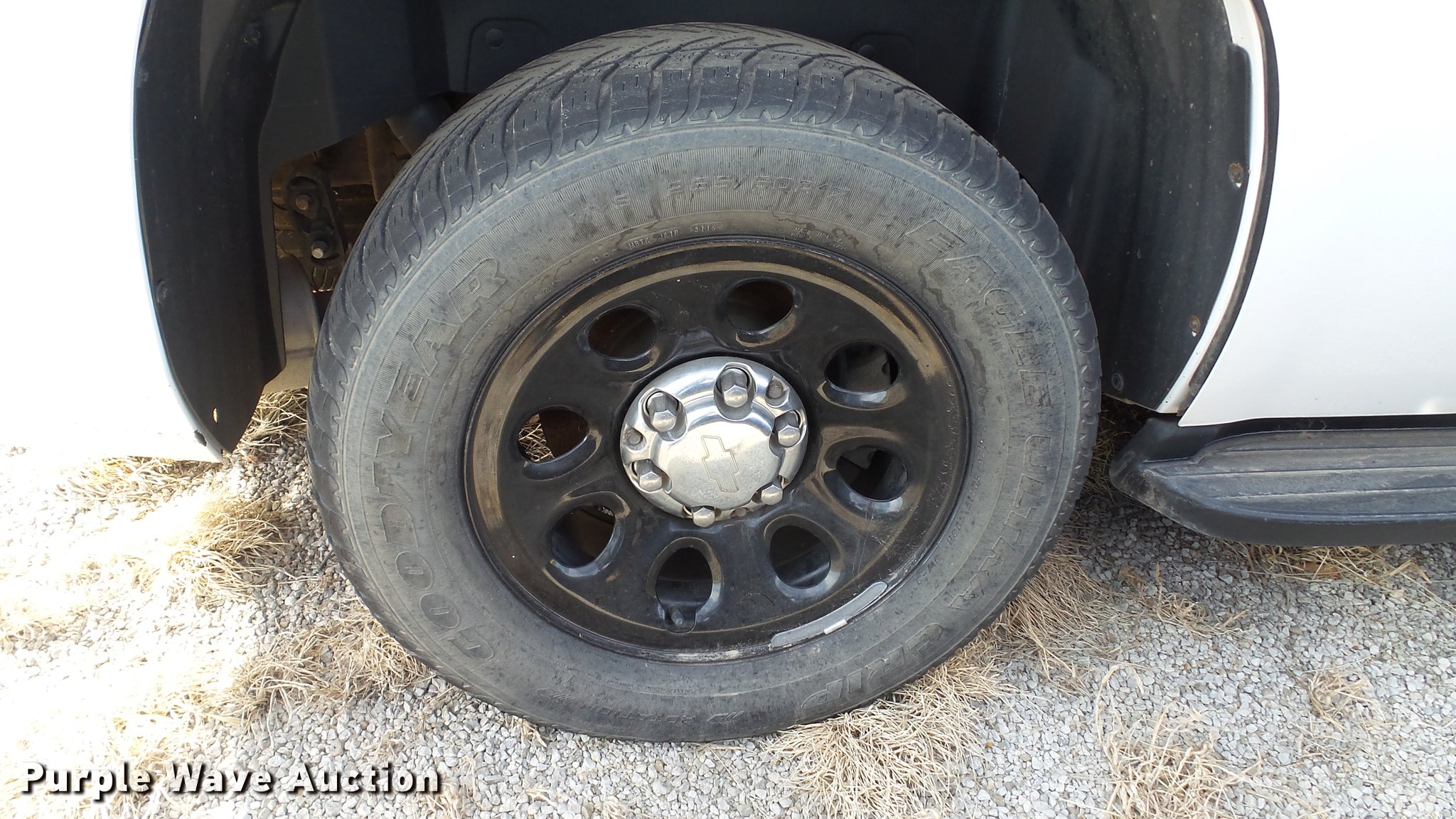 Purple Wave is selling a used Passenger Vehicle in Kansas. This item is a 2013 Chevrolet Tahoe Police SUV with the following: Unknown miles on odometer, 5.3L V8 OHV 16V FFV gas engine, Automatic transmission, AC and heat, Tilt, Cruise, AM/FM/CD, Power windows, locks, and mirrors, Cloth interior, 255/60R17 tires, Non-operational engine, Windows are not rolled up completely, Hail damage, Flat tires