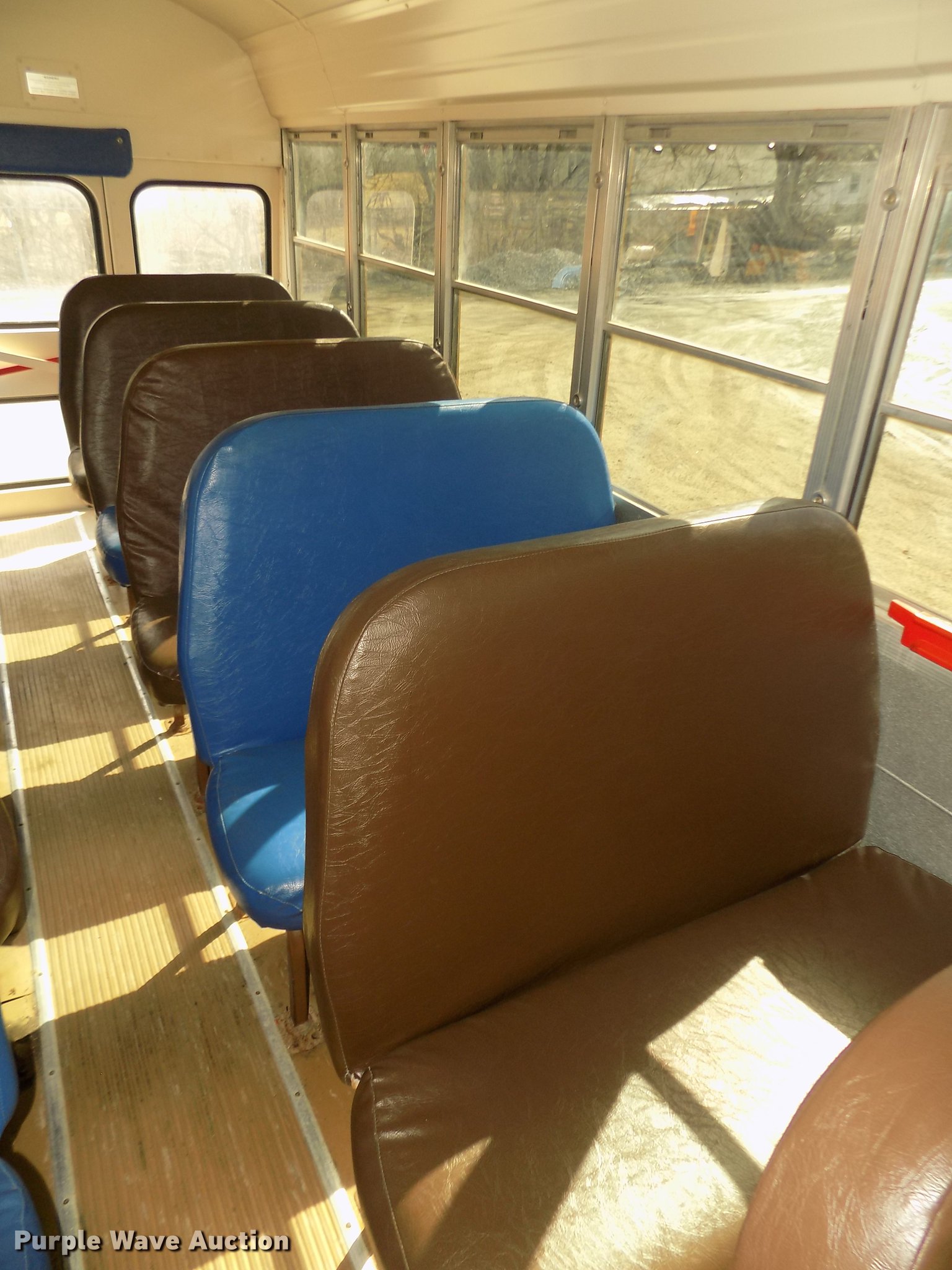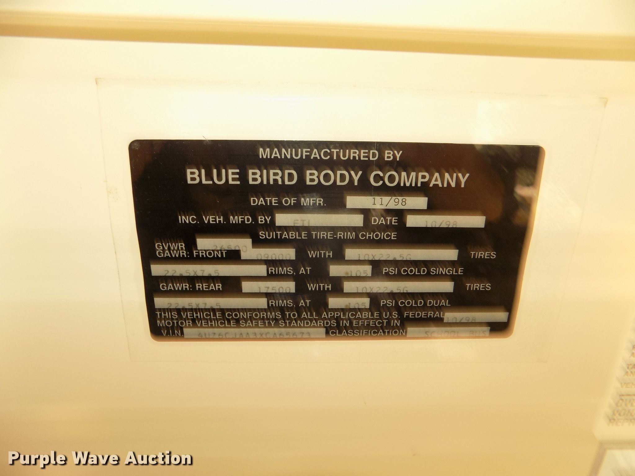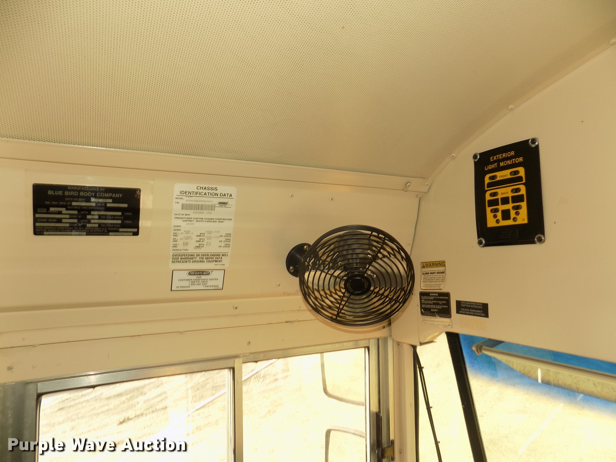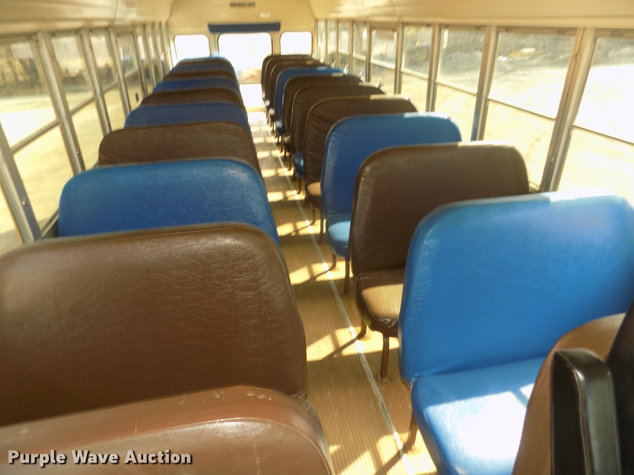 Purple Wave is selling a used Bus in Iowa. This item is a 1999 Freightliner FS65 Blue Bird school bus with the following: 42,620 miles on odometer, 4,114 hours on meter, Miles and hours may vary, still in use, Caterpillar 3126 7.2L L6 turbo diesel engine, Serial 7AS32946, Automatic transmission, Single axle, Heat, AM/FM/cassette, Air suspension seat, Power door, 60 passenger capacity, (20) adult seats, Ceiling, front, rear, and side emergency exits, Lighted stop sign, Exterior light monitor, First-aid kits, Fire extinguisher, Recirculating fans, Backup alarm, Blue Bird body no. M88208, Serial 10009880, Front and rear tow hooks, Air suspension, Air brakes, 10R22.5 tires, GVWR 26,500 lbs, FAWR 9,000 lbs, RAWR 17,500 lbs, CB radio not included, Owners manual, Unit# 6