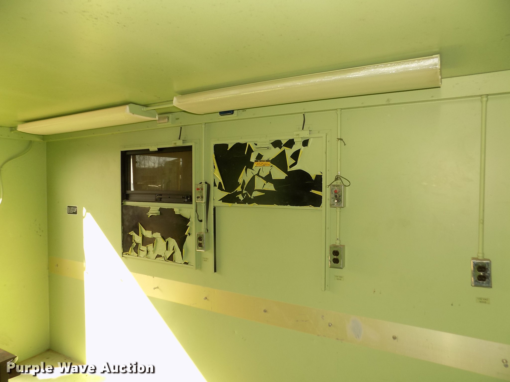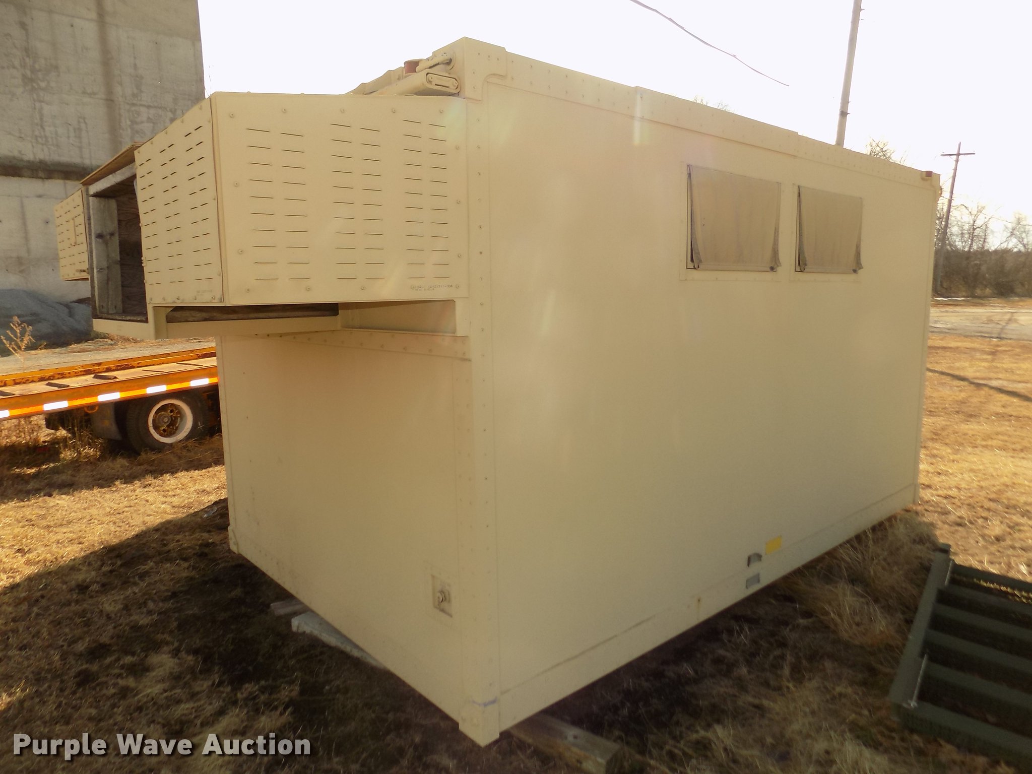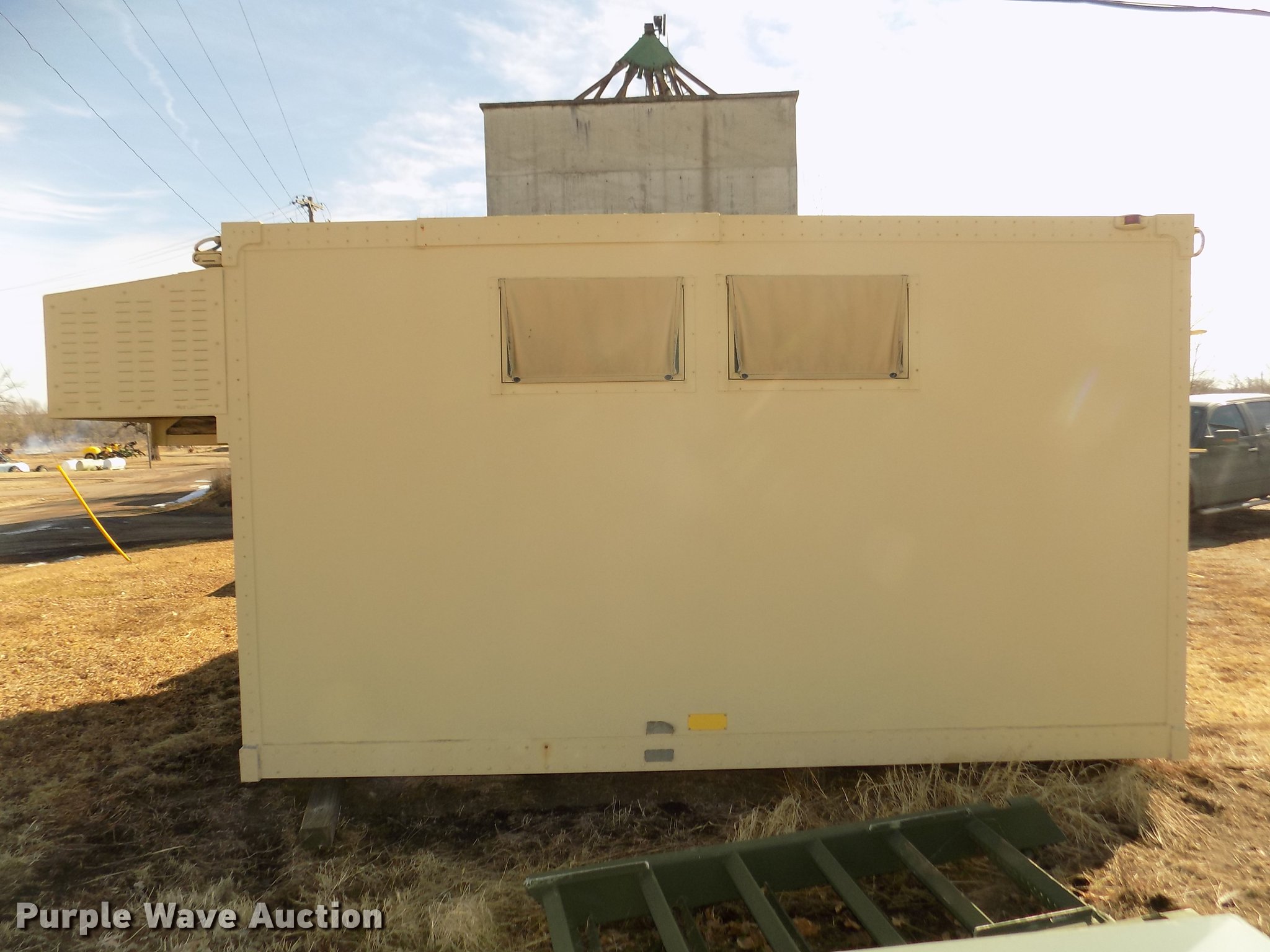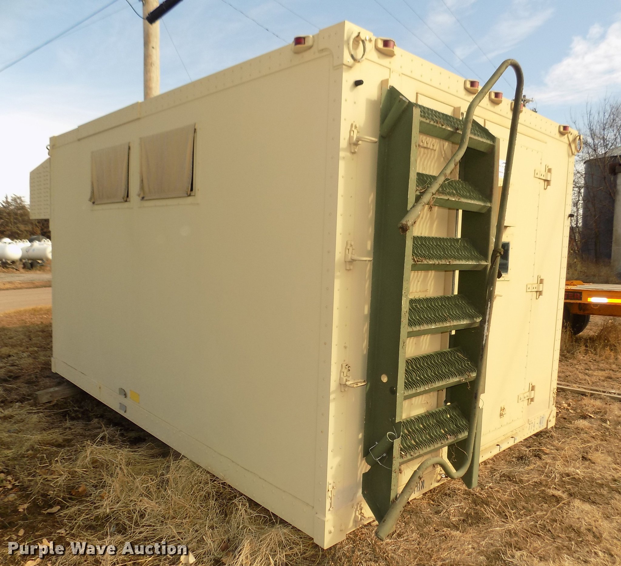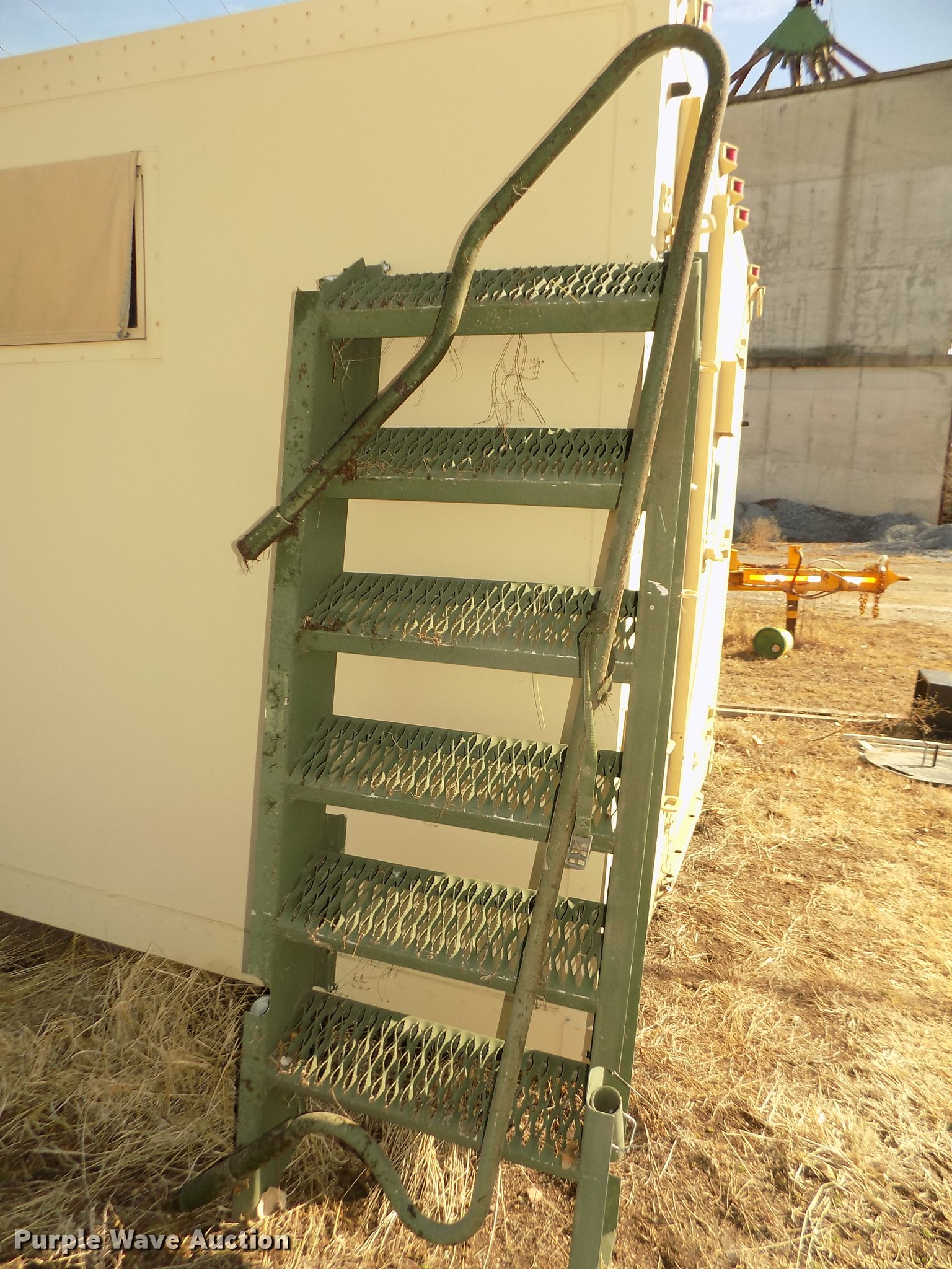 Purple Wave is selling a used Building Materials in Nebraska. This item is a 1999 office building with the following: 12'L x 90"W x 79.5"H I.D., 14'9"L, 12'5"L x 95"W x 89"D main unit, 28"W six step platform, 24"W x 7"D I.D. steps, Handrail,, Pop-out windows with covers, Interior/exterior window covers, Fluorescent lighting, Electrical outlets, Electrical connections, Steps for roof access, Stove not included, 17,722 lbs empty weight, Serial 2510-01-453-8949