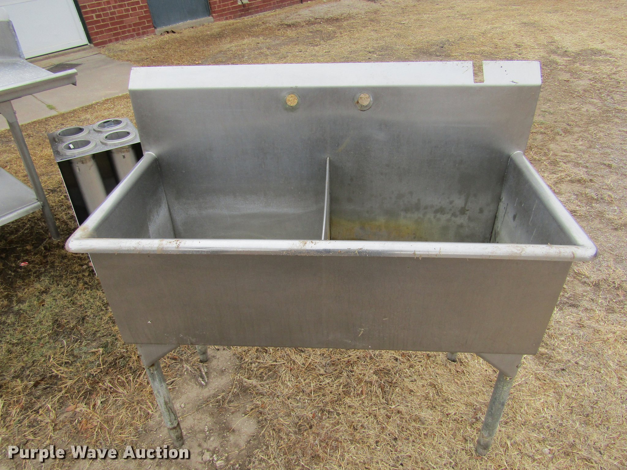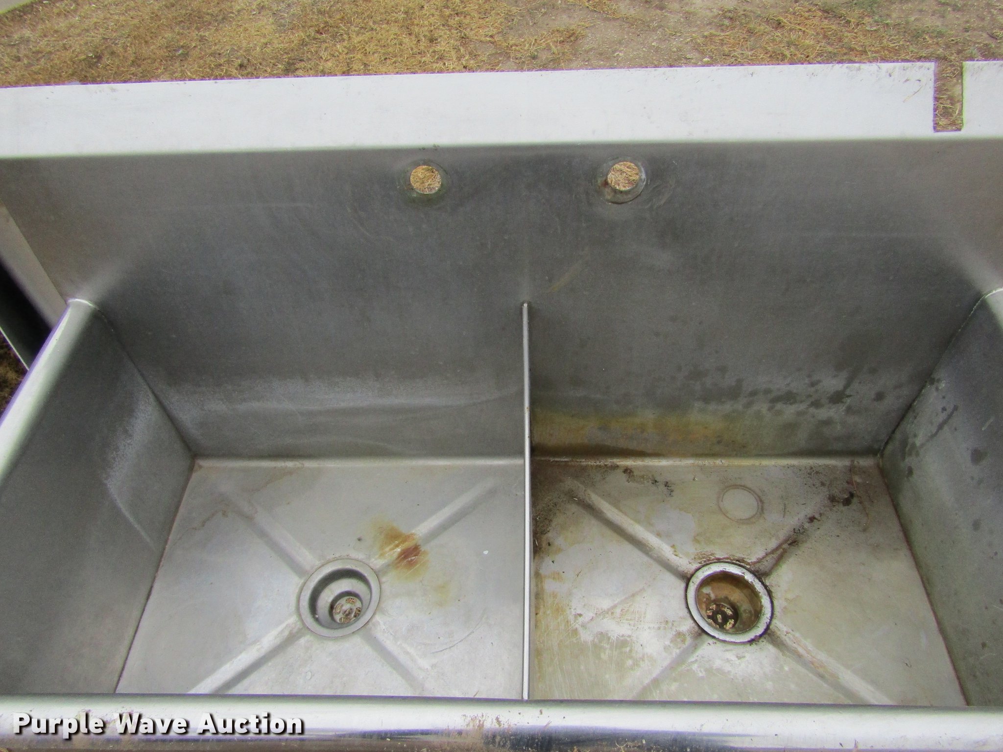 Purple Wave is selling a used Restaurant Equip. in Kansas. This item is a (2) serving islands with the following: Four burners, Stainless steel double sink, (2) stainless steel prep tables, Stainless steel cup dispenser