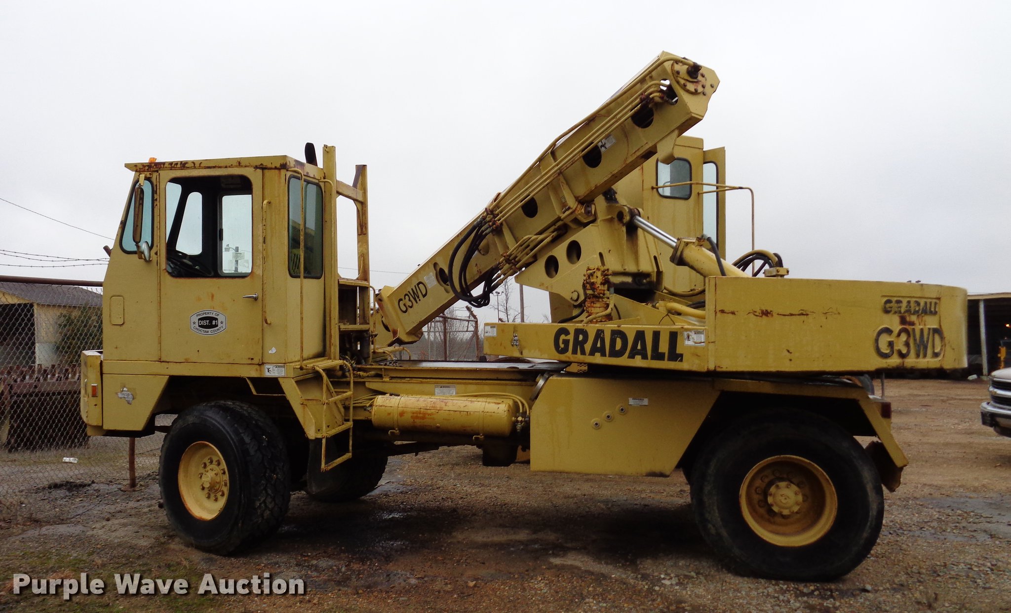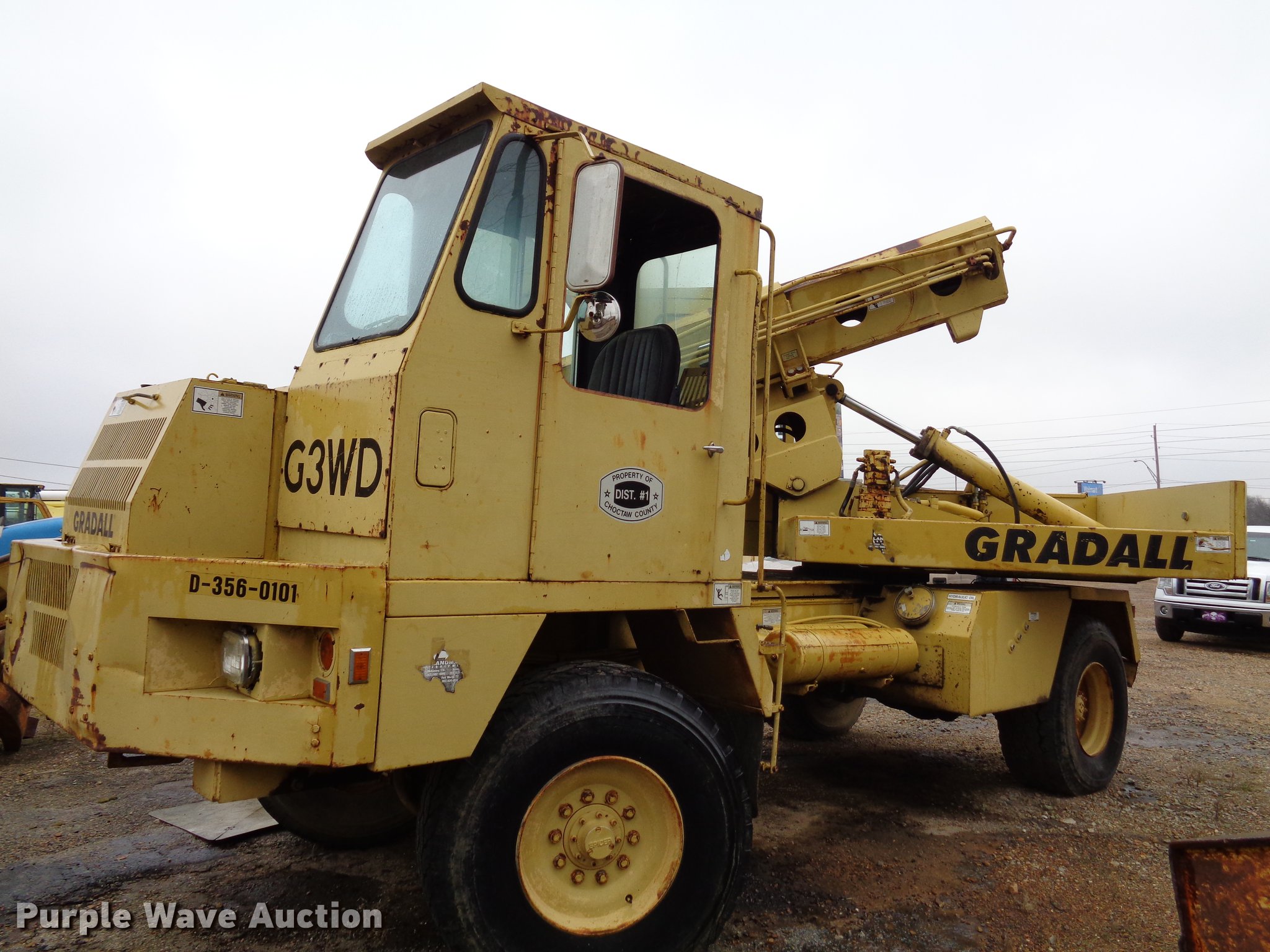 Purple Wave is selling a used Rubber Tired Excavator in Oklahoma. This item is a Gradall G3WD rubber tire excavator with the following: 9,219 miles on odometer, 1,986 hours on meter, 20'L x 102"W, Cummins six cylinder turbo diesel engine, 6F-3R gears, Four wheel drive, Joystick controls, Approx. 18' boom length, 5'W bucket, Spring suspension, Air brakes, 445/65R22.5 tires, Hydraulic pump inoperable, Glass broken, Grapple not included, Serial 0137245