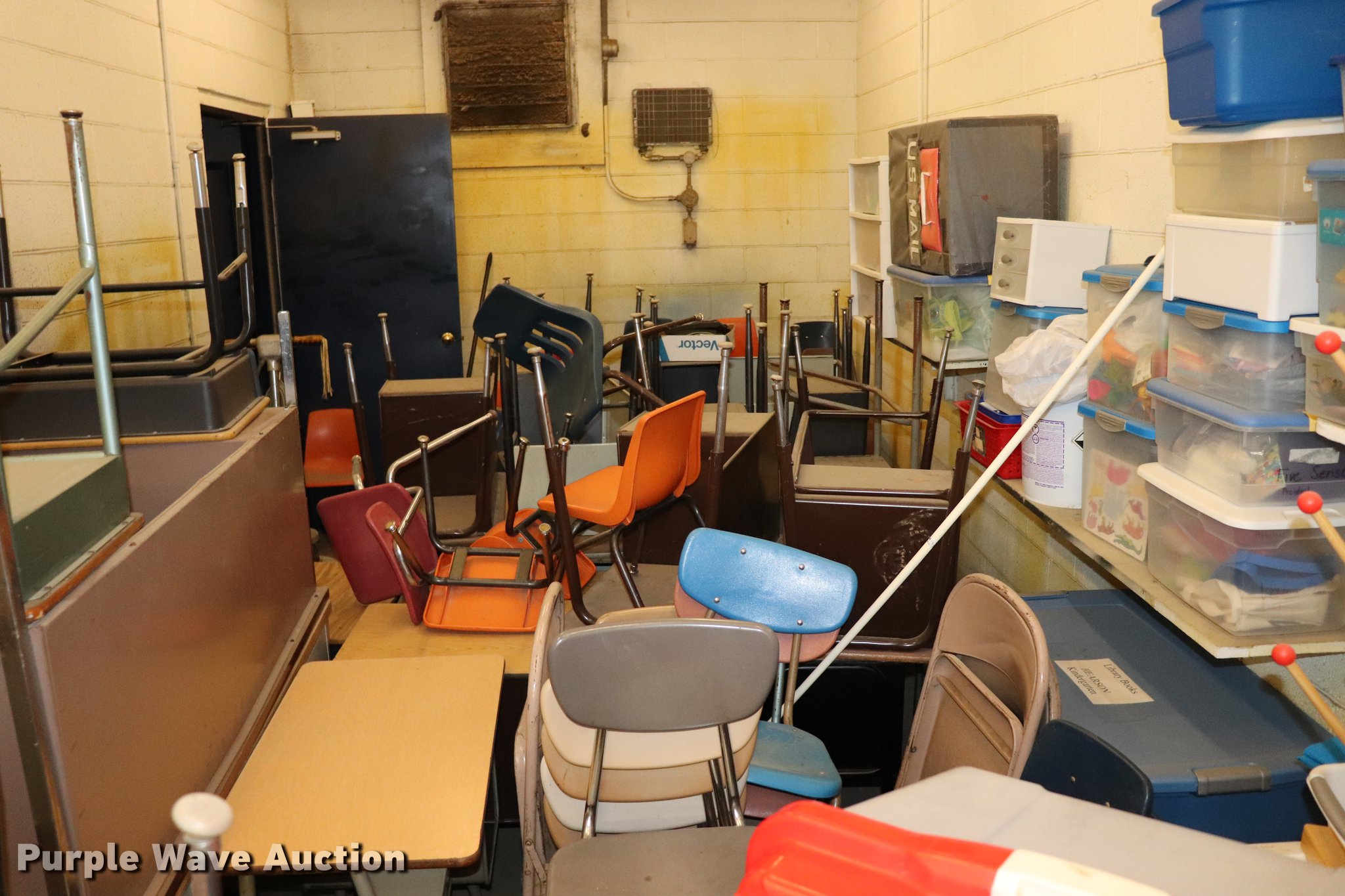Office supplies. Approximately 65 desks, Booth, Coat storage, Chairs, Computer carts, Approximately 6 smart boards, Approximately 5 file cabinets, 60" diameter tables 29"H, Metal doors and frames. USD 101. 410 W 3rd St. Erie, KS 66733