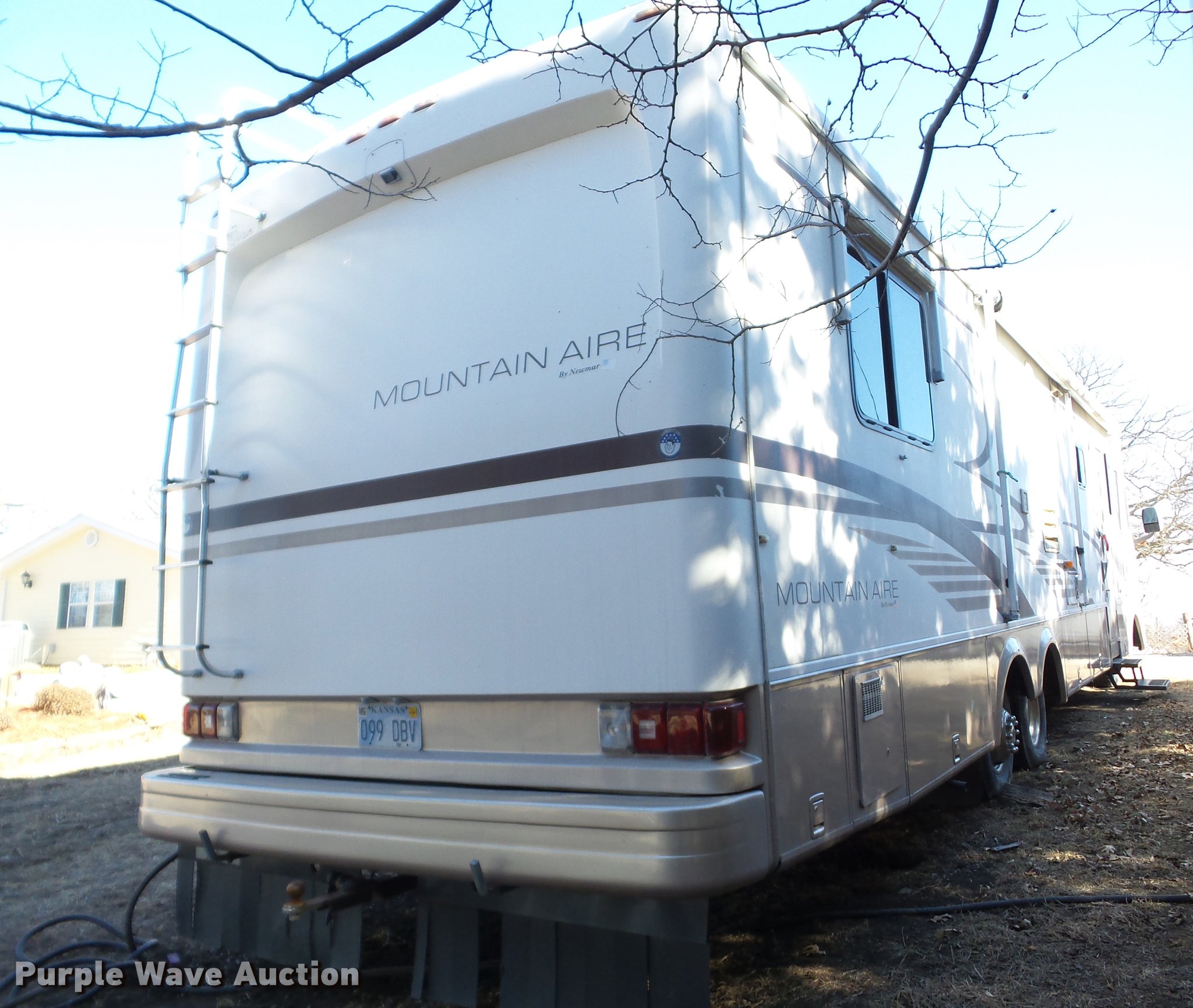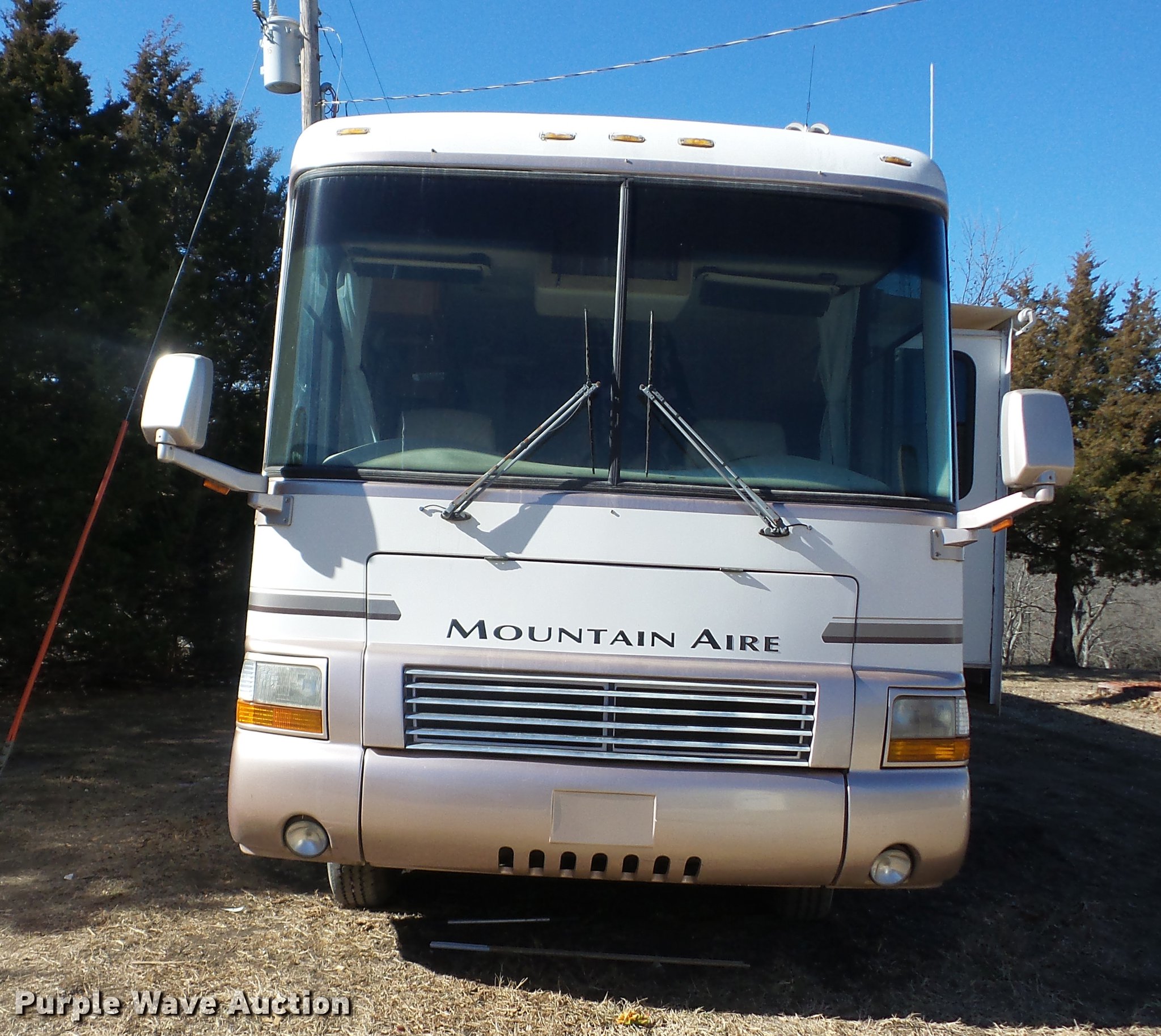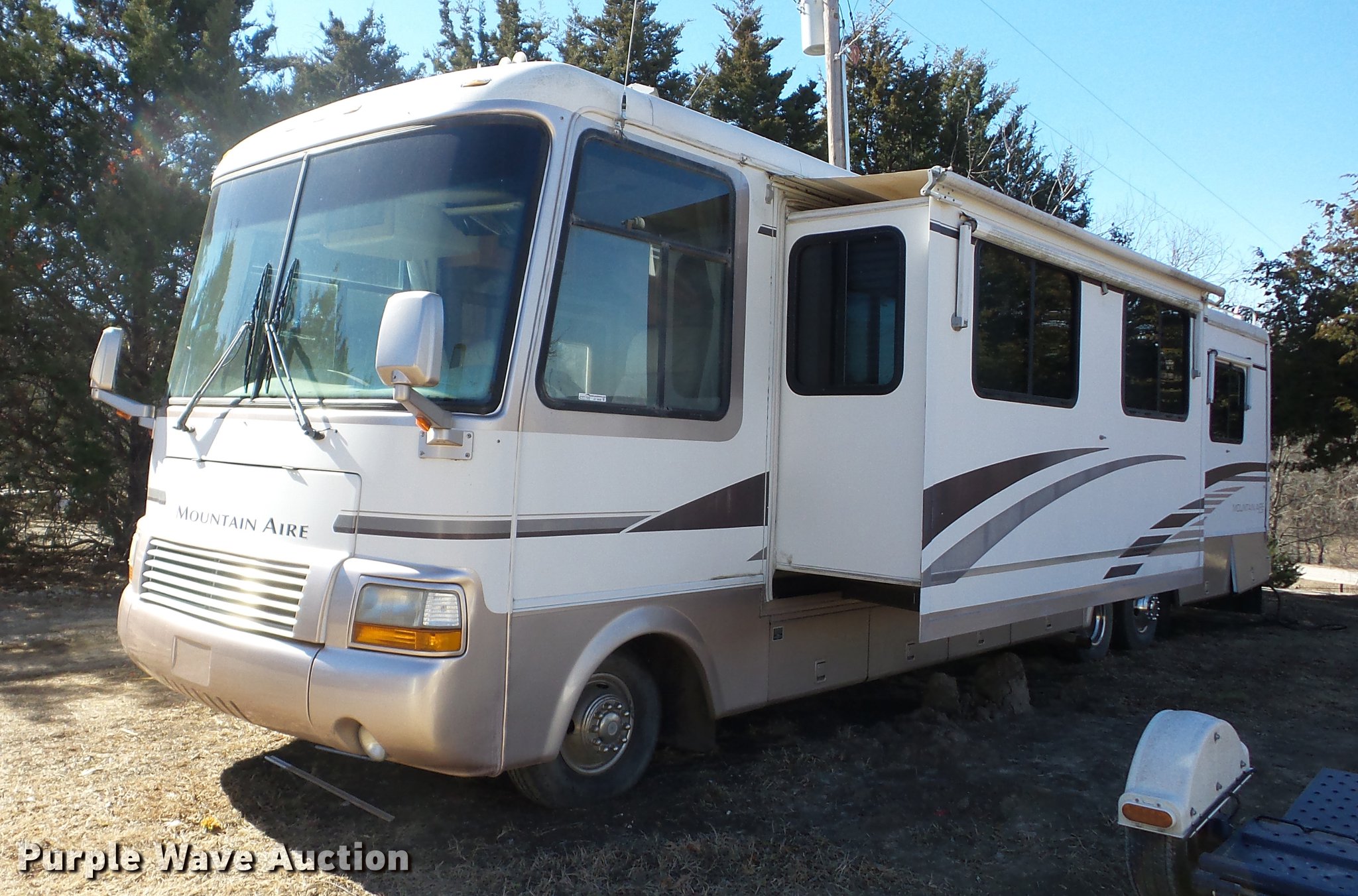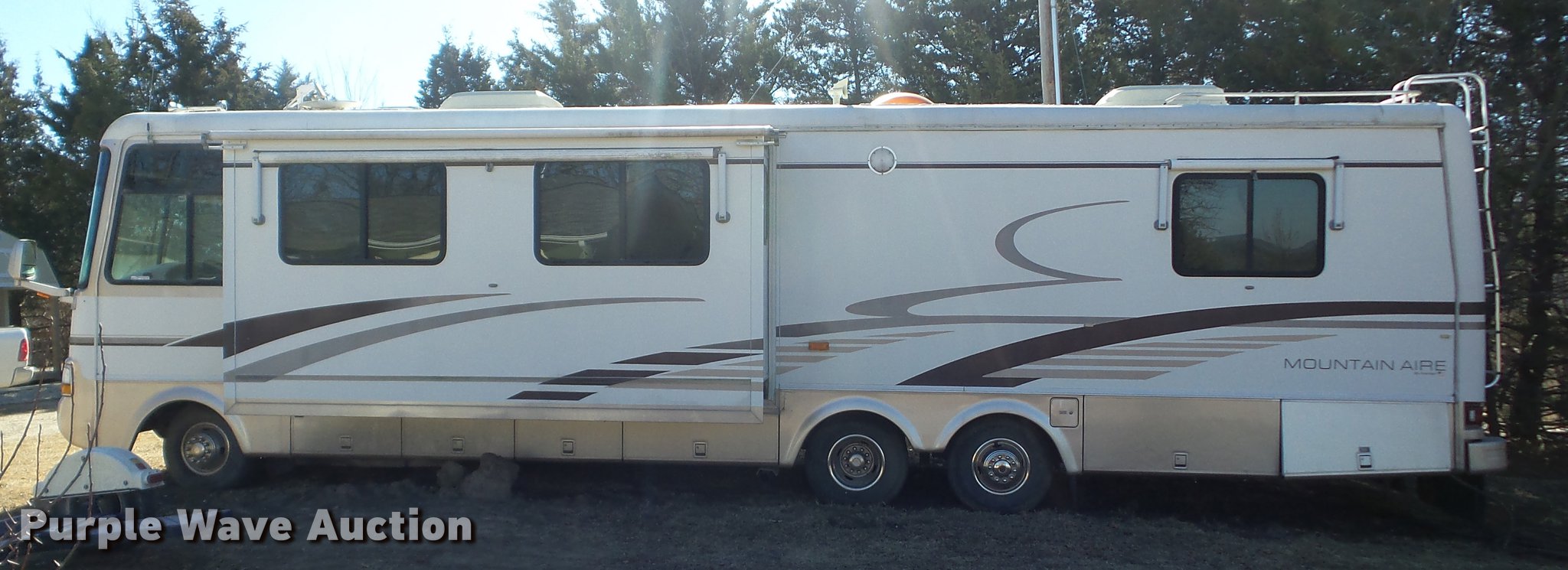 Purple Wave is selling a used RV in Kansas. This item is a 1998 Mountainaire Newman RV with the following: 47,124 miles on odometer, 7.5L V8 gas engine, Automatic transmission, Tandem axle, Ford F550 chassis, AC and heat, Tilt, Cruise, Power mirrors, Backup camera, Class A, 13' slide-out, Dining room table, Chairs, Sink, Three burner stove top, Oven, Sharp convection microwave, Elite refrigerator/freezer, Spendide washer and dryer, Bathroom, Queen size bed, Awning, HWH hydraulic leveling, Air suspension tag axle, LT235/85R16 tires, GVWR 17,000 lbs