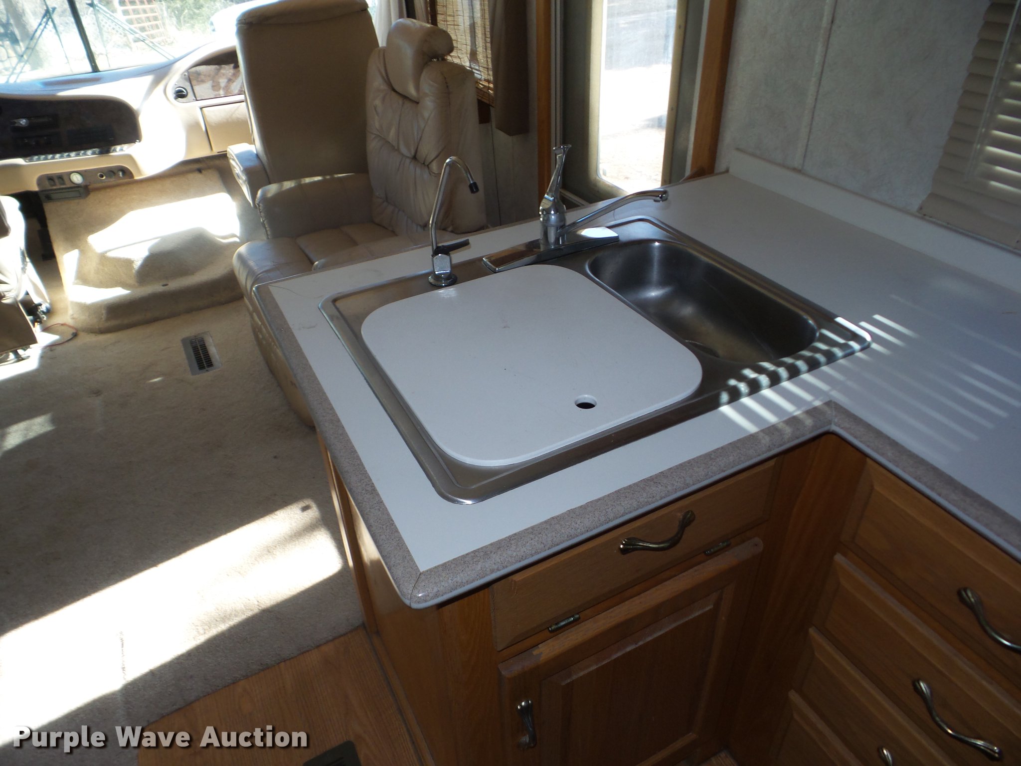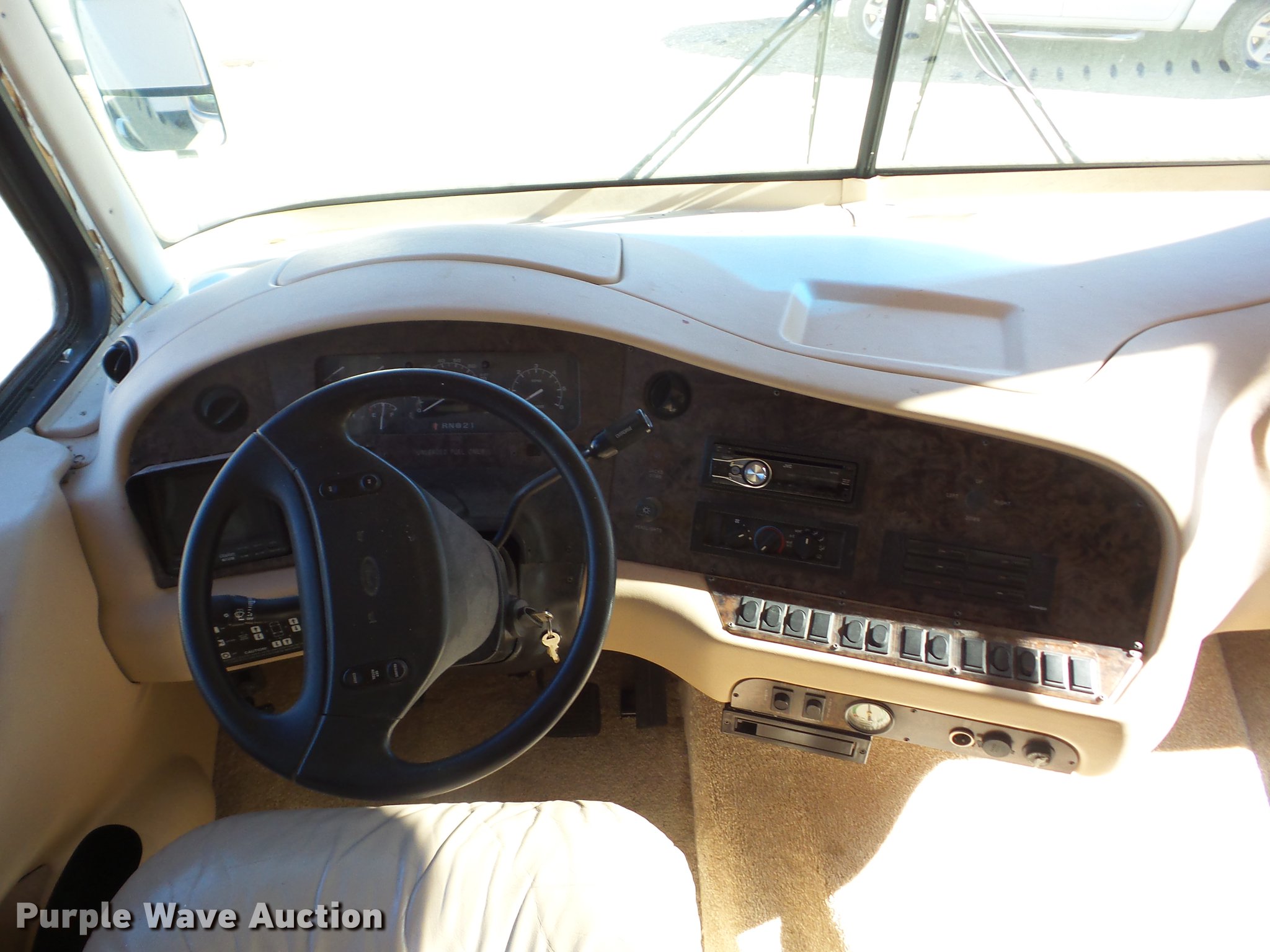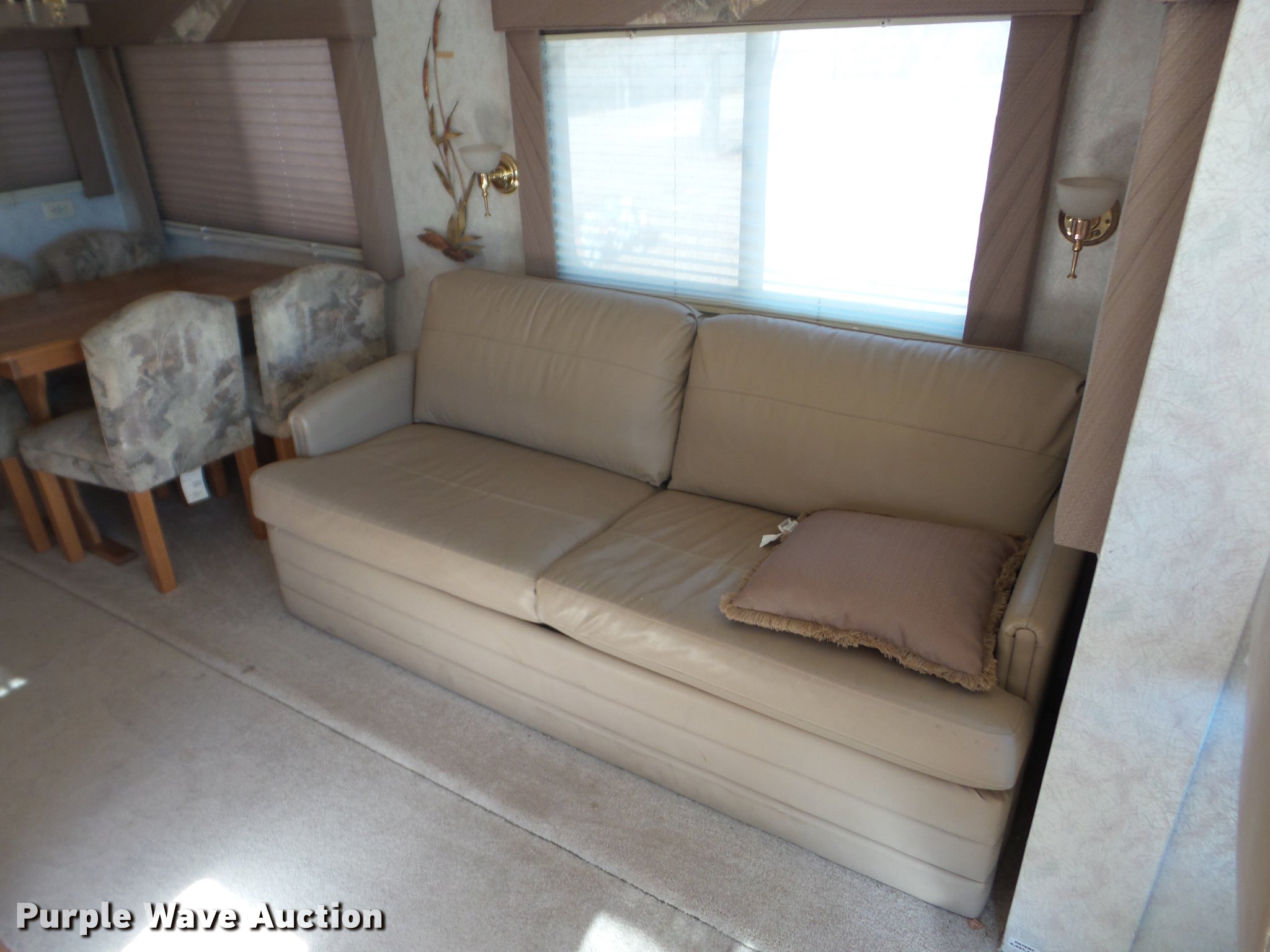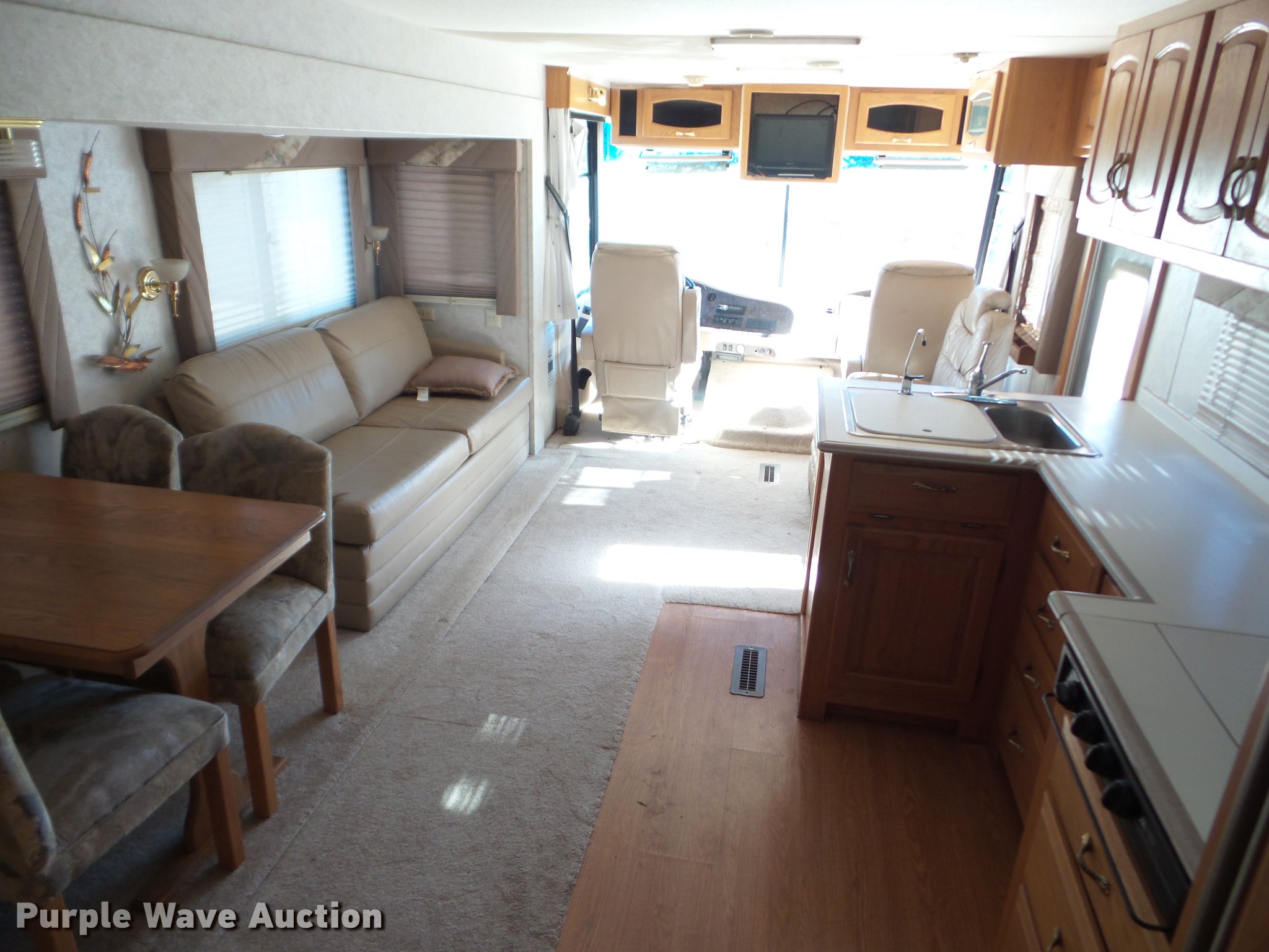 Purple Wave is selling a used RV in Kansas. This item is a 1998 Mountainaire Newman RV with the following: 47,124 miles on odometer, 7.5L V8 gas engine, Automatic transmission, Tandem axle, Ford F550 chassis, AC and heat, Tilt, Cruise, Power mirrors, Backup camera, Class A, 13' slide-out, Dining room table, Chairs, Sink, Three burner stove top, Oven, Sharp convection microwave, Elite refrigerator/freezer, Spendide washer and dryer, Bathroom, Queen size bed, Awning, HWH hydraulic leveling, Air suspension tag axle, LT235/85R16 tires, GVWR 17,000 lbs