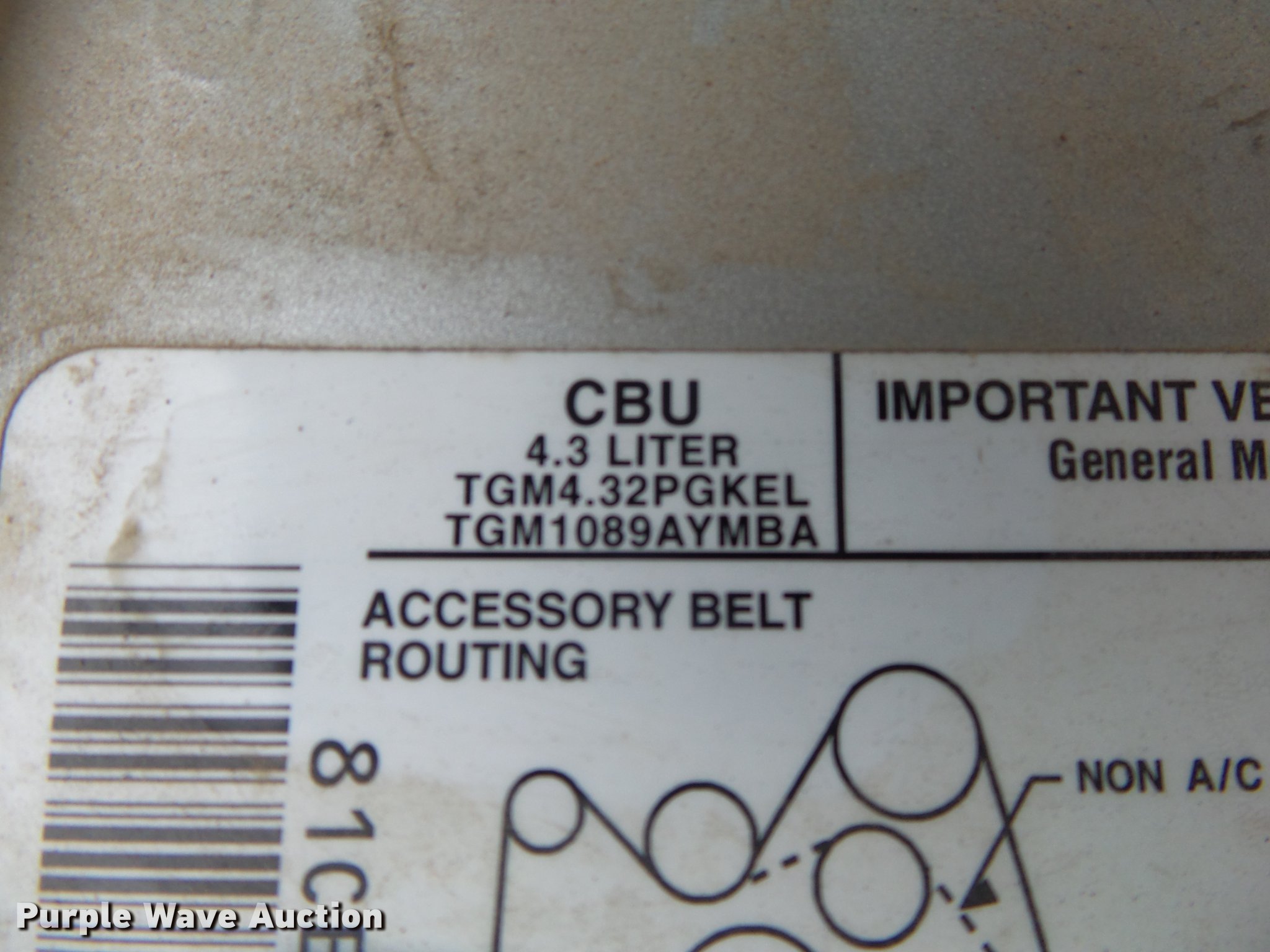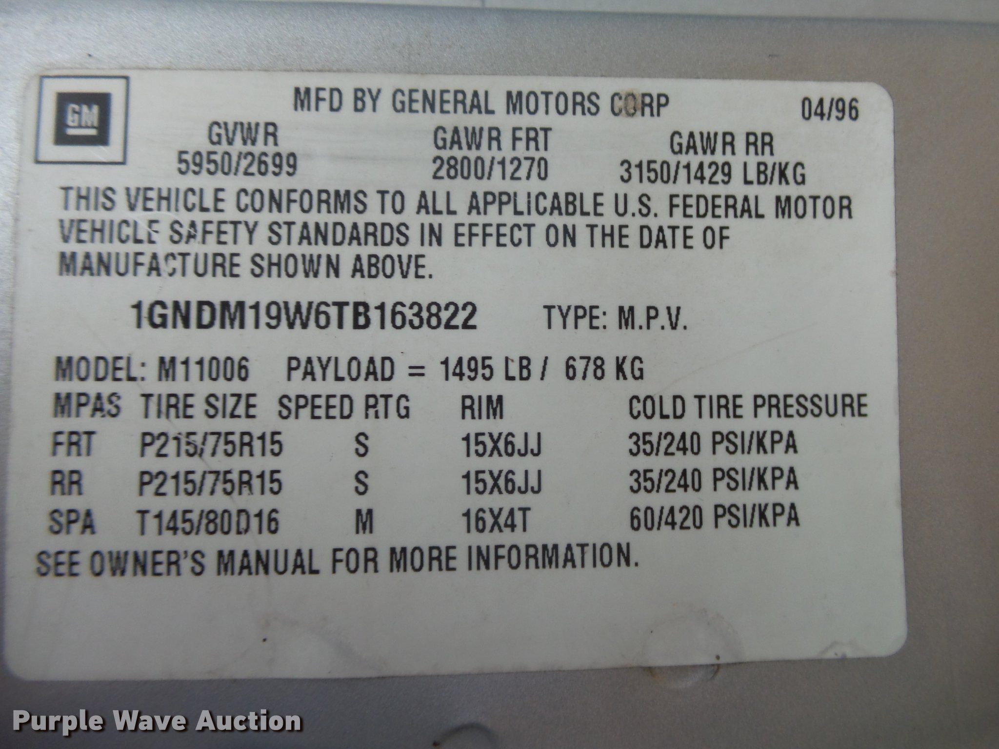 Purple Wave is selling a used Passenger Vehicle in Missouri. This item is a 1996 Chevrolet Astro van with the following: 129,620 miles on odometer, 4.3L V6 OHV 12V gas engine, Automatic transmission, AC and heat, Cruise, AM/FM, Manual windows and locks, Vinyl interior, P235/75R15 tires, ABS light on