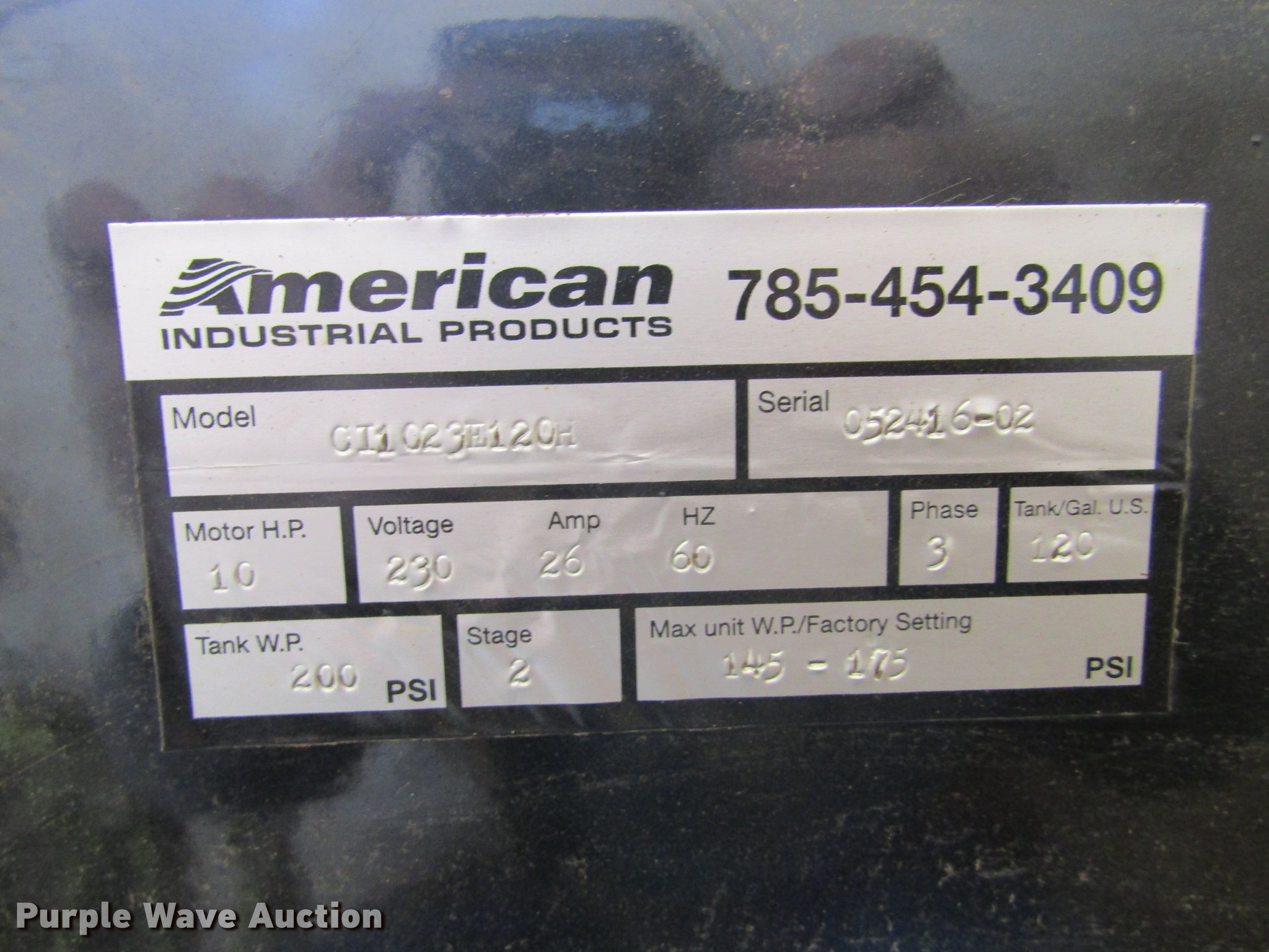 Purple Wave is selling a used Air Compressor in Kansas. This item is a American Industrial CI1023E120H air compressor with the following: 10 HP electric motor, 230V, Three phase, Serial 05241-02