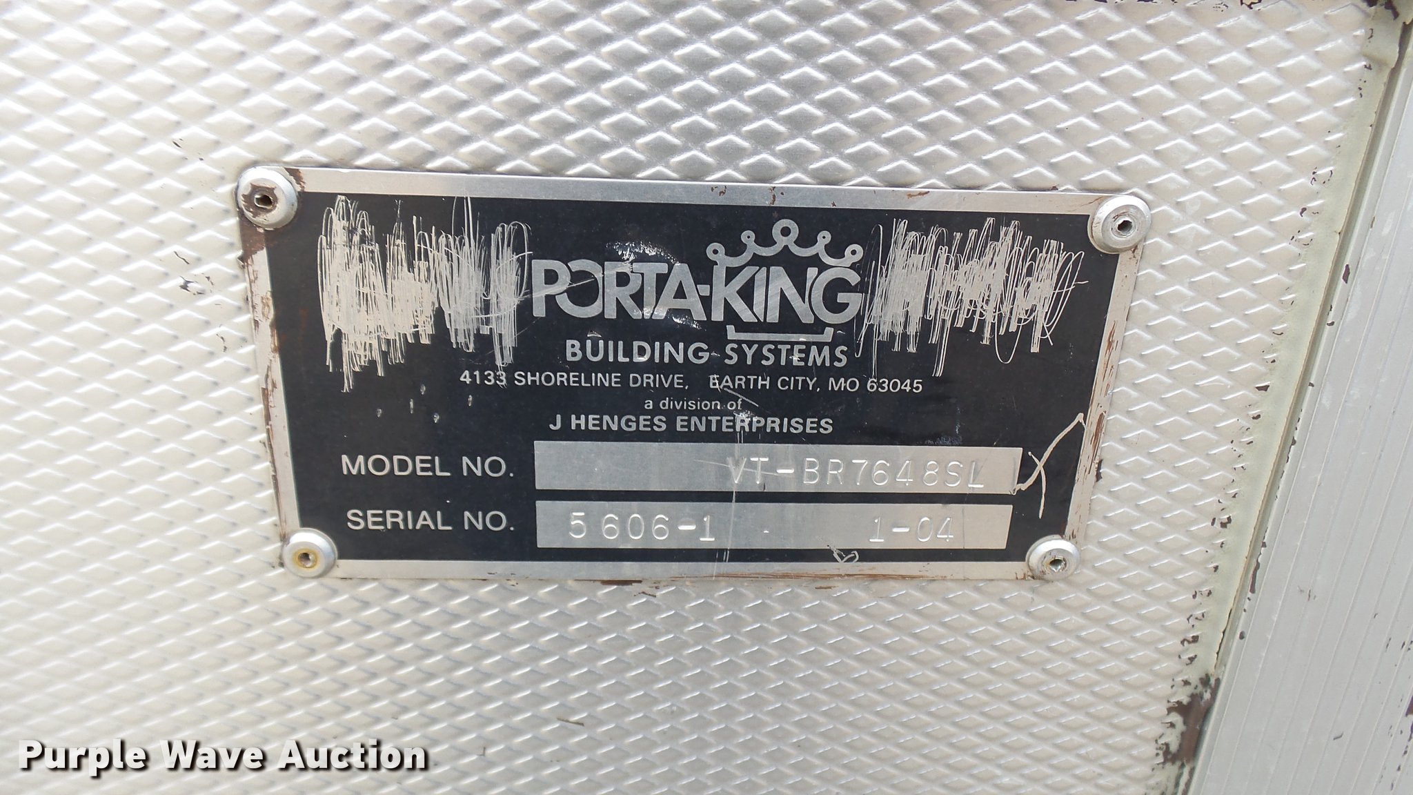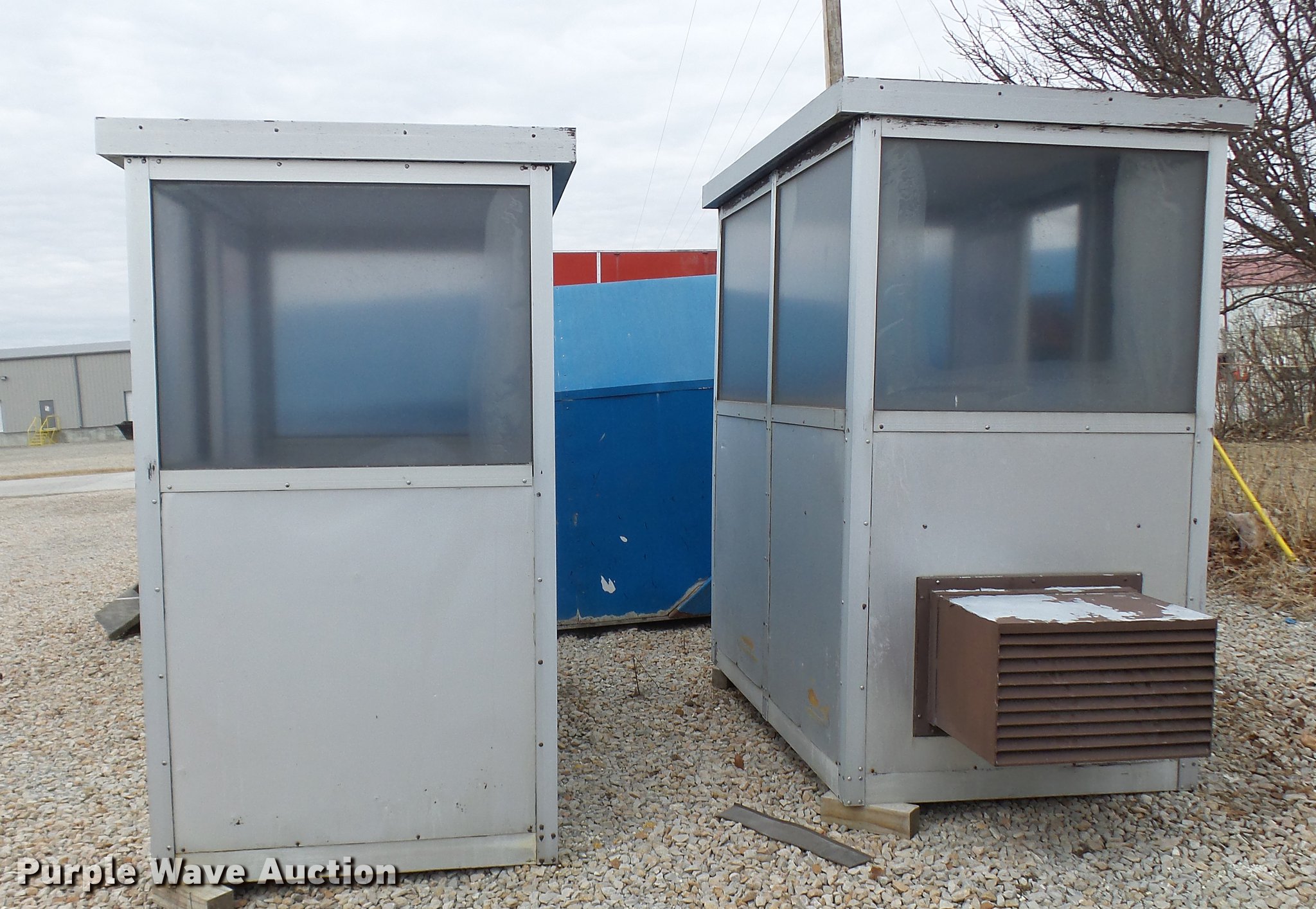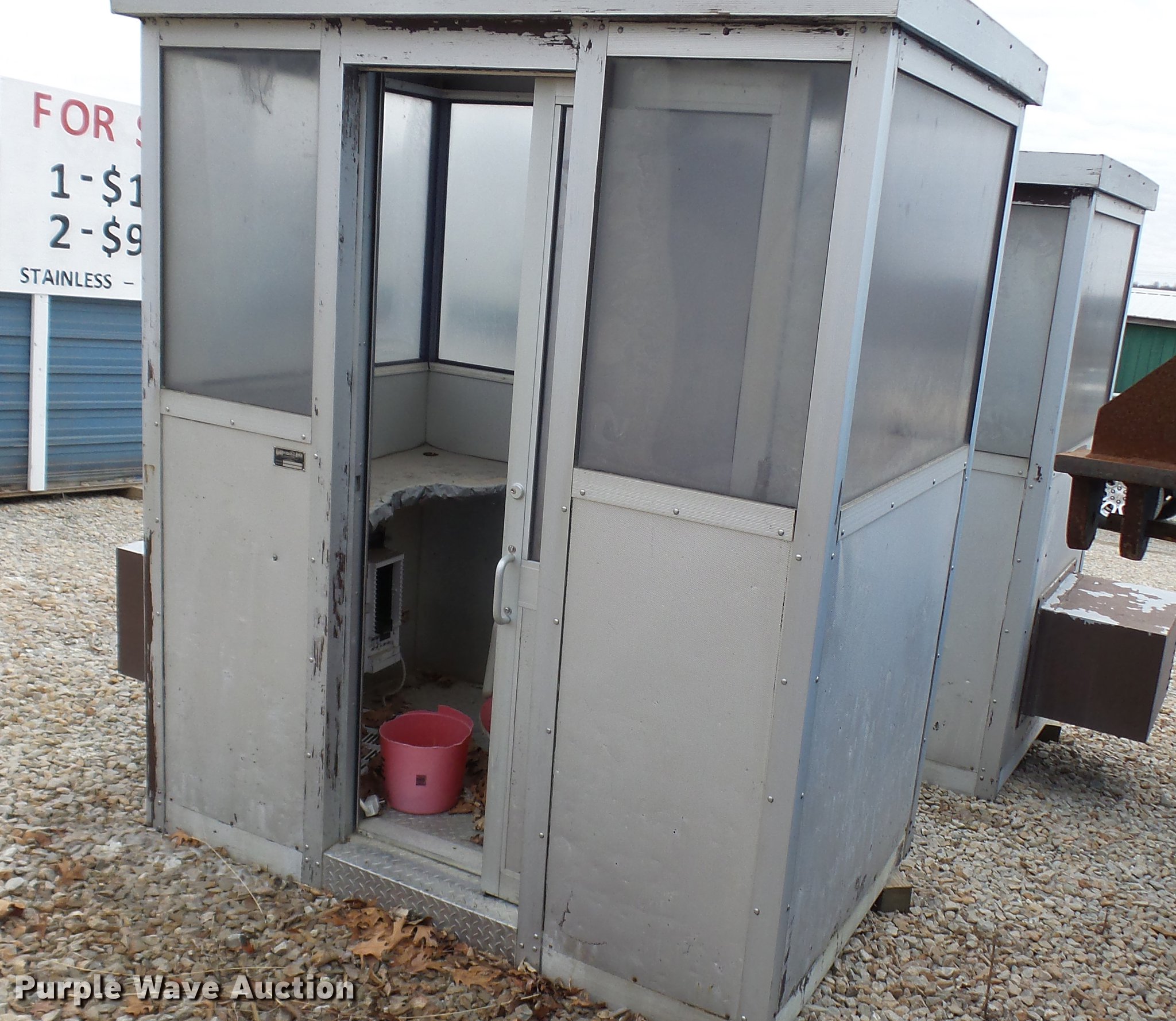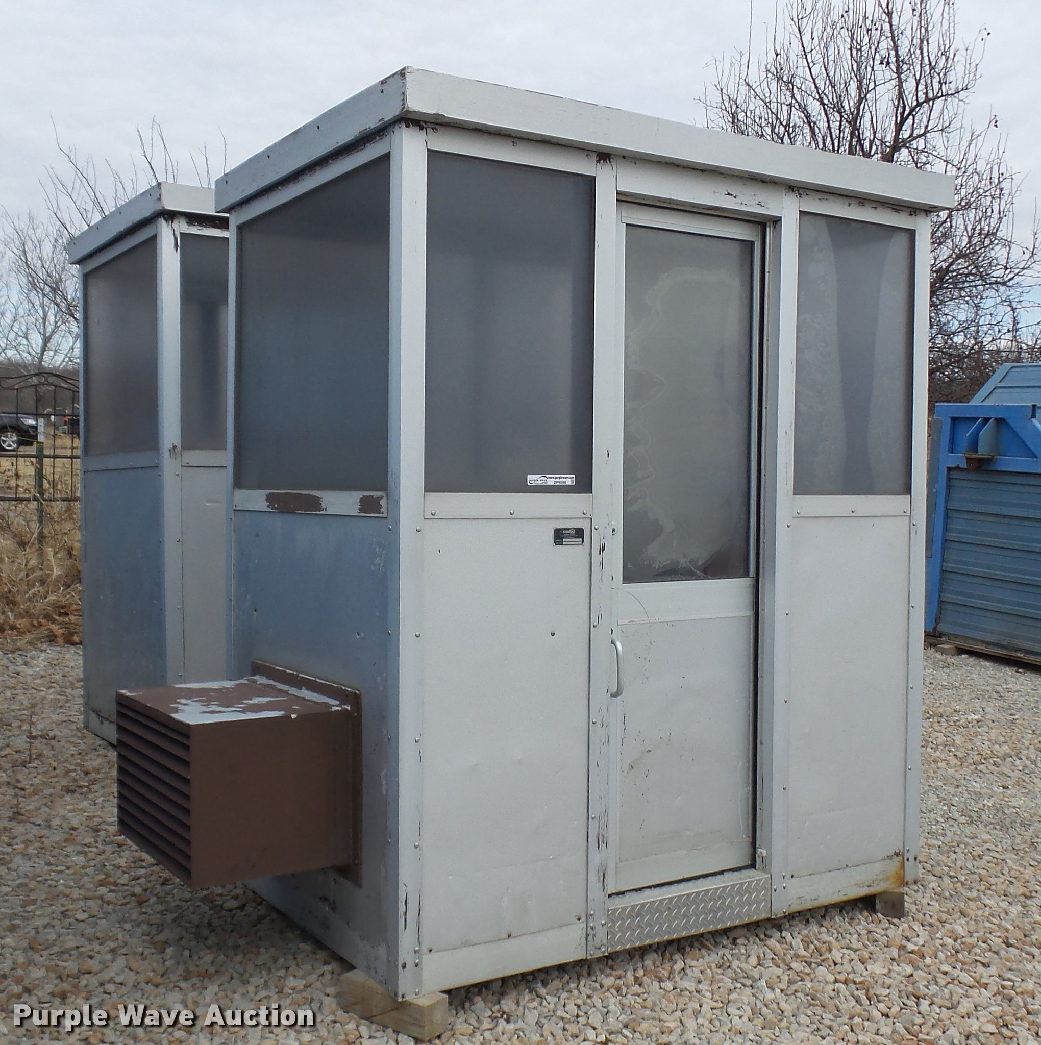 Purple Wave is selling a used Building Materials in Missouri. This item is a (2) Porta-King Building Systems guard shacks with the following: Model VTBR7648SL, 6'3" x 49" x 90"H, 24"W door, AC and heat, Unknown operating condition, Bullet-proof, Aluminum construction, Serial 5606-4 1-04, 5606-1 1-04
