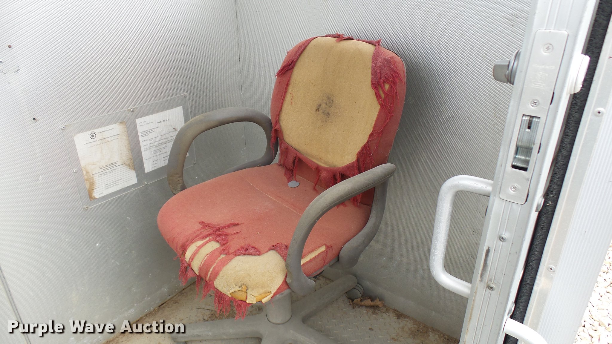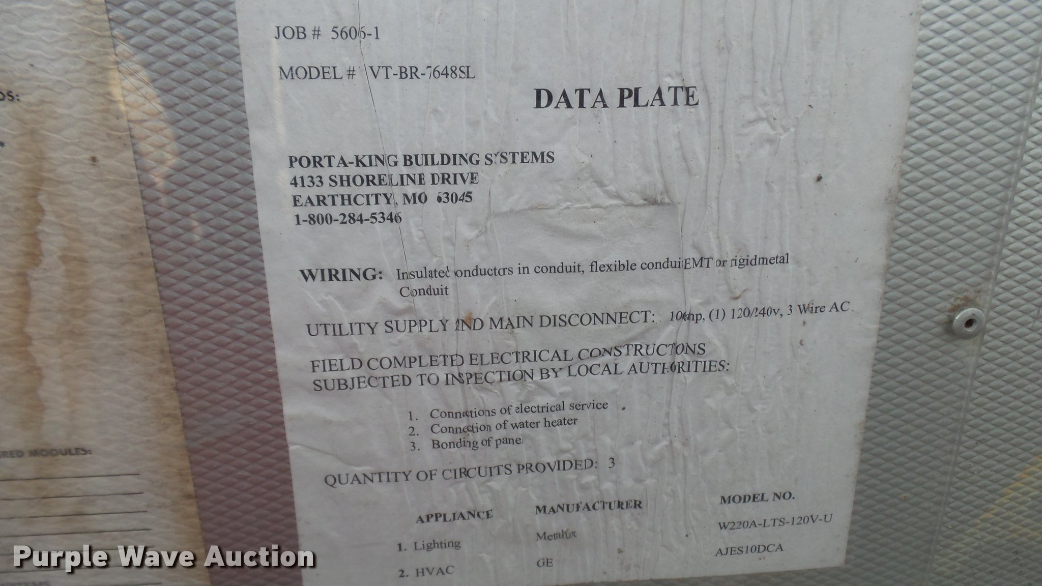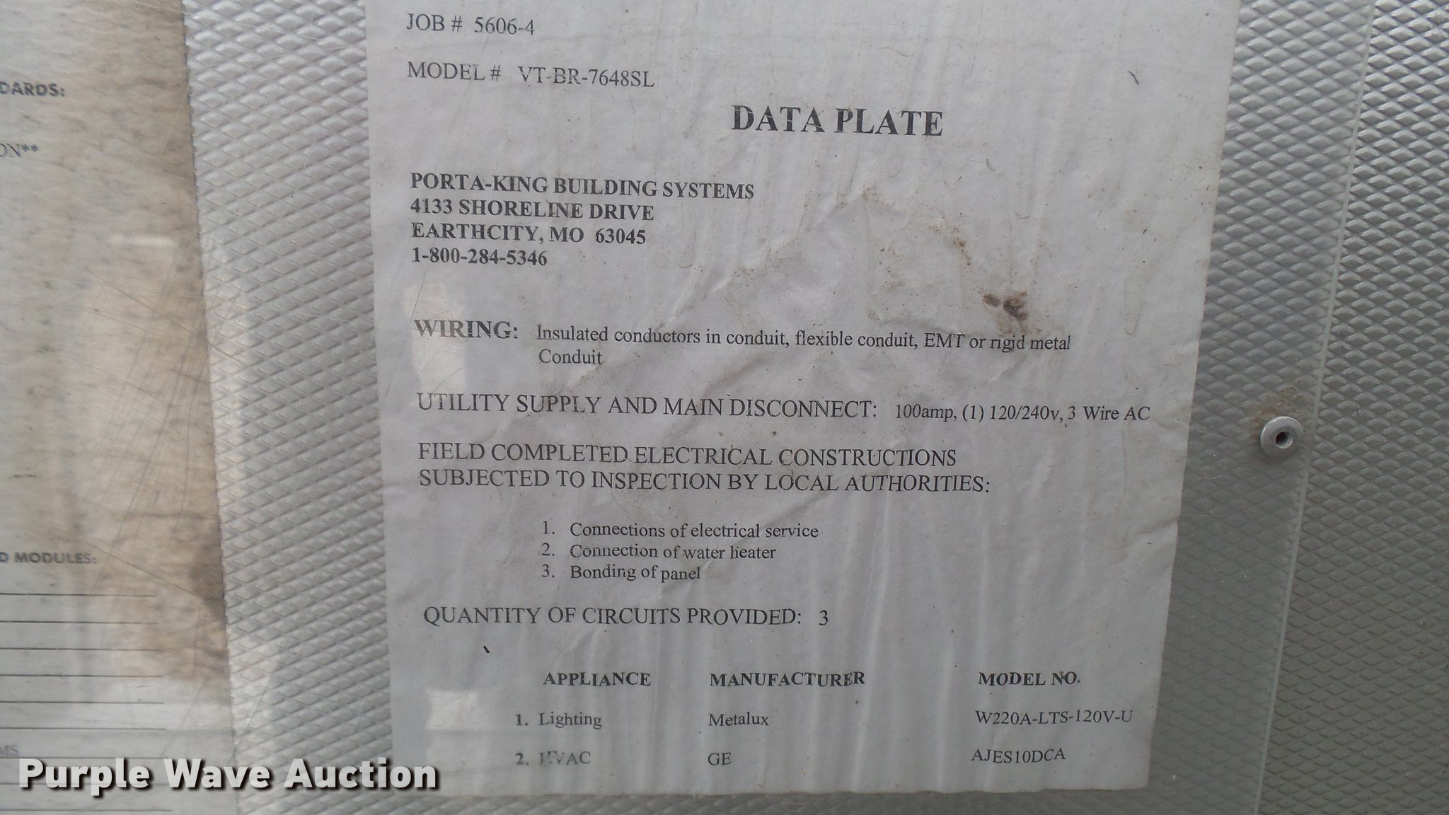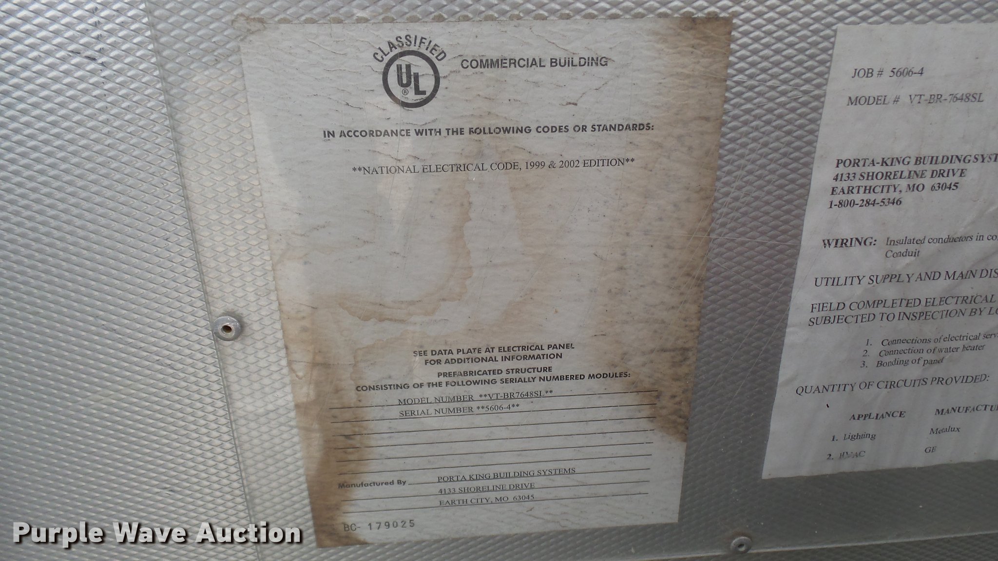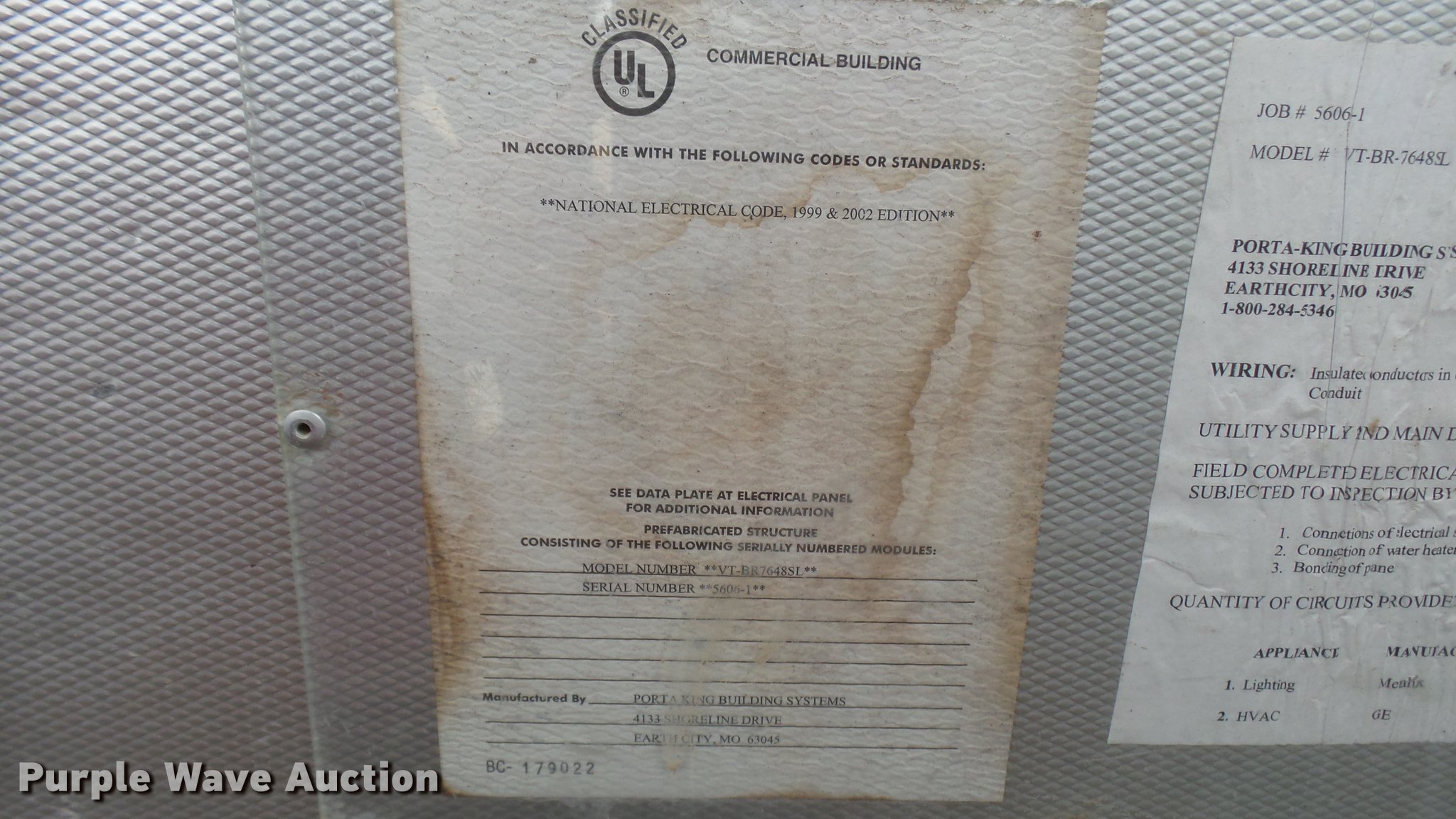 Purple Wave is selling a used Building Materials in Missouri. This item is a (2) Porta-King Building Systems guard shacks with the following: Model VTBR7648SL, 6'3" x 49" x 90"H, 24"W door, AC and heat, Unknown operating condition, Bullet-proof, Aluminum construction, Serial 5606-4 1-04, 5606-1 1-04