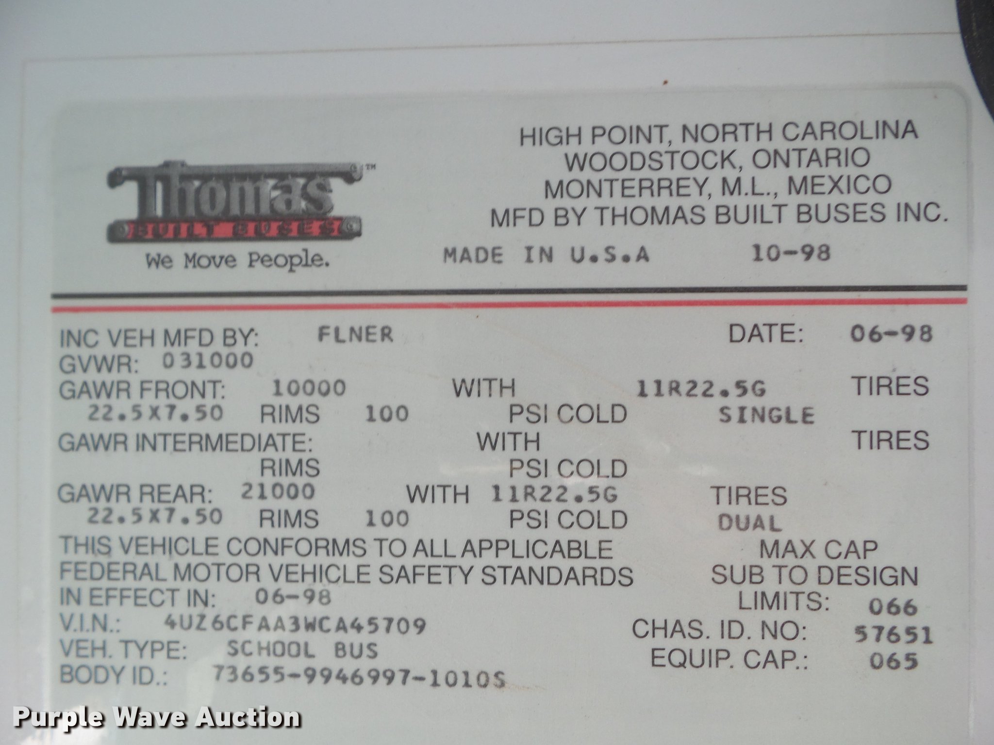 Purple Wave is selling a used Bus in Iowa. This item is a 1998 Freightliner FS65 school bus with the following: 59,778 miles on odometer, 7,118 hours on meter, Cummins ISB 5.9L L6 turbo diesel engine, 215 HP, Serial 56474008, Automatic transmission, Single axle, Heat, AM/FM/cassette, Heated mirrors, Suspension seat, 65 passenger capacity, Ceiling, rear, and side emergency exits, Beacon light, Lighted stop sign, Front and rear tow hooks, Air suspension, Air brakes, 256" wheelbase, Michelin 11R22.5 tires, GVWR 31,000 lbs