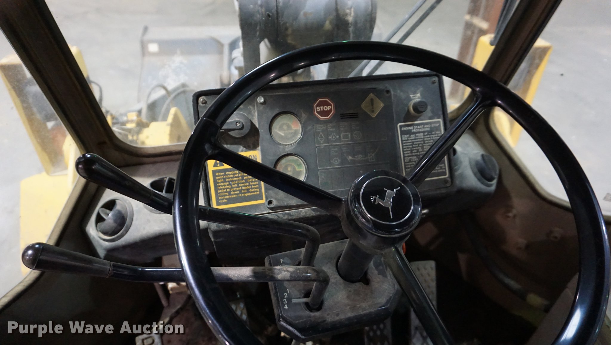 Purple Wave is selling a used Wheel Loader in Kansas. This item is a 1990 John Deere 544E TC wheel loader with the following: 863 hours on meter, Actual hours unknown, John Deere 6059TDW02 5.9L six cylinder turbo diesel engine, 115 HP, Powershift transmission, 4F-3R gears, EROPS, Heat, Tilt steering wheel, Suspension seat, Joystick bucket controls, Wipers, Front and rear work lights, JRB 5445 100"W general purpose bucket, 3 cu. yd. capacity, Hydraulic quick coupler, 20.5-25 tires, Quick coupler hydraulic hose missing, Serial DW544EB530637