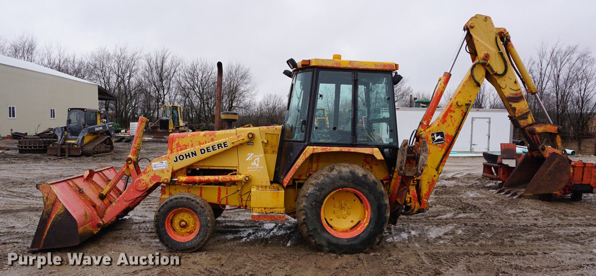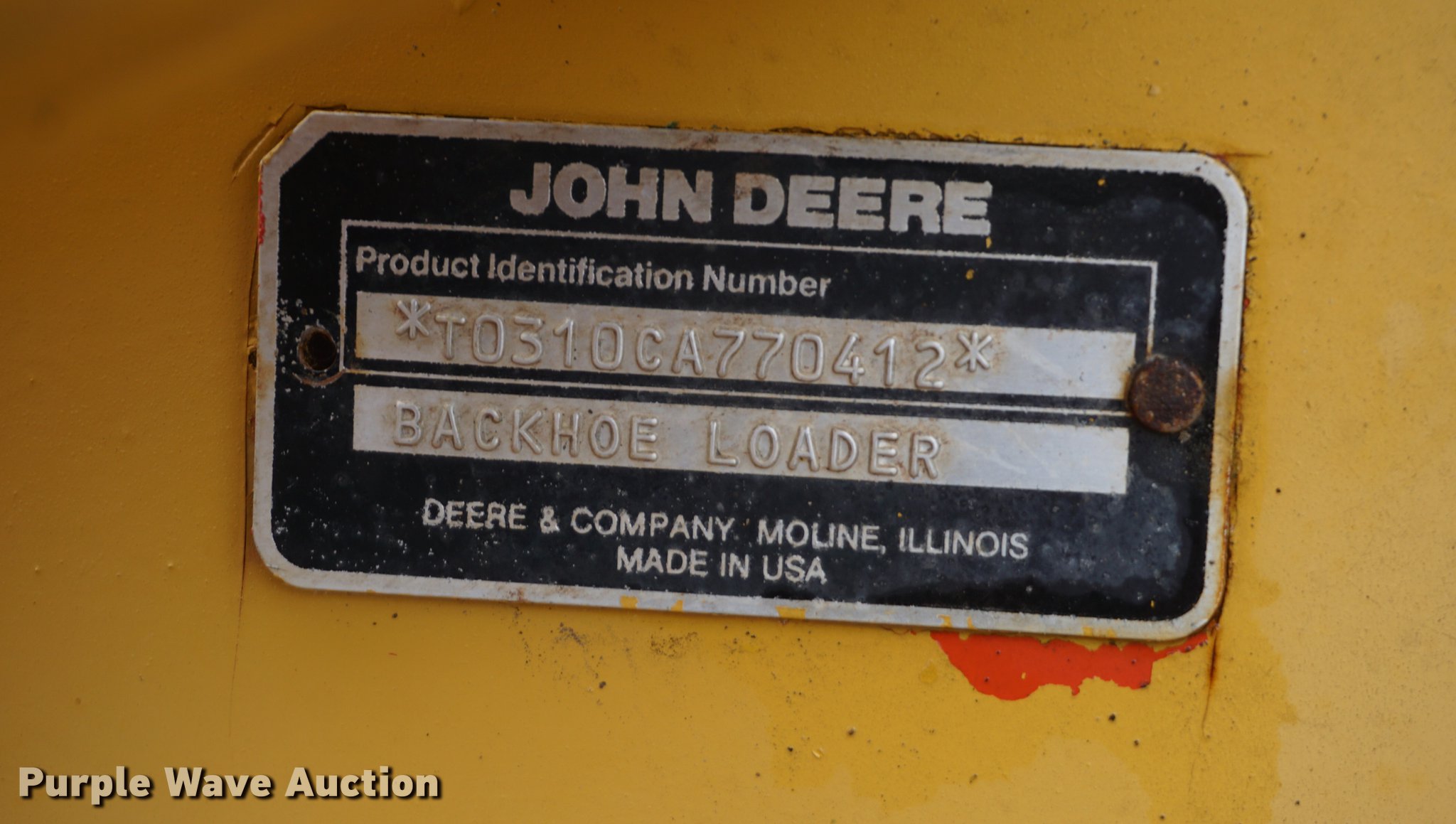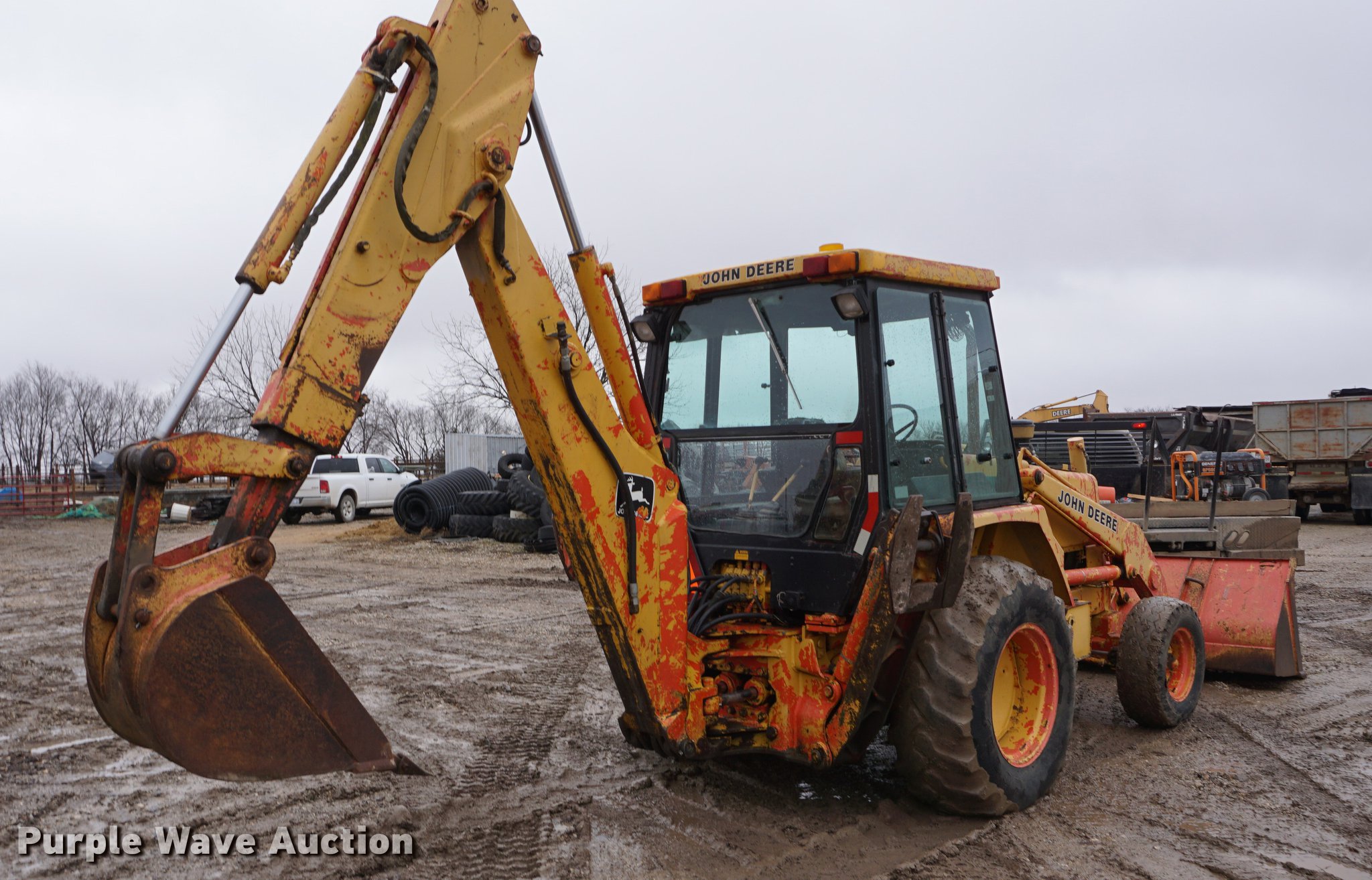 Purple Wave is selling a used Tractor Loader Backhoe in Kansas. This item is a 1990 John Deere 310C backhoe with the following: 4,523 hours on meter, John Deere 4.5L four cylinder diesel engine, 75 HP, Shuttle shift transmission, 4F-4R gears, EROPS, Suspension seat, Wobble stick backhoe controls, 92"W loader bucket, Bolt-on cutting edge, E-stick, 24"W backhoe bucket, (4) teeth, Auxiliary hydraulics, 11-16 front tires, 16.9-24 rear tires, Serial T0310CA770412