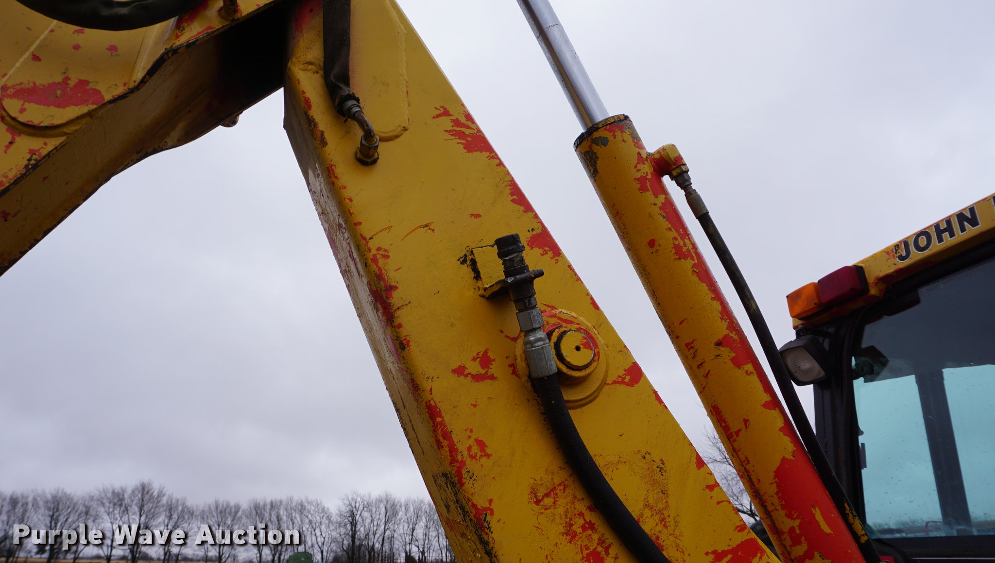 1990 John Deere 310C backhoe. 4,523 hours on meter, John Deere 4.5L four cylinder diesel engine 75 HP, Shuttle shift transmission 4F-4R gears, EROPS, Suspension seat, Wobble stick backhoe controls, 92"W loader bucket Bolt-on cutting edge, E-stick, 24"W backhoe bucket (4) teeth, Auxiliary hydraulics, 11-16 front tires, 16.9-24 rear tires, Serial T0310CA770412. Zook Excavating. Garnett, KS 66032