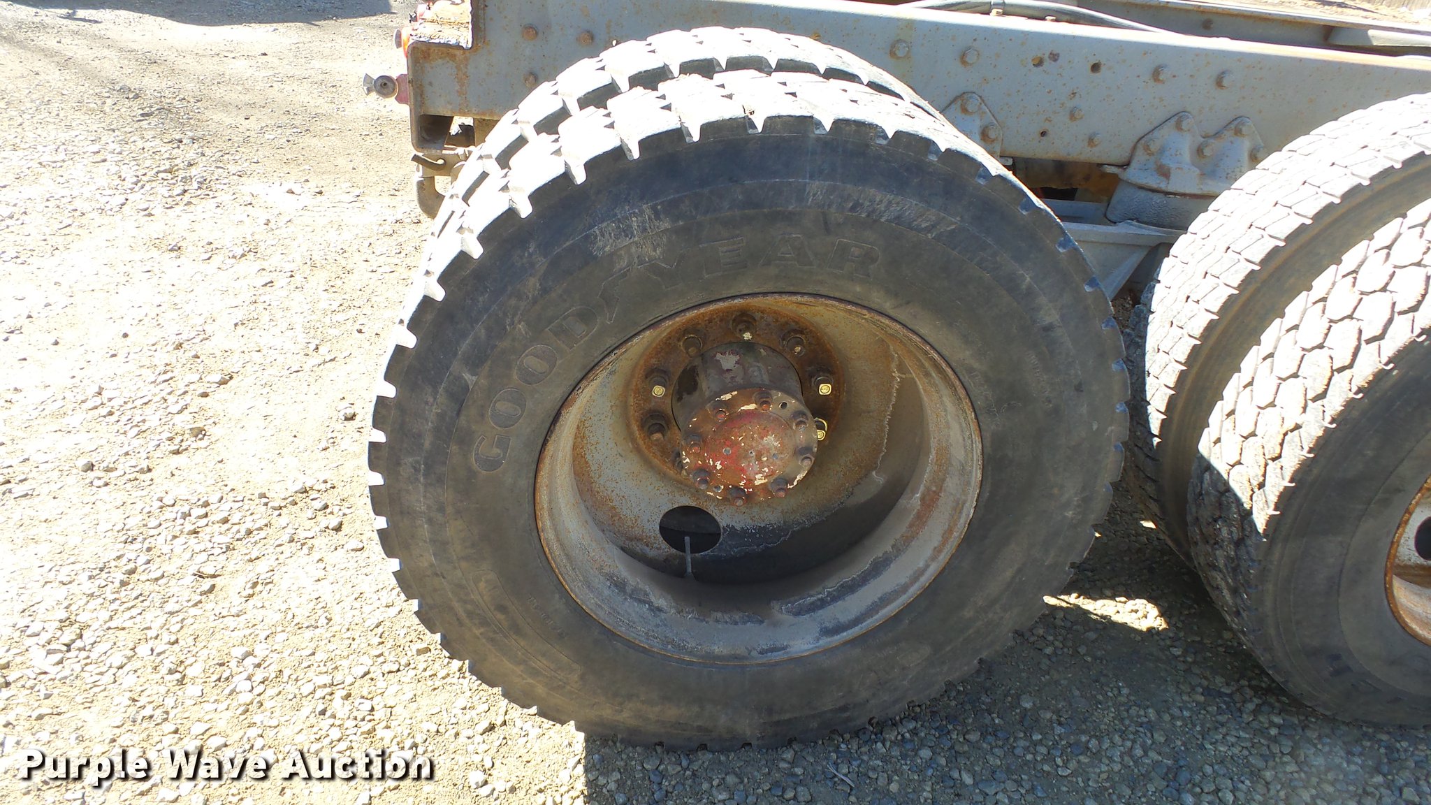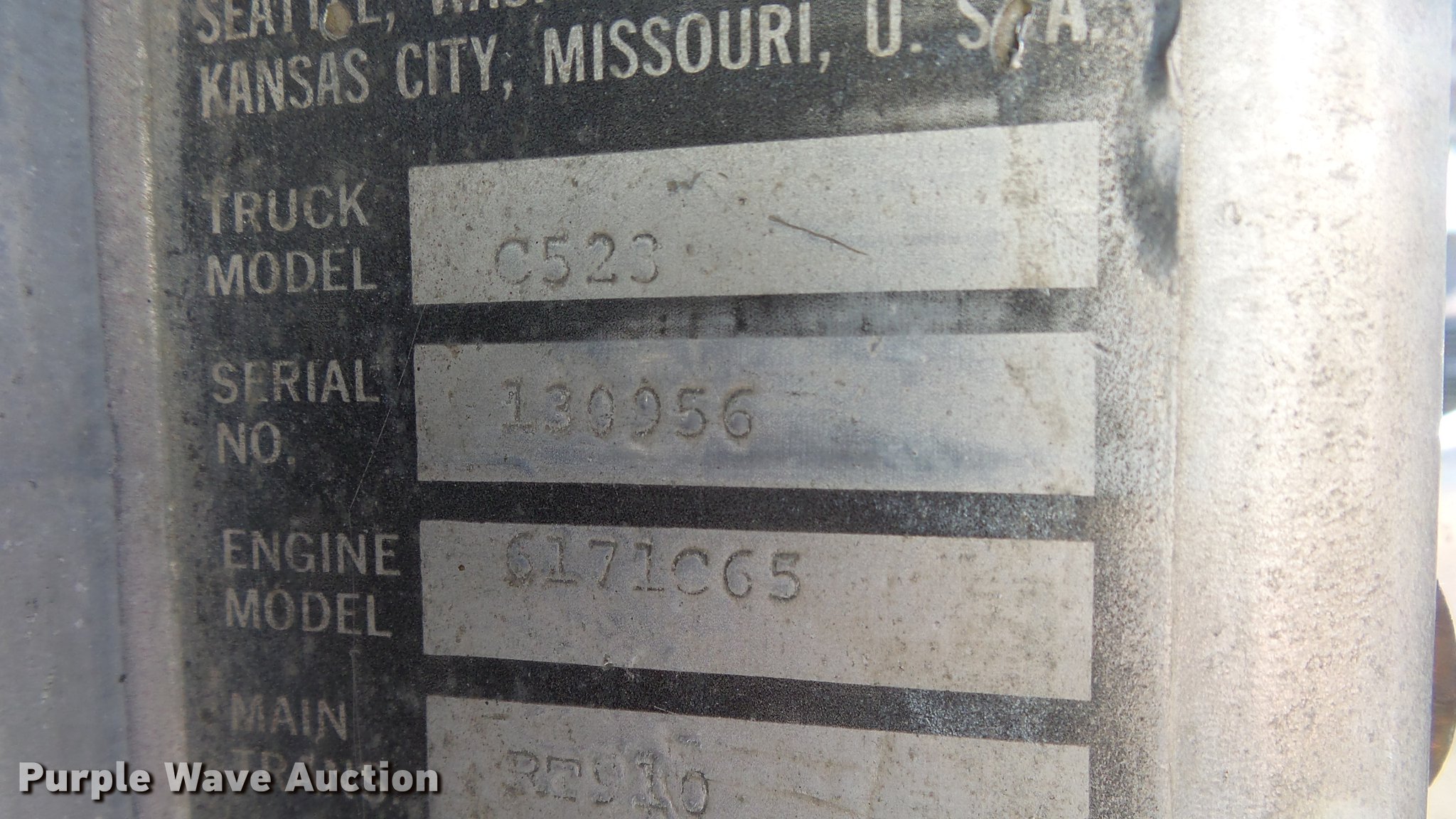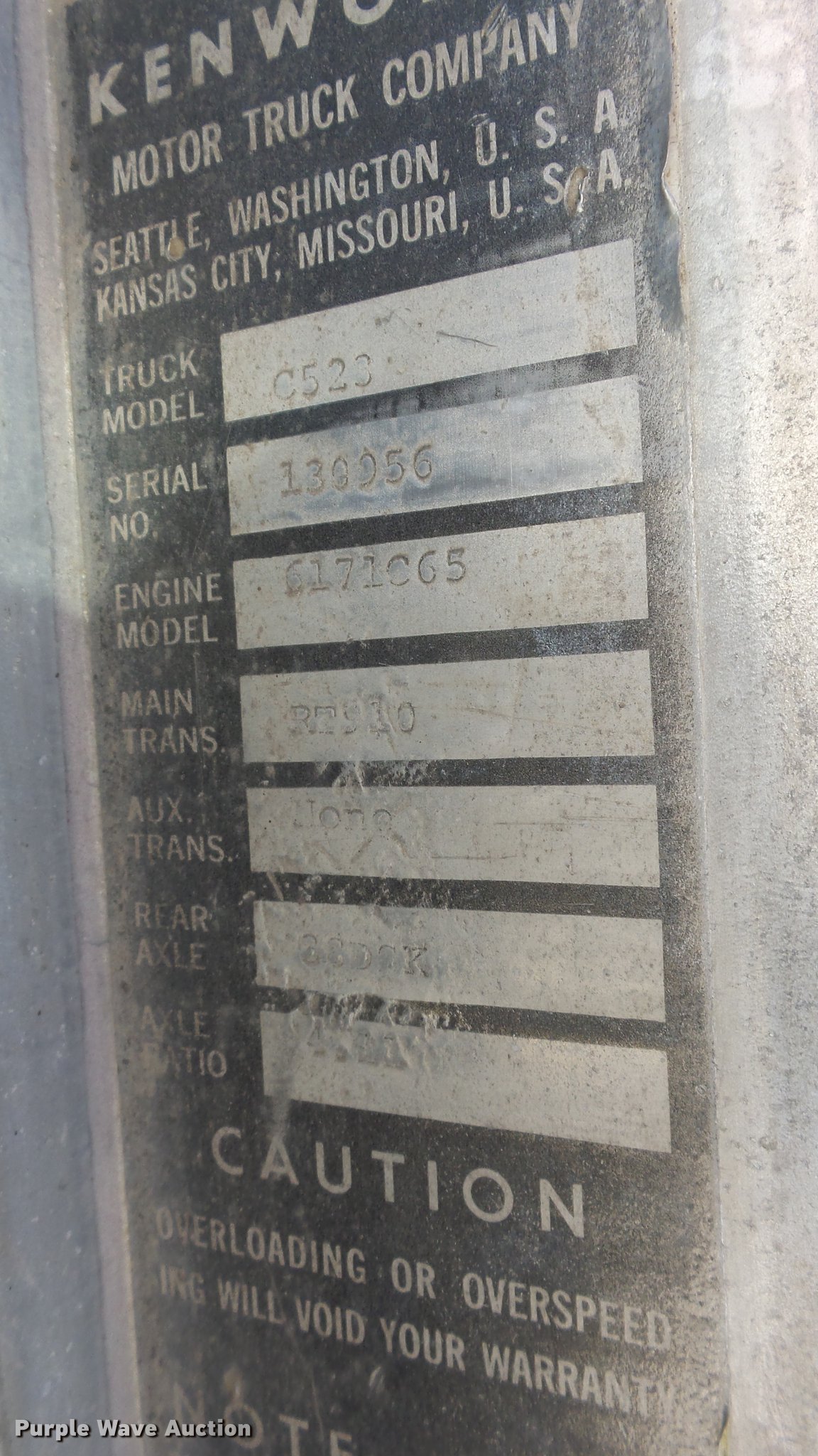 Purple Wave is selling a used Truck Chassis in Kansas. This item is a 1973 Kenworth C523 truck chassis with the following: 337,226 miles on odometer, Turbo diesel engine, Eaton Fuller 13 speed manual transmission, Tandem axle, Inter-axle differential lock, Fifth wheel lock, Heat, Air suspension seat, PTO, Single exhaust stack, Dual fuel tanks, Pintle hitch, 17' from rear of cab to rear of frame, Spring suspension, Air brakes, 385/65R22.5 front tires, 11R24.5 rear tires