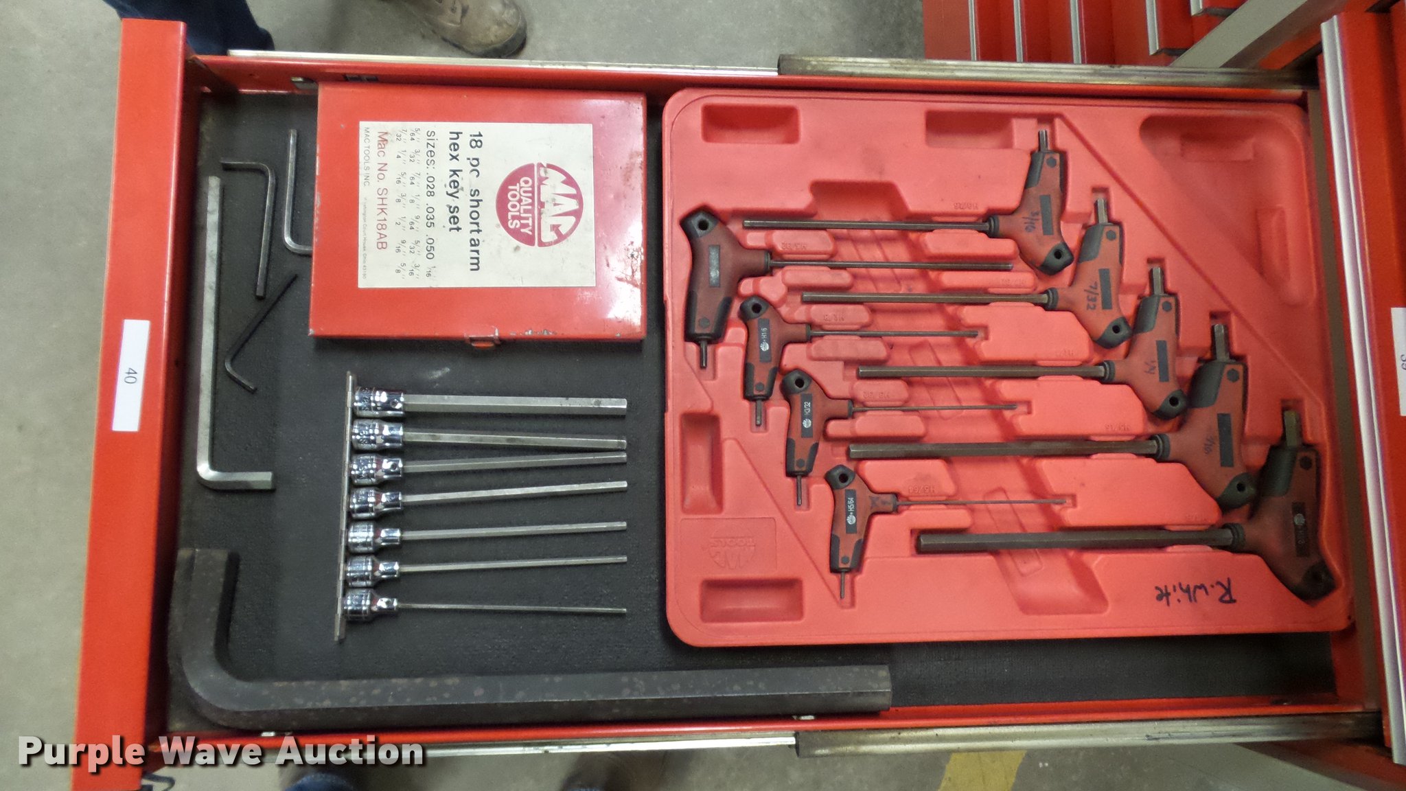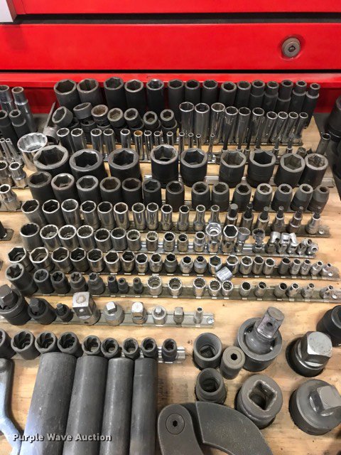 Purple Wave is selling a used Tools in Missouri. This item is a Snap-on toolbox with tools with the following: Main box model KRL1003B, Top box model KRL1203B, Side box model KRL1011A, 8'W x 30"D x 70"H with upper lids closed, (44) drawers, (2) upper lids, Pry bar rack, Locking casters, Tool brands include Snap-on, Mac, Ingersoll Rand, Blue-Point, and others