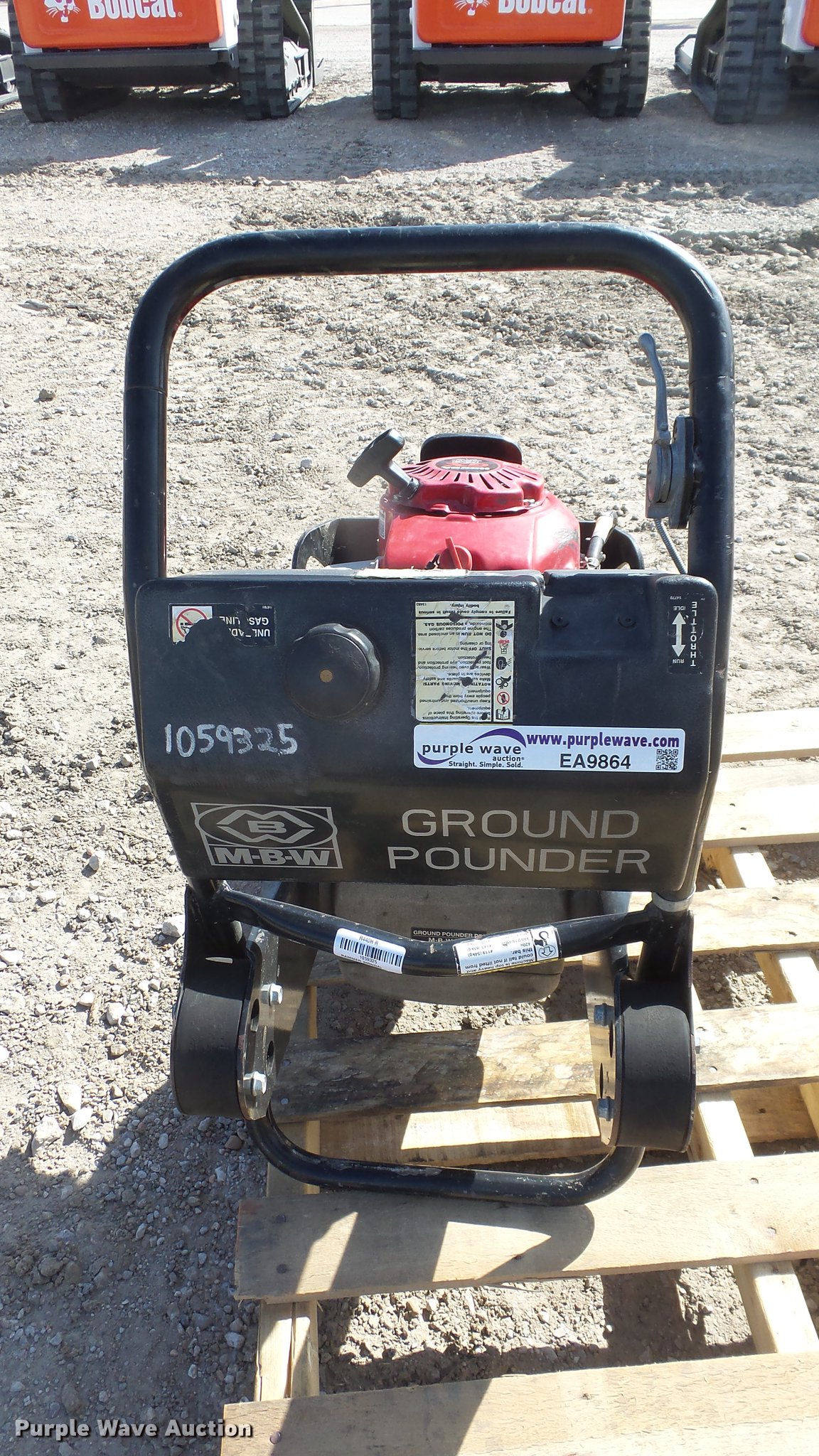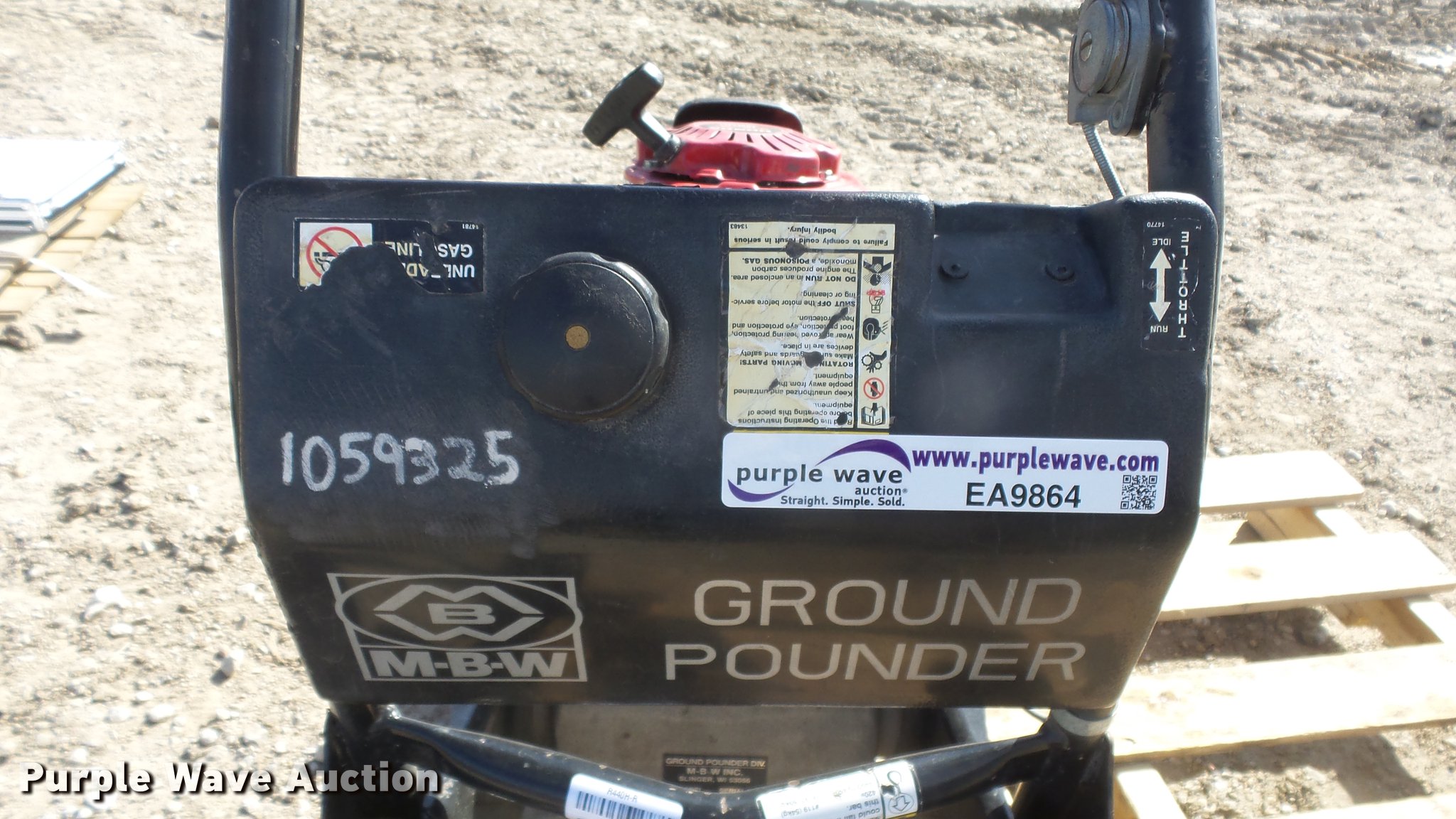 Purple Wave is selling a used Walk Behind Compactor in Kansas. This item is a MBW R440H Ground Pounder compactor with the following: Honda GX100 gas engine, 11" x 12" plate, Unknown operating condition, Serial 4400603, Unit# 1059325