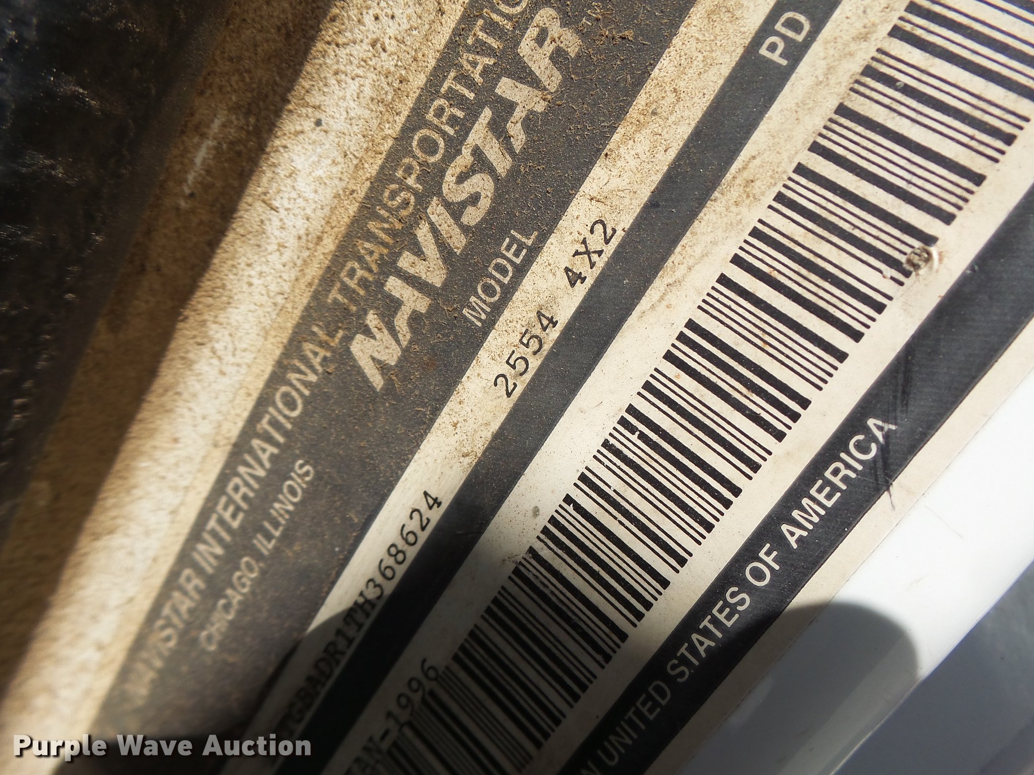 Purple Wave is selling a used Applicator Truck in Missouri. This item is a 1996 International 2554 dry spreader applicator truck with the following: 49,832 miles on odometer, 3,995 hours on meter, International DT530 8.7L L6 turbo diesel engine, Allison automatic transmission, AC and heat, Non-operational AC, Air suspension seat, Ag Leader PF3000 Pro rate controller, Trimble EZ-Guide 250 monitor, Ground radar, New Leader L3020G4 stainless steel dry fertilizer spreader bed, 12'L, 24"W belt, Dual spinners, Non-operational,, 48x25-20 front tires, 66x43-25 rear tires, Hydraulic pump issues