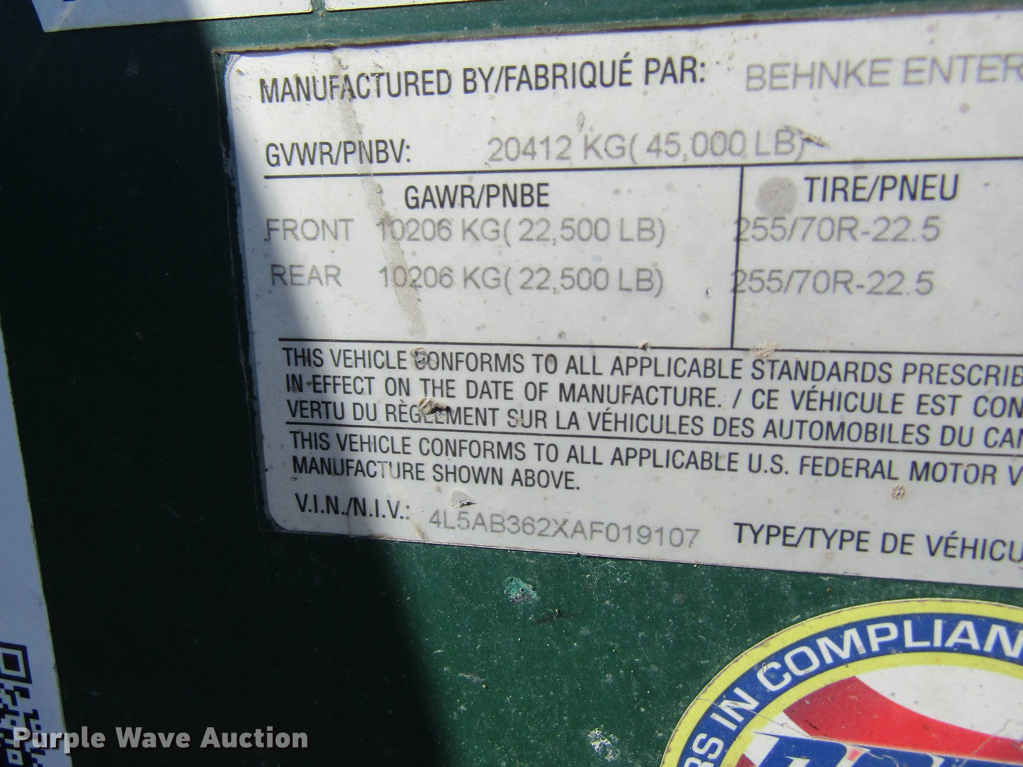 2010 Doyle dry fertilizer tender trailer. Benhke B-B DDT24 trailer frame, 34'L x 102"W, Doyle tender box (3) compartments, 20'L x 10" diameter auger, Kubota four cylinder diesel engine 1,093 hours on meter, Hydraulic lever controls, Roll tarp, Rear ladder, Steel construction, Fifth wheel plate, Dual leg landing gear, Spring suspension, Air brakes, Tandem axle, Steel wheels, 255/70R22.5 tires, GVWR 45,000 lbs, Unit# 47. Missouri title. 4L5AB362XAF019107. Bartlett Grain Company. 503 E Thomas Dr. Waverly, MO 64096