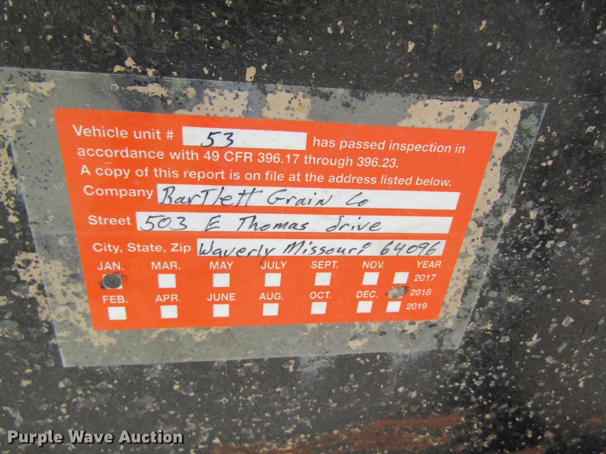 1998 Behnke nurse tank trailer. 22'L x 8'W, 1,800 gallon stainless steel tank, Honda GX390 gas engine, Toolbox, Wood deck, Steel construction, Pin hitch, Single leg landing gear, Spring suspension, Electric brakes, Tandem axle, Steel wheels, 285/75R17.5 tires, Unit# 53. Missouri title. Bartlett Grain Company. 503 E Thomas Dr. Waverly, MO 64096
