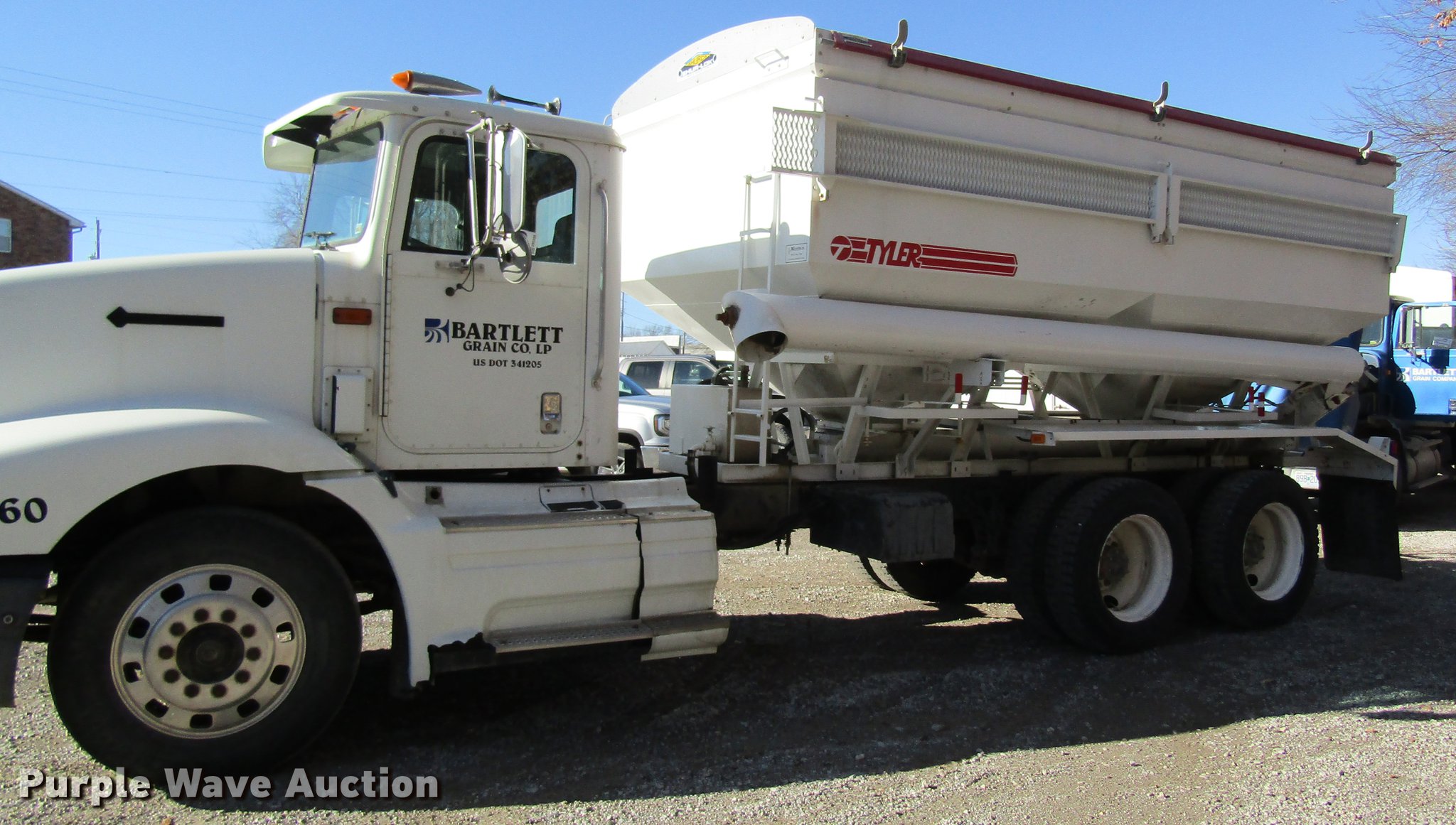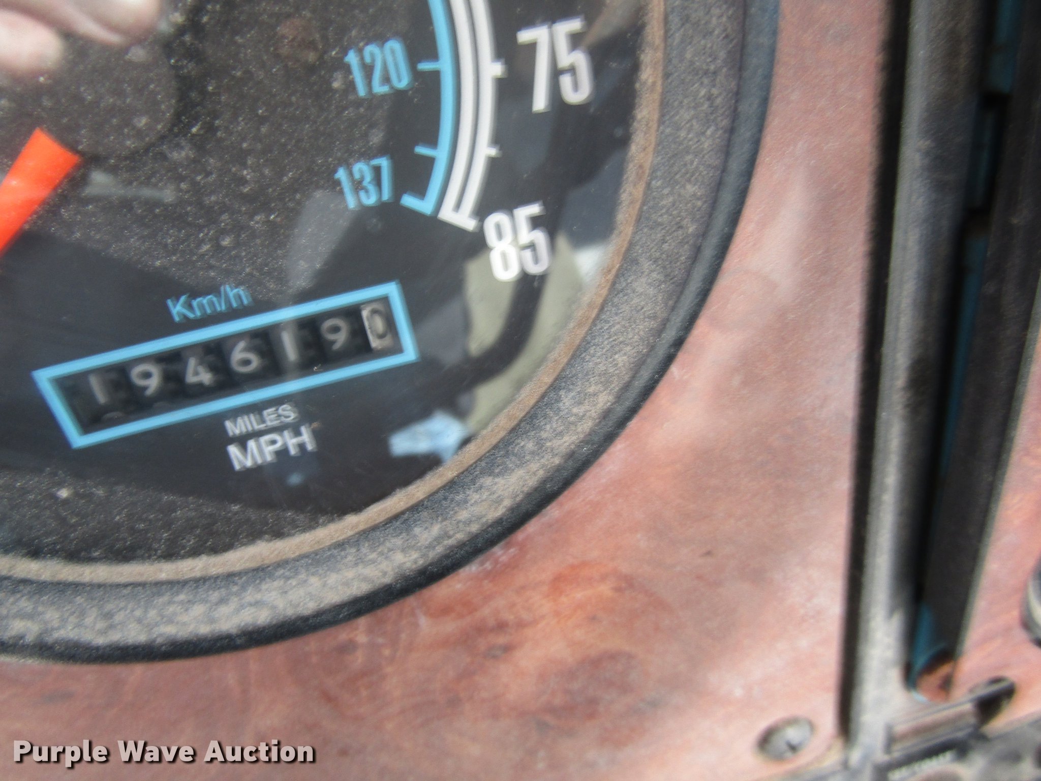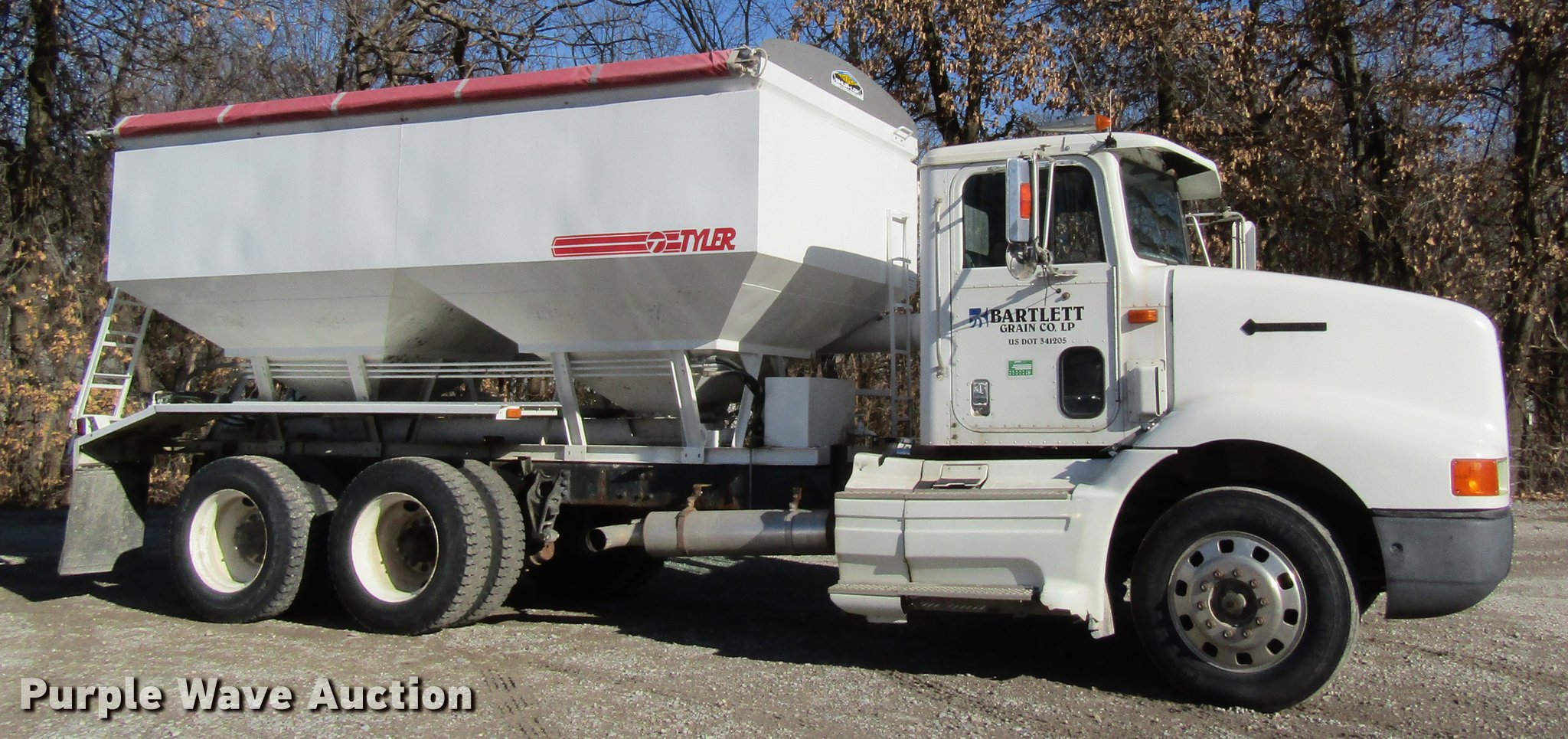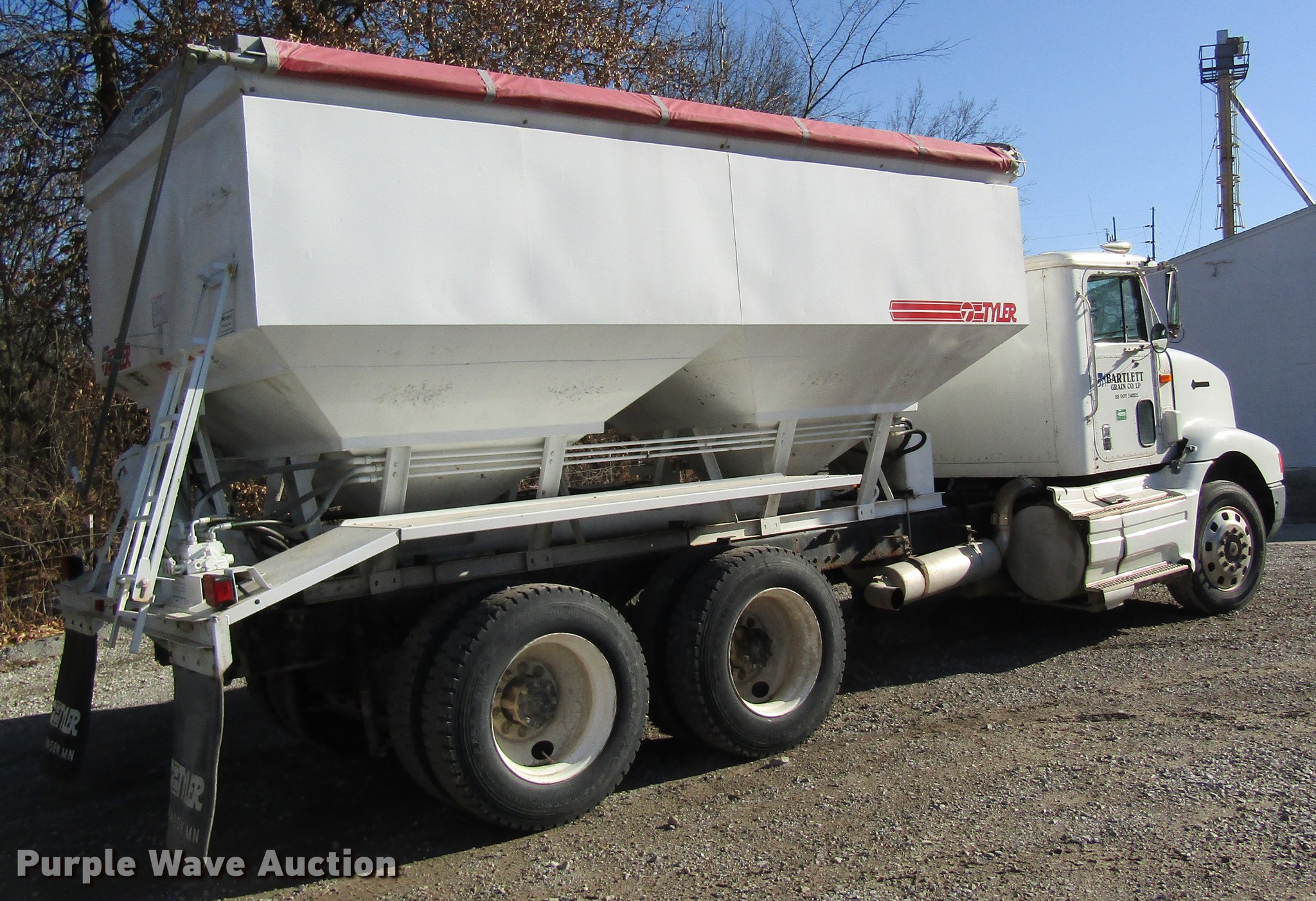 Purple Wave is selling a used Fertilizer or Feed Delivery Truck in Missouri. This item is a 1994 International 9200 dry fertilizer tender truck with the following: 194,619 miles on odometer, Detroit Diesel Series 60 six cylinder turbo diesel engine, 10 speed manual transmission, Inter-axle differential lock, Heat, AM/FM/cassette, Air suspension seat, Tyler tender box, 16'L x 8'W, (2) hoppers, 16'L x 9" diameter auger, Roll tarp, Ladder, Driver side bed ramps, Exterior visor, Single rear exhaust stack, Dual fuel tanks, Mud flaps, Spring suspension, 285/75R24.5 tires, GVWR 52,000 lbs, FAWR 12,000 lbs, IAWR 20,000 lbs, RAWR 20,000 lbs, Tank covering damaged, Dash damaged, CB not included, Unit# 60