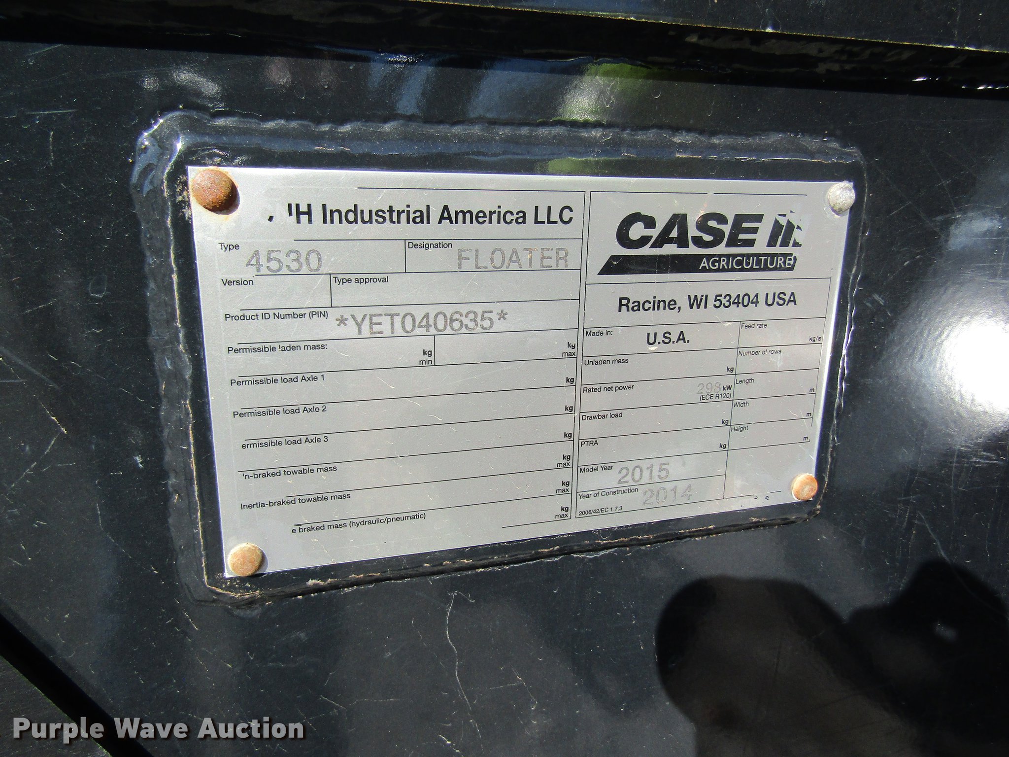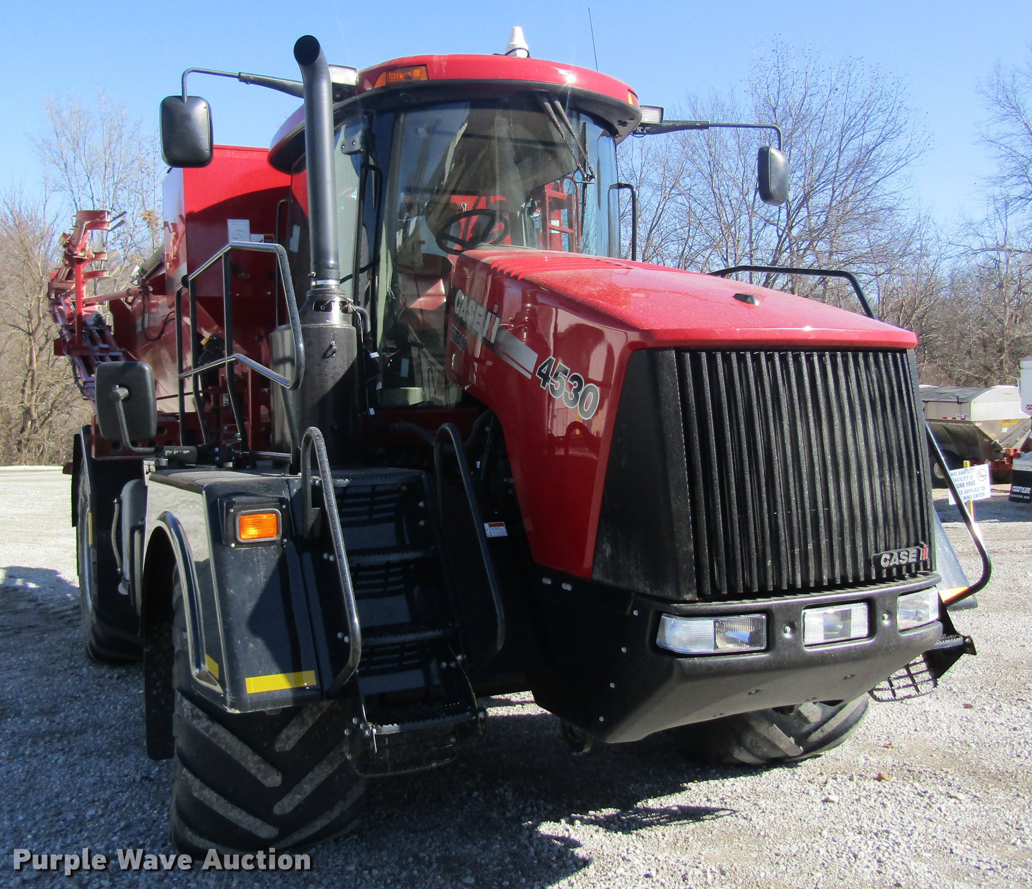 Purple Wave is selling a used Applicator Self Propelled in Missouri. This item is a 2015 Case IH Titan 4530 self-propelled dry applicator with the following: 1,733 engine hours on meter, Case FPT F2CFE614DA 8.7L six cylinder turbo diesel engine, 400 HP, Allison 3000 RDS automatic transmission, 6 speed, 2-speed auxiliary, AC and heat, AM/FM, Air suspension seat, Work lights, Backup camera, Raven Viper 4 GPS monitor, GPS receiver, Sling Shot field hub, Case IH 810 Flex-Air triple product dry fertilizer spreader bed, 70'W boom, Four boom sections, Hydraulic boom fold, Serial YET040636, 750/50R26 front flotation tires, 1050/50R32 rear flotation tires, CB not included, Five year or 3,000 hour drive train warranty, Includes engine, $250 deductible per occurrence, Serial YET040635