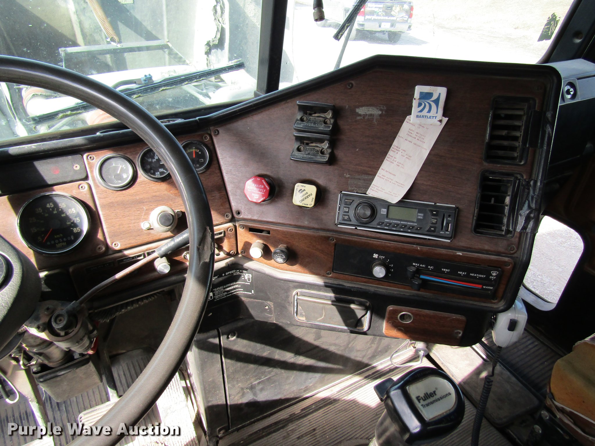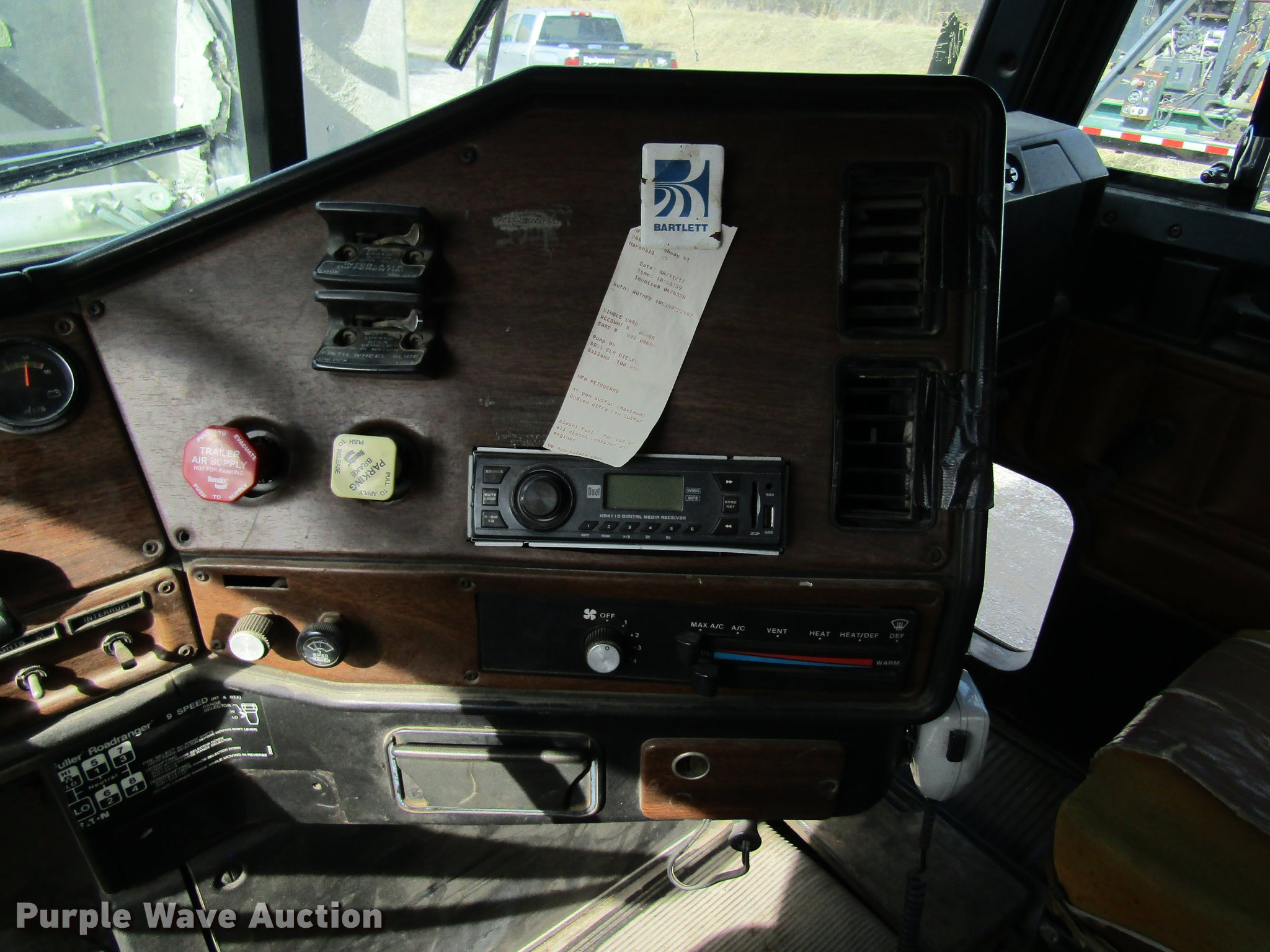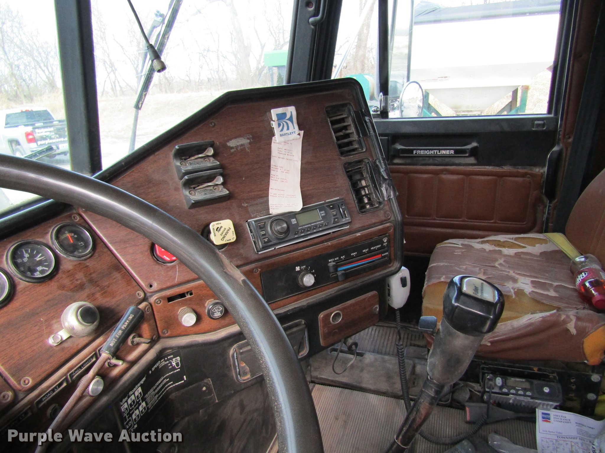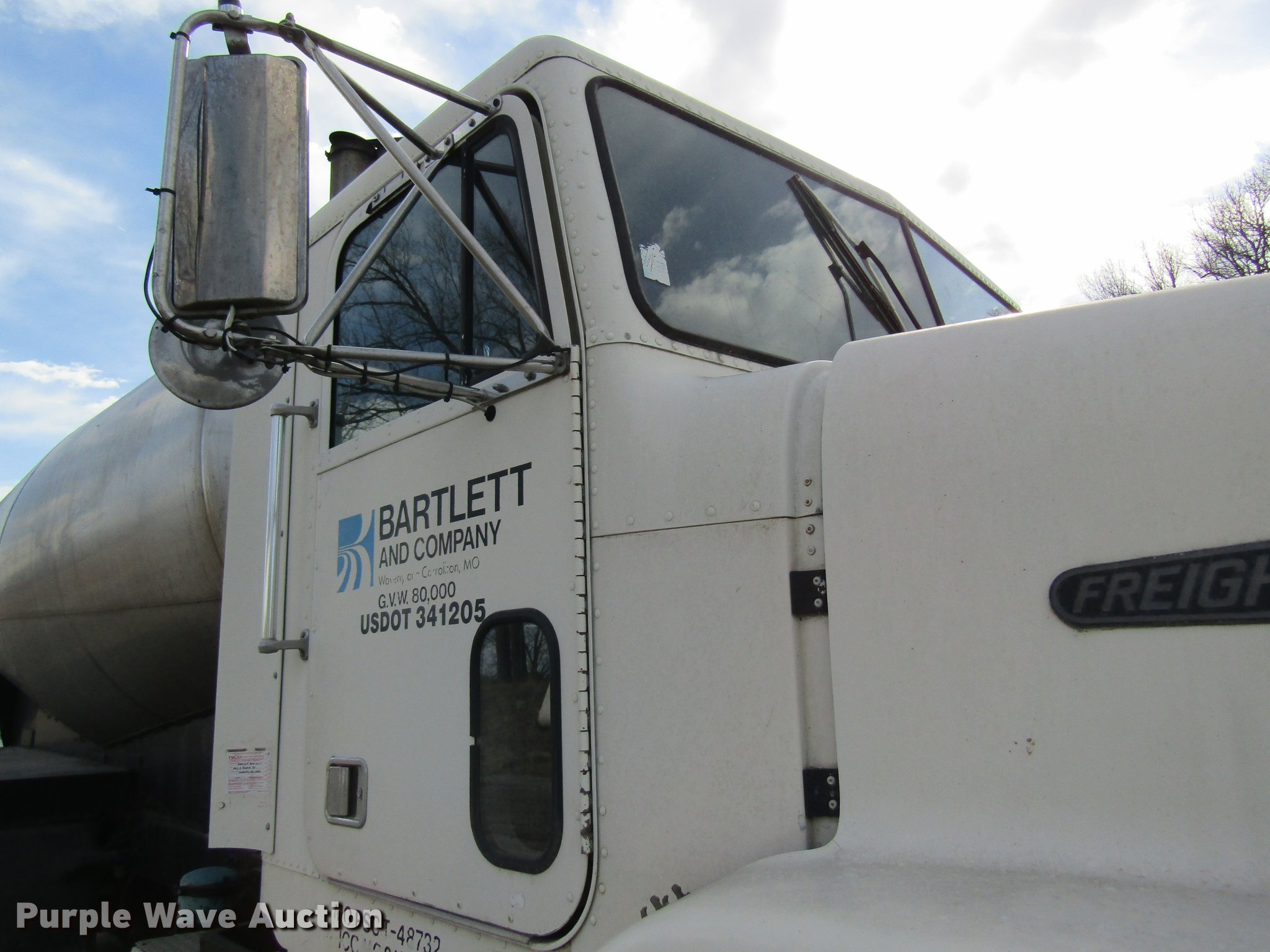 1989 Freightliner FLD120 nurse tank truck. 680,560 miles on odometer, Caterpillar 3406 14.6L L6 turbo diesel engine, Eaton Fuller Road Ranger nine speed manual transmission, Tandem axle, Heat, AM/FM, Air suspension seat, PTO, Single exhaust stack, Tiona tank bed 2,400 gallon capacity, Side and rear discharge, 3" rear outlet, Top fill, Sight tube, Ladder, Single fuel tank, Pintle hitch, Trailer wiring, Air suspension, Air brakes, 11R24.5 tires, CB not included, Unit# 20. Missouri title. 1FUYDRYBXKP339420. Bartlett Grain Company. 503 E Thomas Dr. Waverly, MO 64096