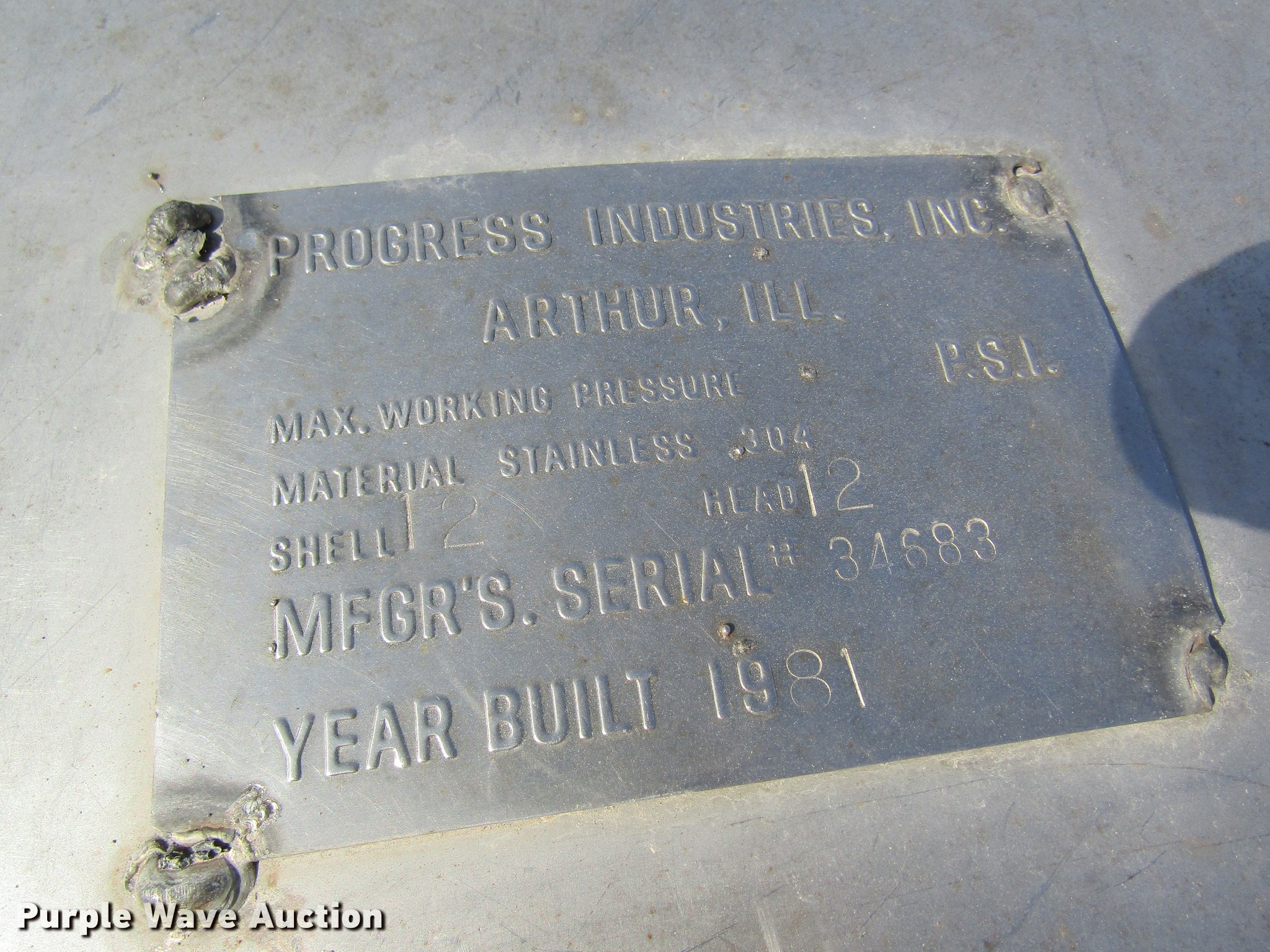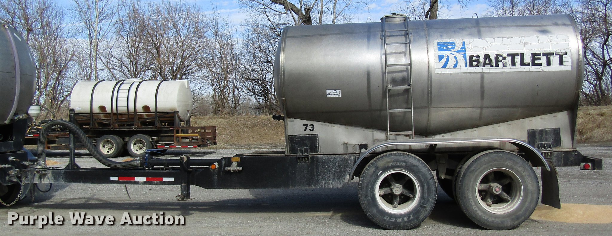 Purple Wave is selling a used Tank Trailer in Missouri. This item is a 1980 shop built nurse tank trailer with the following: 28.5'L x 92"W, 1981 Progress Ind. stainless steel tank, 2,600 gallon capacity, Side ladder, Steel construction, Pintle hitch, Single leg two speed landing gear, Spring suspension, Air brakes, Tandem axle, 11R22.5 tires, Unit# 73