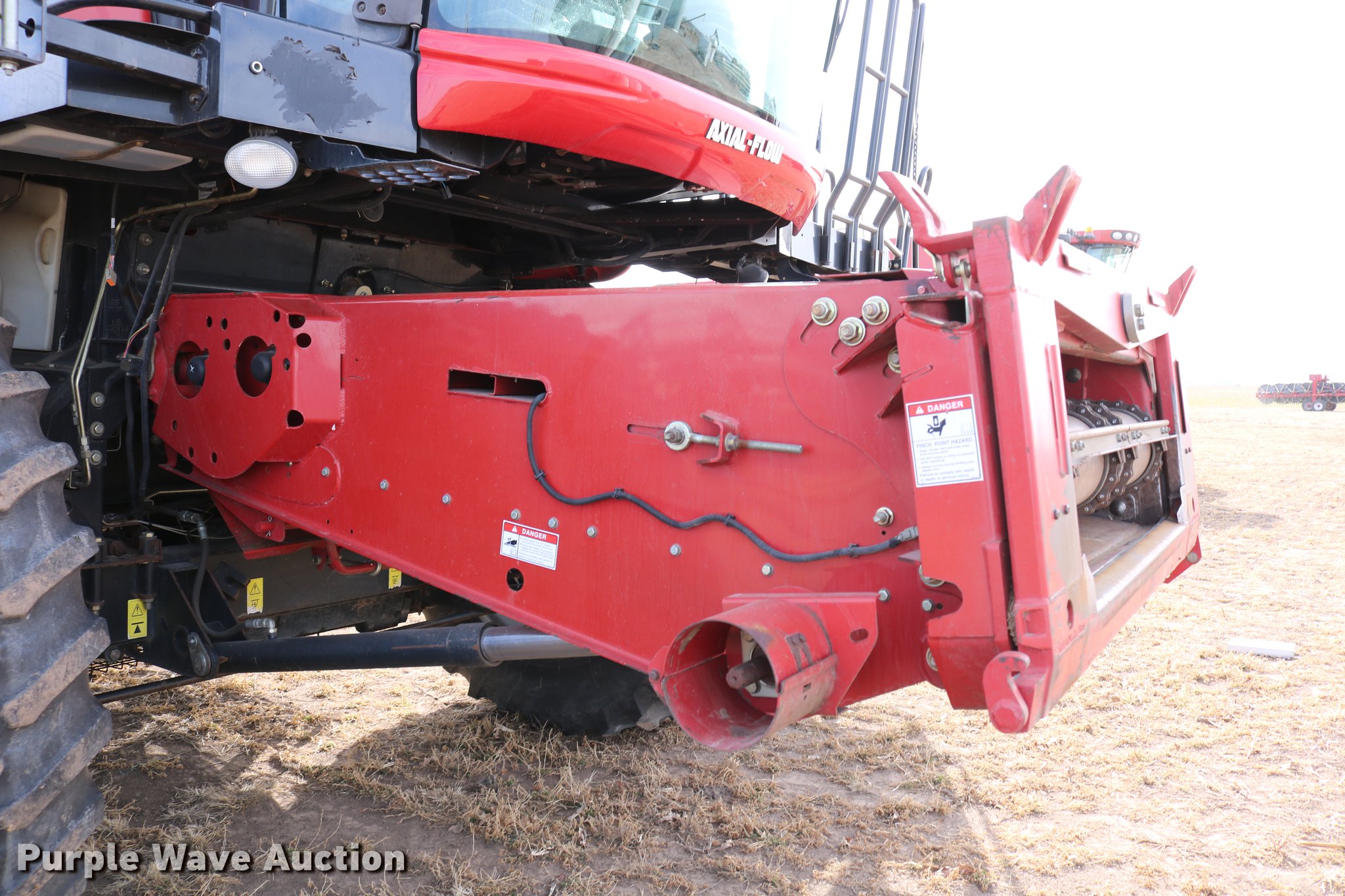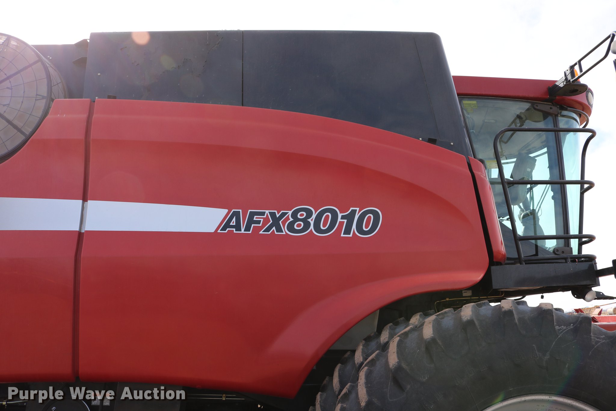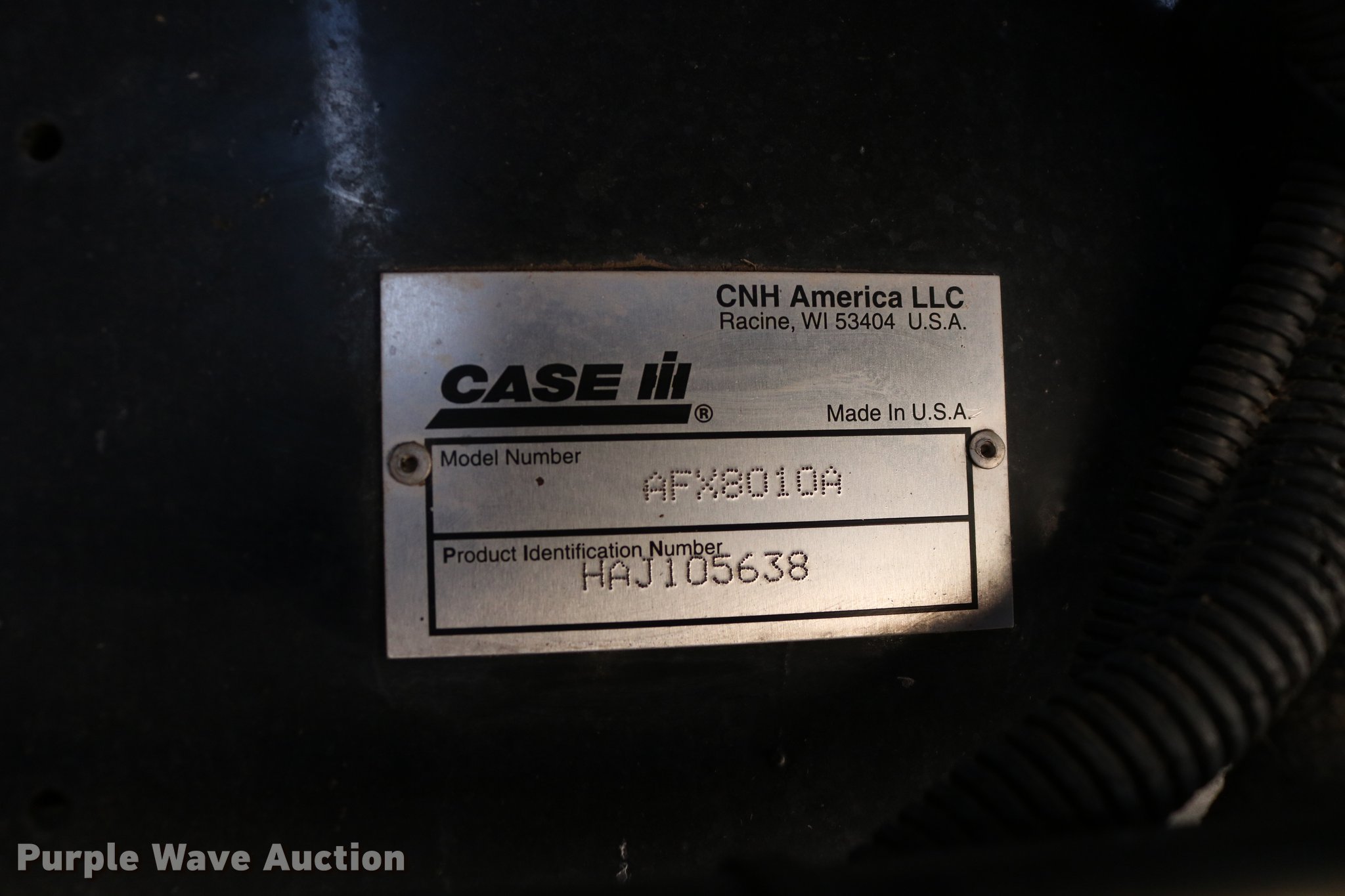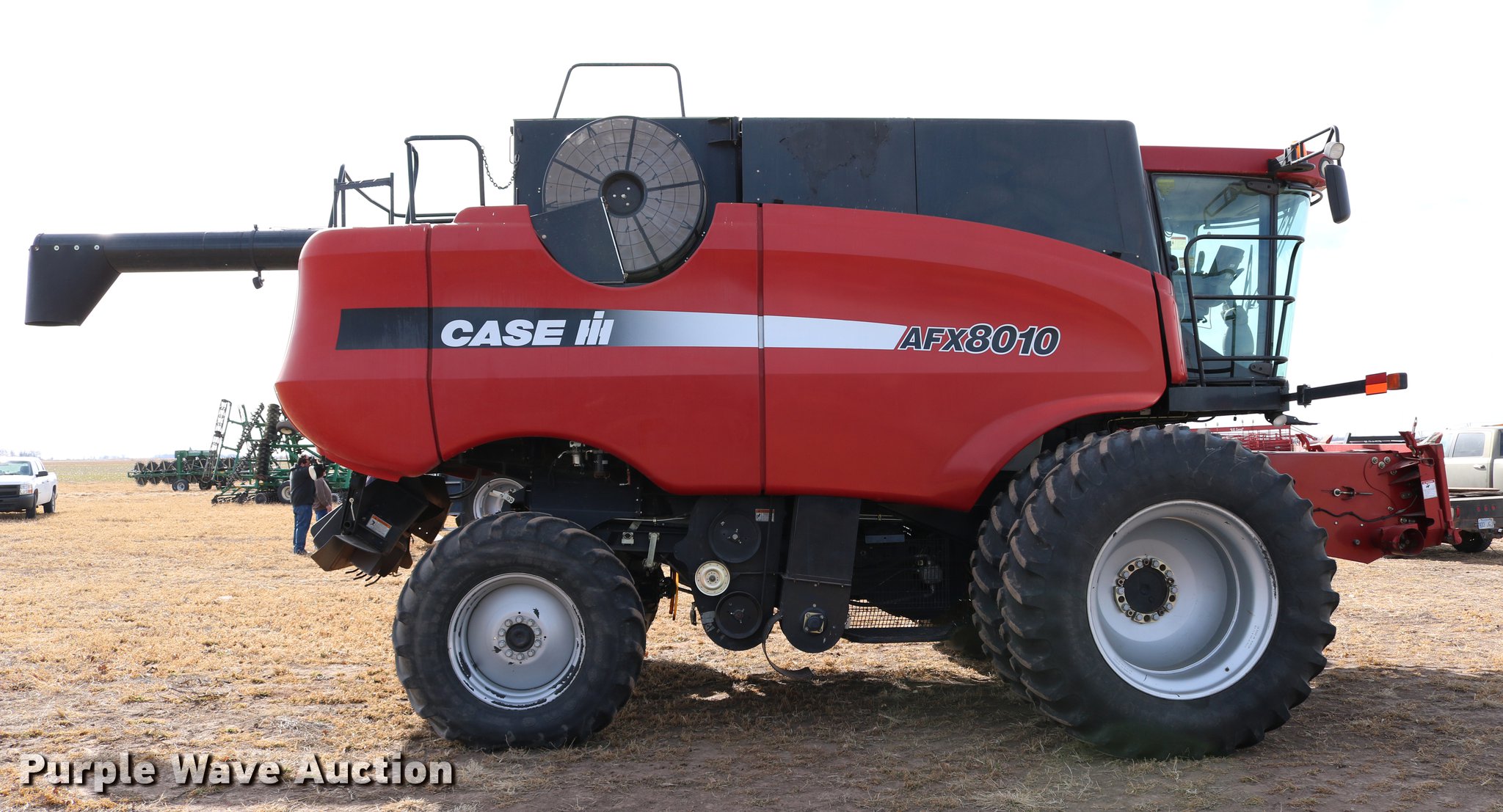 Purple Wave is selling a used Combine in Kansas. This item is a 2004 Case IH AFX 8010 RWA combine with the following: 2,989 engine hours on meter, 2,012 separator hours on meter, Iveco F3AE0684M-BXXX 10.3L six cylinder turbo diesel engine, Hydrostatic transmission, 4F-4R gears, Feederhouse, Lateral tilt, Variable speed, Reverser, Single point header coupler, AC and heat, Tilt steering wheel, AM/FM, Instructor's seat, Shade, AFS Pro 600 monitor, Yield monitor, Round and small wire concaves, Three speed rotor, Chaff spreader, Bin extensions, 23'L unlaoding auger, Work lights, Rear hitch, 520/85R42 dual front tires, 540/65R30 rear tires, Serial HAJ105638