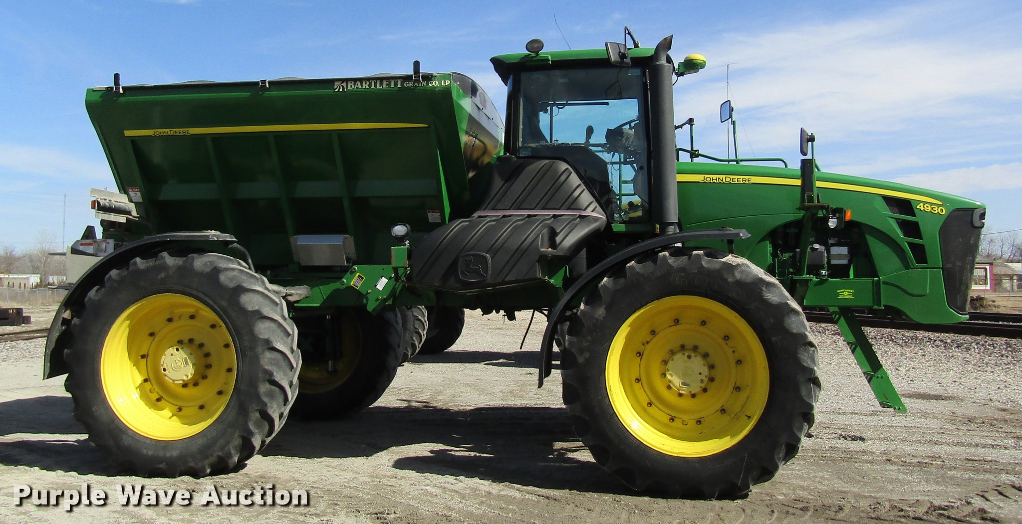 2011 John Deere 4930 self-propelled dry spreader applicator. 3,897 engine hours on meter, John Deere six cylinder turbo diesel engine, Hydrostatic transmission, Four wheel drive, AC and heat, AM/FM, Air suspension seat, StarFire iTC GPS receiver, Spray controls, Traction control, GreenStar ready, New Leader L3030G4-11 stainless steel dry fertilizer spreader bed Roll tarp, Hydraulic ladder, Fenders, 620/70R46 tires, CB not included, Serial 1N04930XLB0013593, Unit# 44. See Build Sheet for more information. View repairs. View industrial tires in this auction. Bartlett Grain Company. 725 S Main St. Carrollton, MO 64633
