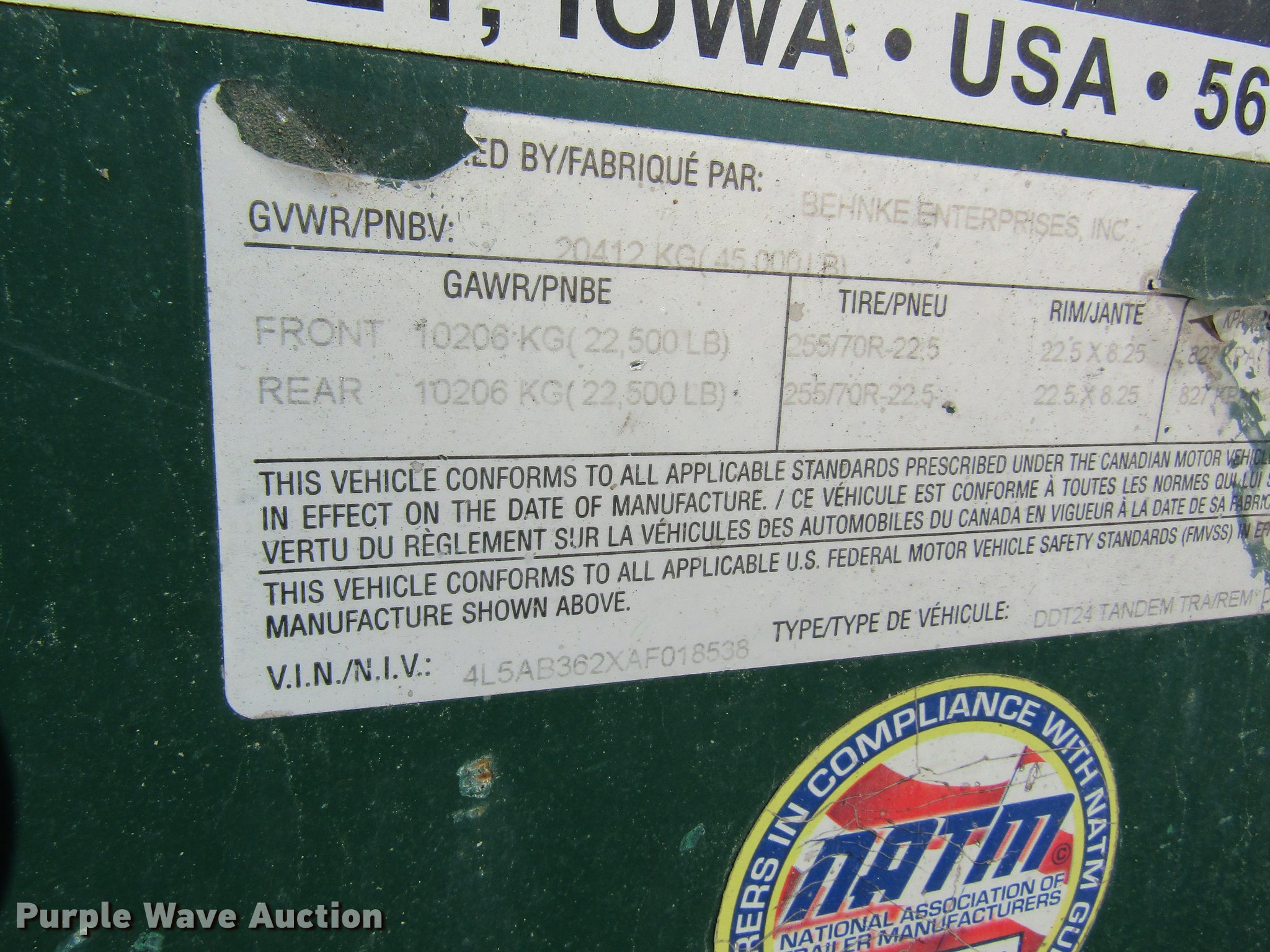 2010 Doyle dry fertilizer tender trailer. Benhke B-B DDT24 trailer frame, 34'L x 102"W, 112" side height, (3) compartments, 20'L x 9" diameter auger PTO driven, Roll tarp, Rear ladder, John Deere hydraulic motor, Fifth wheel plate, Single leg two speed landing gear, Spring suspension, Air brakes, Steel wheels, 255/70R22.5 tires, GVWR 45,000 lbs, Unit# 46. Missouri title. 4L5AB362XAF018538. Bartlett Grain Company. 503 E Thomas Dr. Waverly, MO 64096