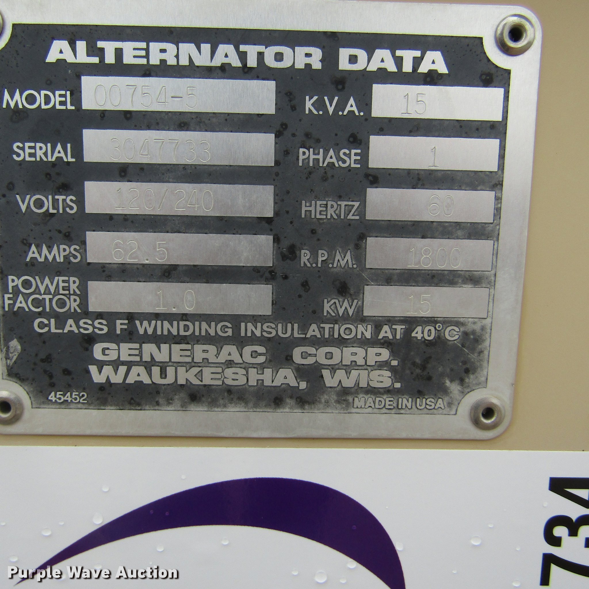 Purple Wave is selling a used Generator Set in Illinois. This item is a 1998 Generac 00754-5 generator with the following: 343 hours on meter, Fiat 1.6L four cylinder propane engine, 15 kW, Serial 97390, 1,800 RPM, Single phase, 120/240V, 15 kVA, 62.5 amps, 60 Hz, Block heater, Control panel, Built-in automatic transfer switch, Skid mounted, No battery, Serial 3047733