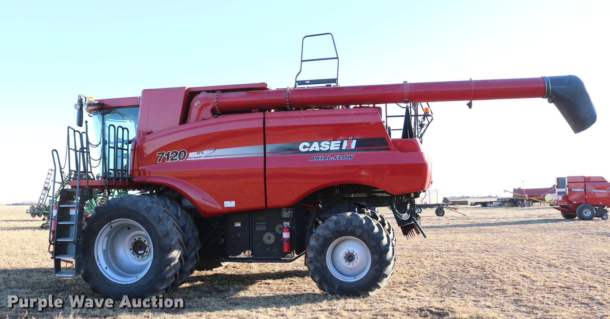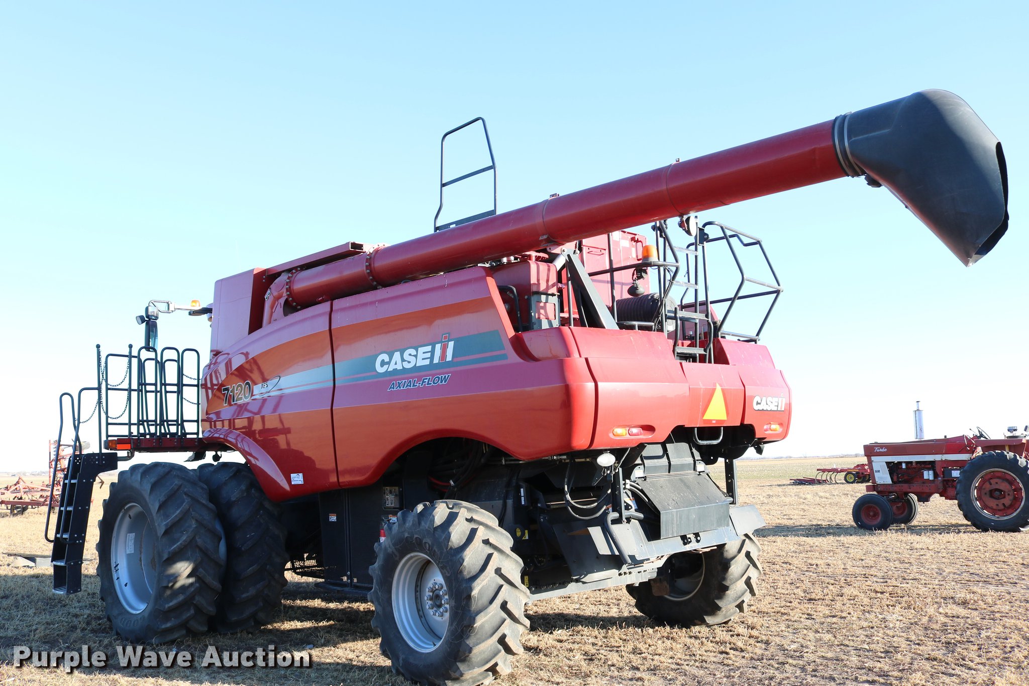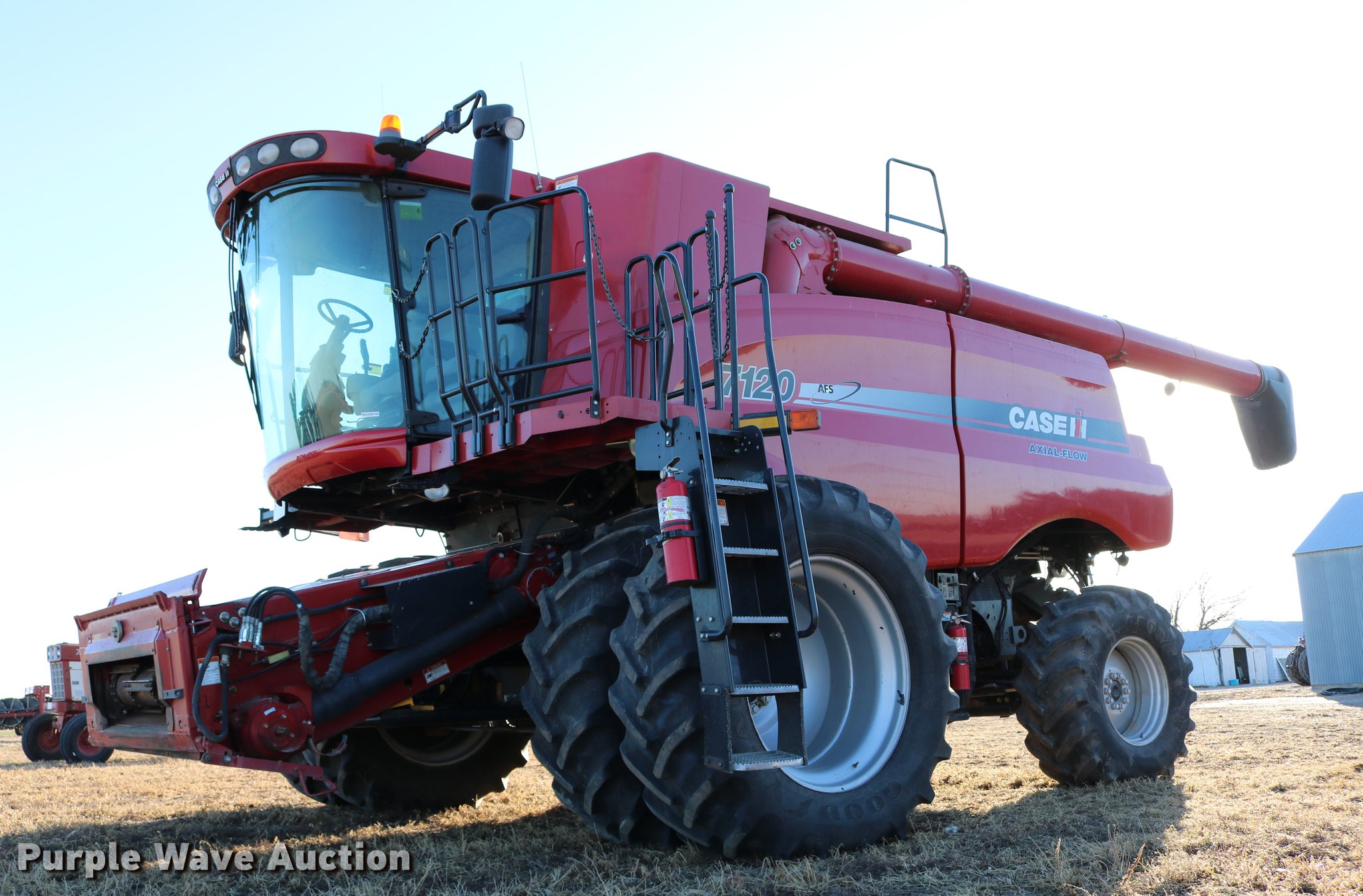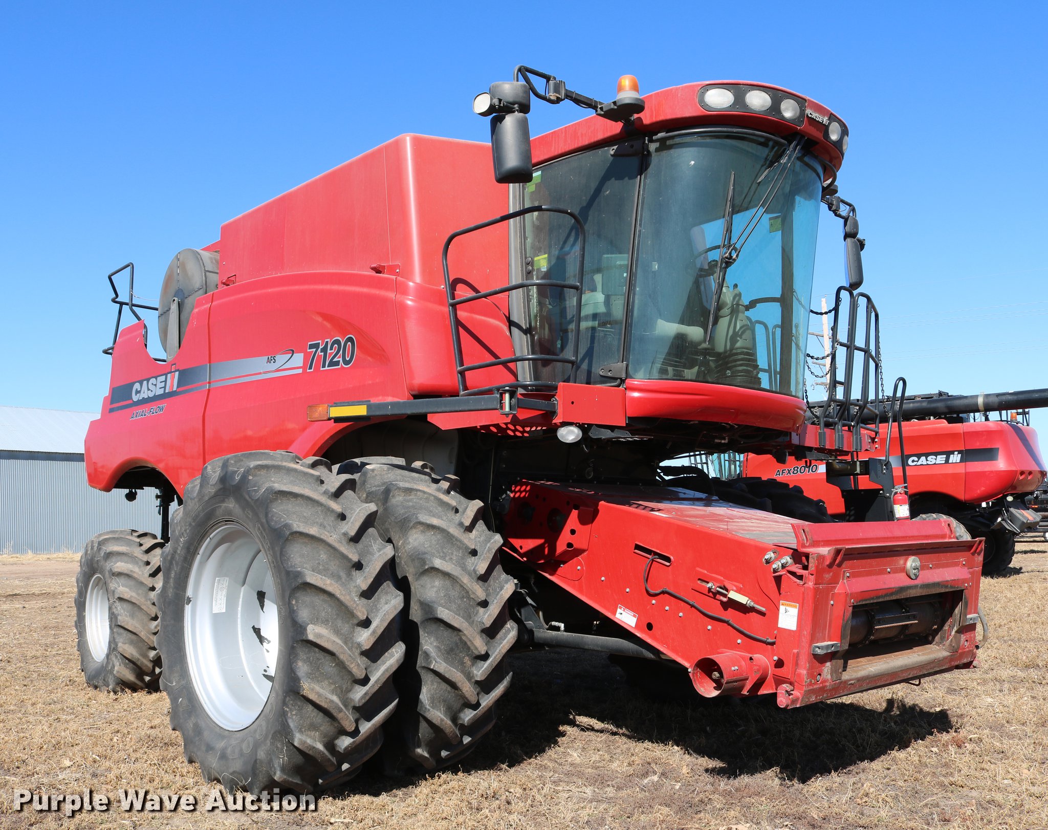 Purple Wave is selling a used Combine in Kansas. This item is a 2010 Case IH 7120 RWA combine with the following: 1,757 engine hours on meter, 1,297 separator hours on meter, Case IH six cylinder turbo diesel engine, Hydrostatic transmission, 4F-4R gears, Feederhouse, Lateral tilt, Variable speed, Reverser, Single point header coupler, AC and heat, Tilt steering wheel, AM/FM, Air suspension seat, Instructor's seat, Shade, Power and heated mirrors, AFS Pro 600 monitor, Yield monitor, Auto steer, Round concaves, Three speed rotor, Chaff spreader, Bin extensions, 21'L unloading auger, Work lights, 620/70R42 dual front tires, 600/65R28 rear tires, Serial YAG208738