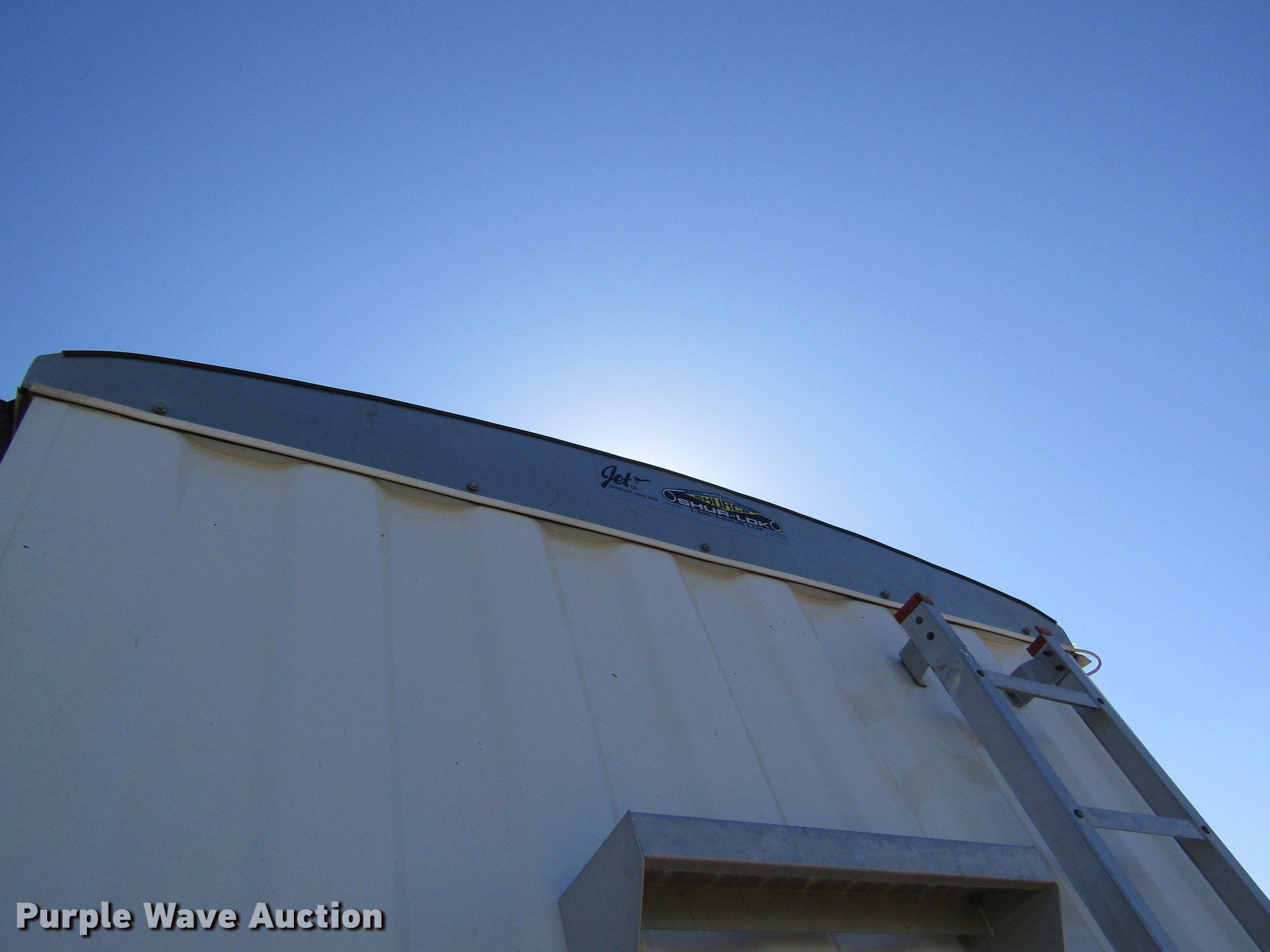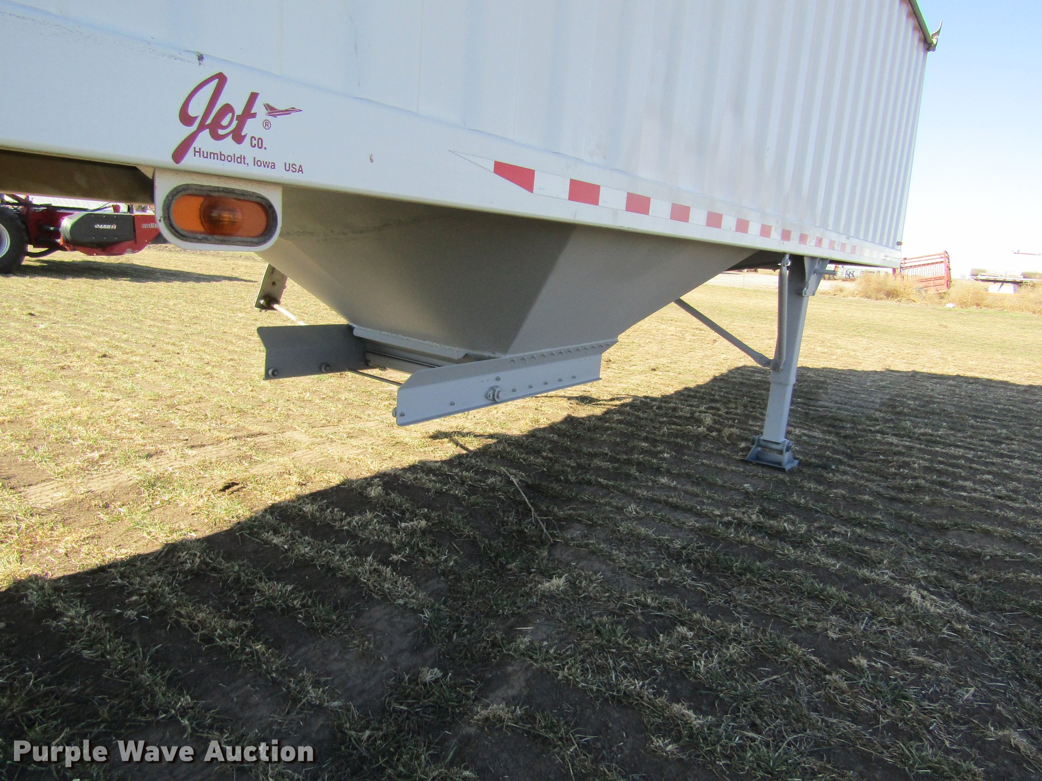 2005 Jet double hopper bottom grain trailer. 42'L x 96"W, 60" side height, Manual trap gates, Side chutes, Sight windows, Front and rear ladders, Front and rear platforms, Shurco Shur-Lok roll tarp, Steel construction, Fifth wheel plate, Dual leg two speed landing gear, Spring suspension, Air brakes, Tandem axle, Steel wheels, 11R24.5 tires, GVWR 68,000 lbs, GAWR 20,000 lbs. Kansas title. 5JNGS42245H000010. Sieker Ag, LLC Redirection Auction. Open inspection March 21 and 27. US 56 and 2nd Rd. Ellinwood, KS 67526