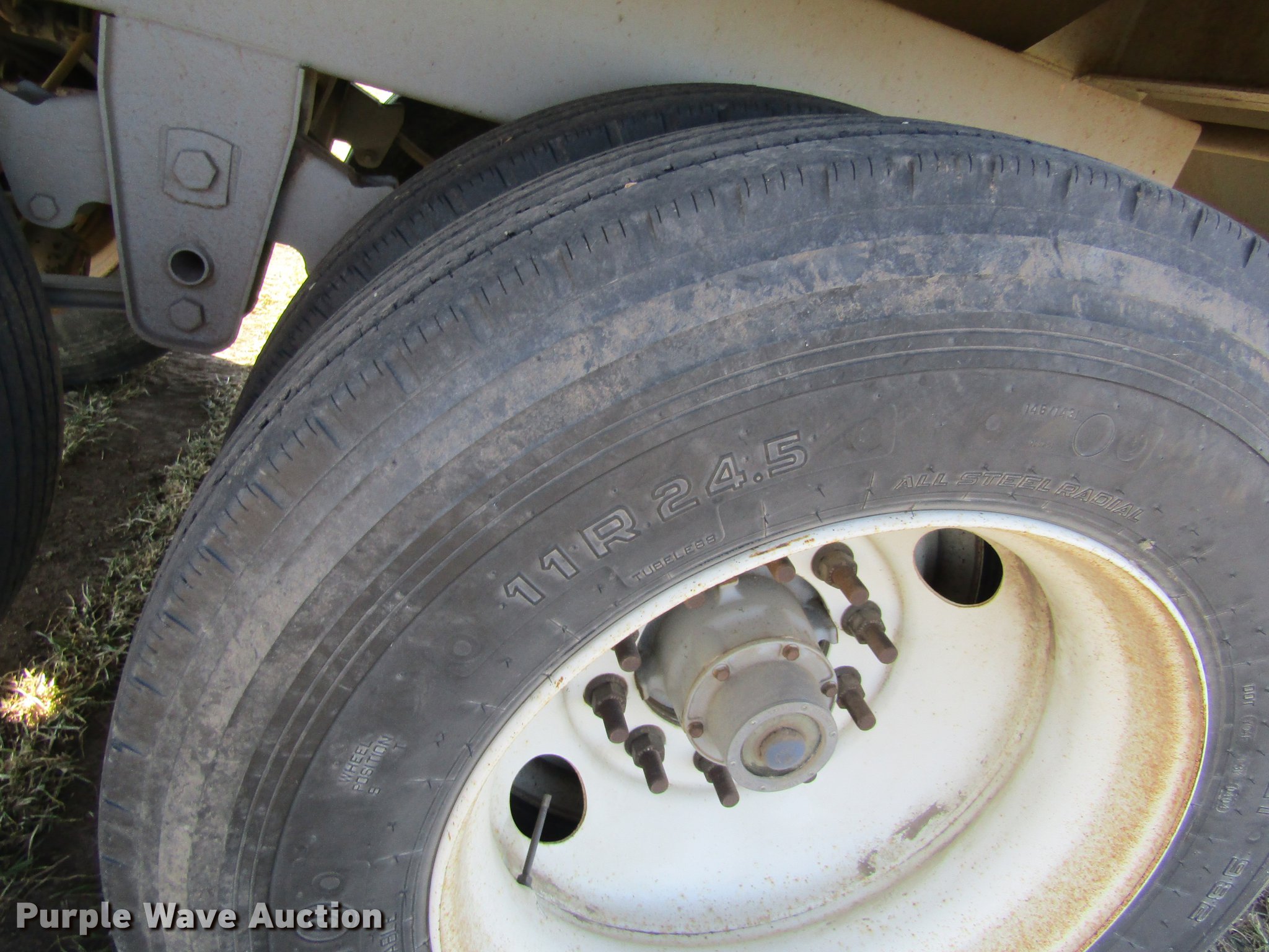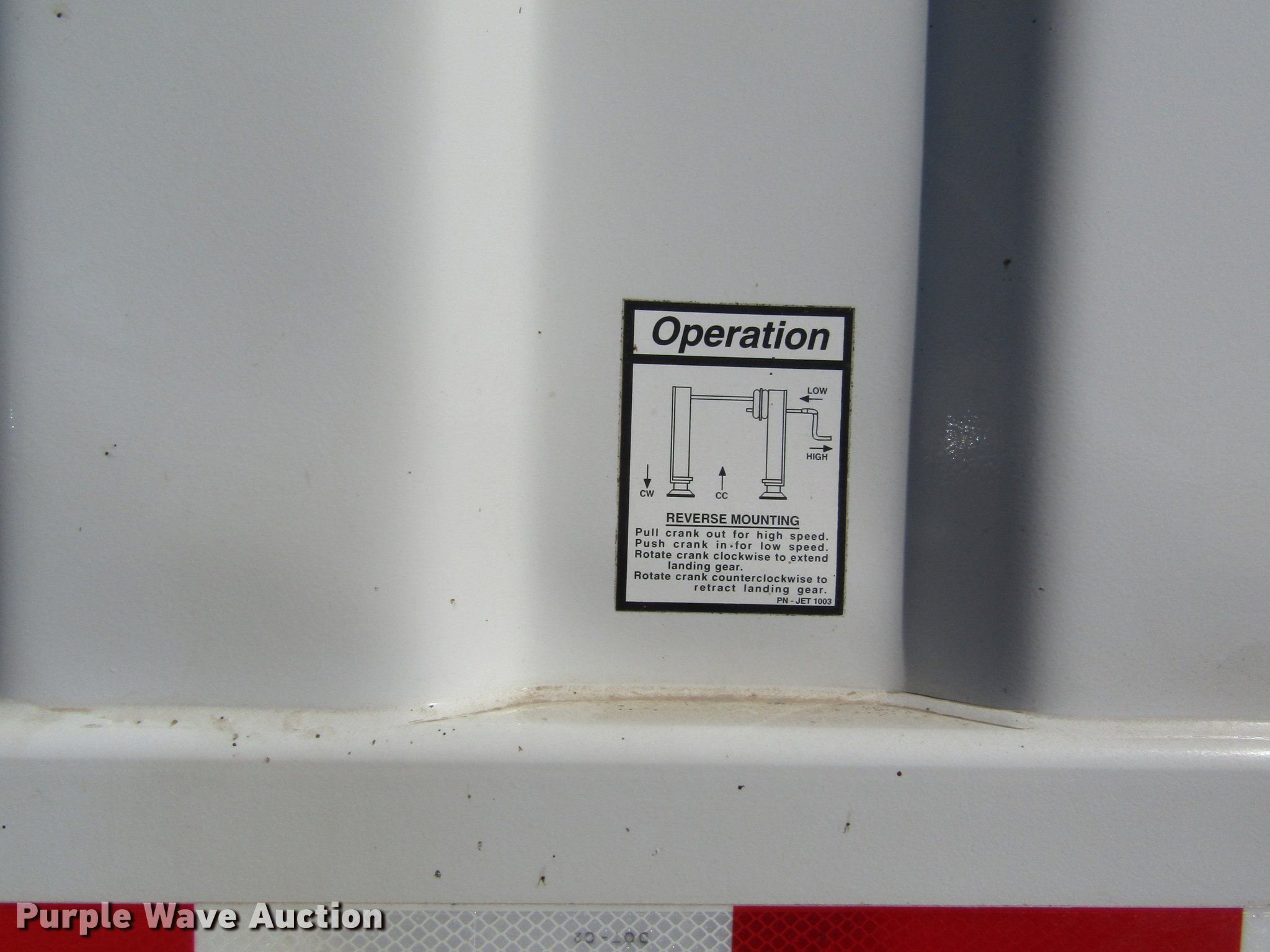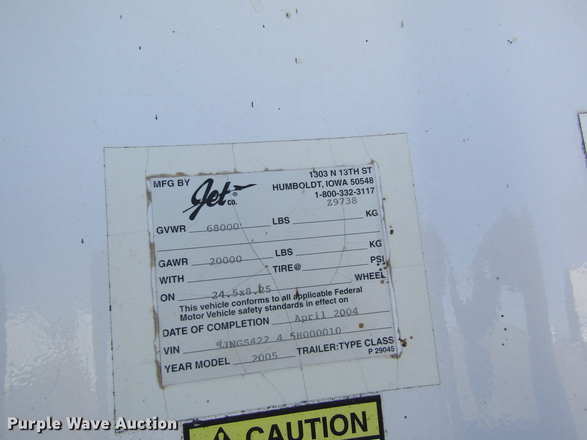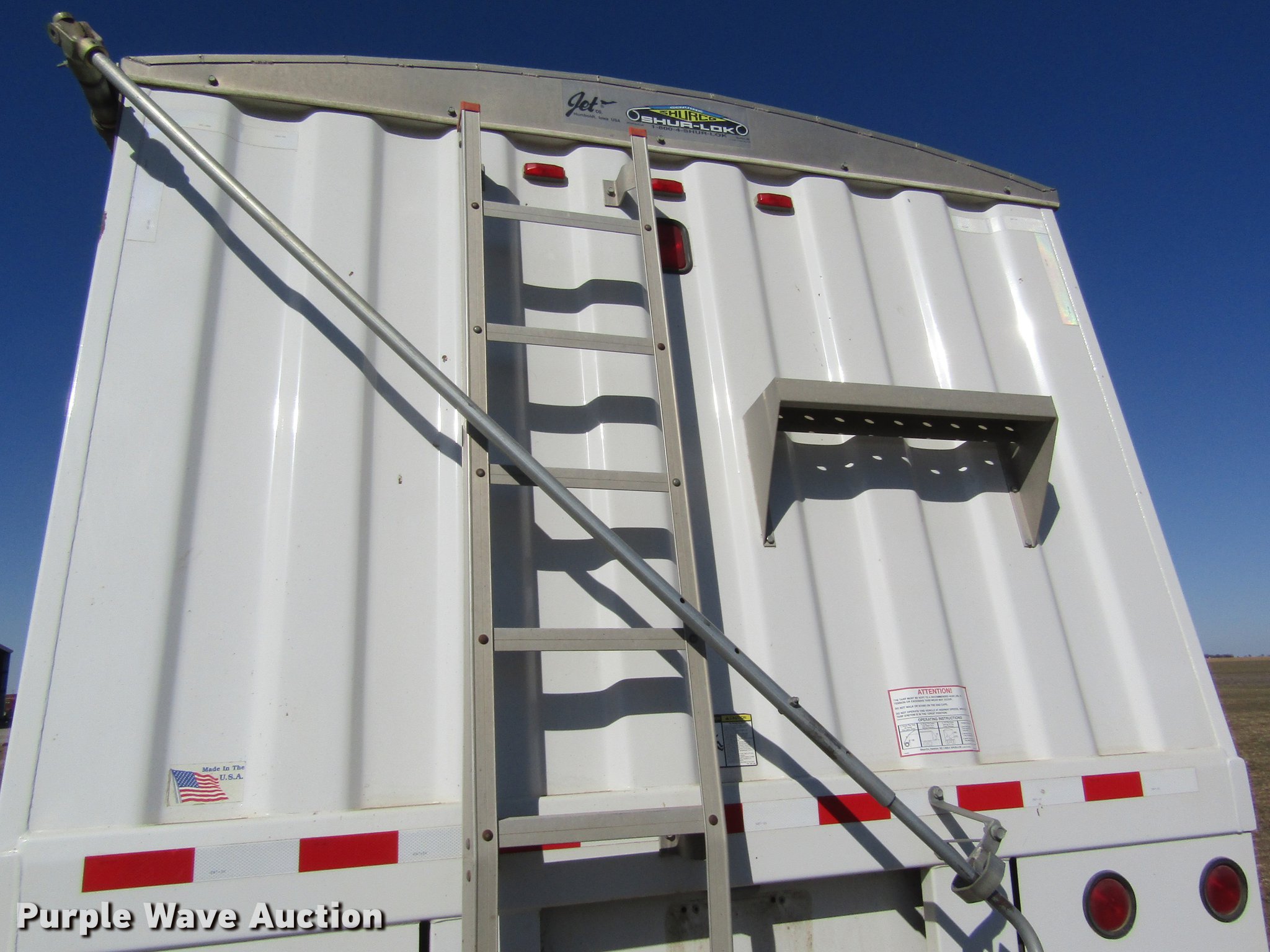 Purple Wave is selling a used Grain or Commodity Trailer in Kansas. This item is a 2005 Jet double hopper bottom grain trailer with the following: 42'L x 96"W, 60" side height, Manual trap gates, Side chutes, Sight windows, Front and rear ladders, Front and rear platforms, Shurco Shur-Lok roll tarp, Steel construction, Fifth wheel plate, Dual leg two speed landing gear, Spring suspension, Air brakes, Tandem axle, Steel wheels, 11R24.5 tires, GVWR 68,000 lbs, GAWR 20,000 lbs