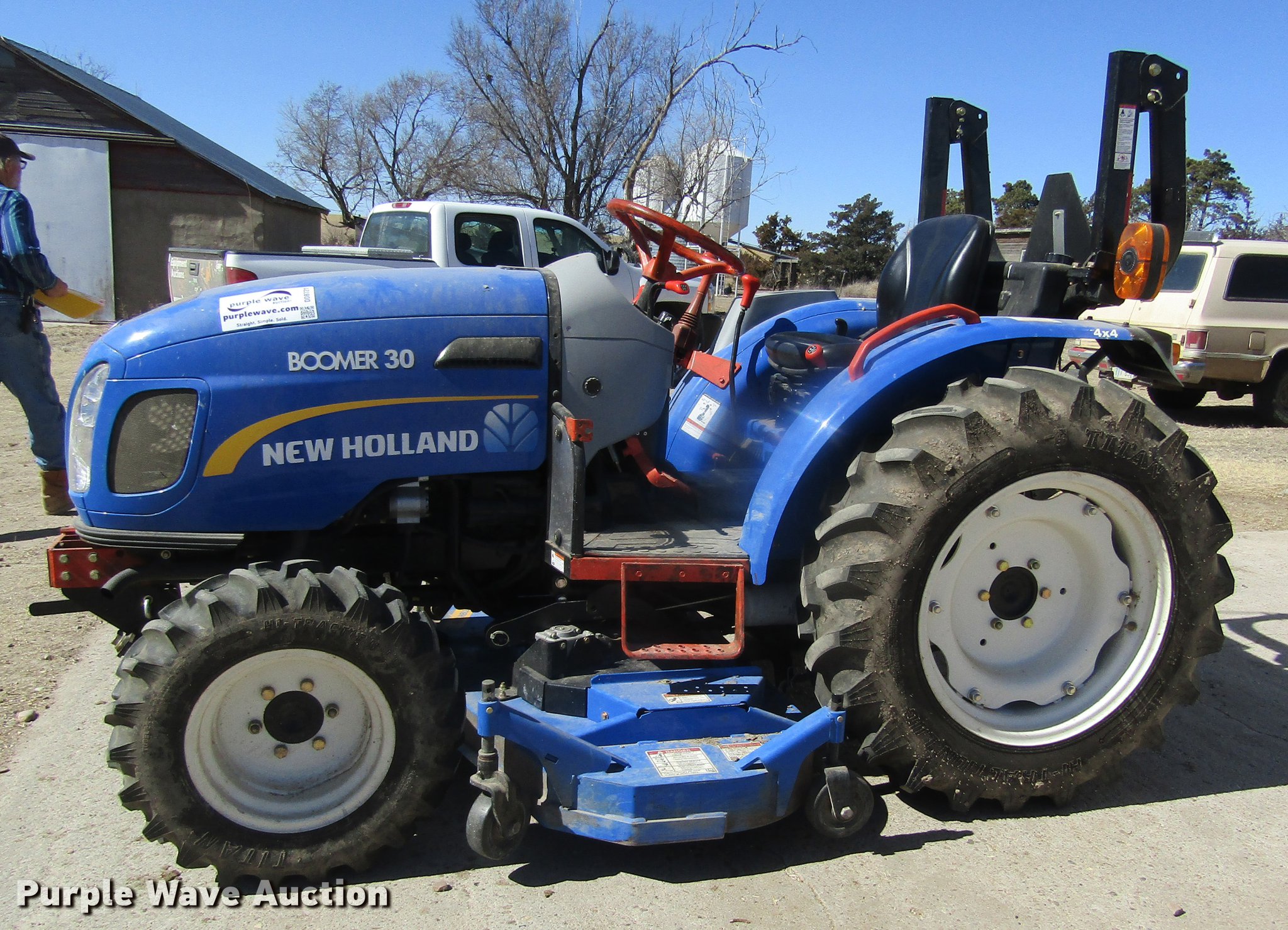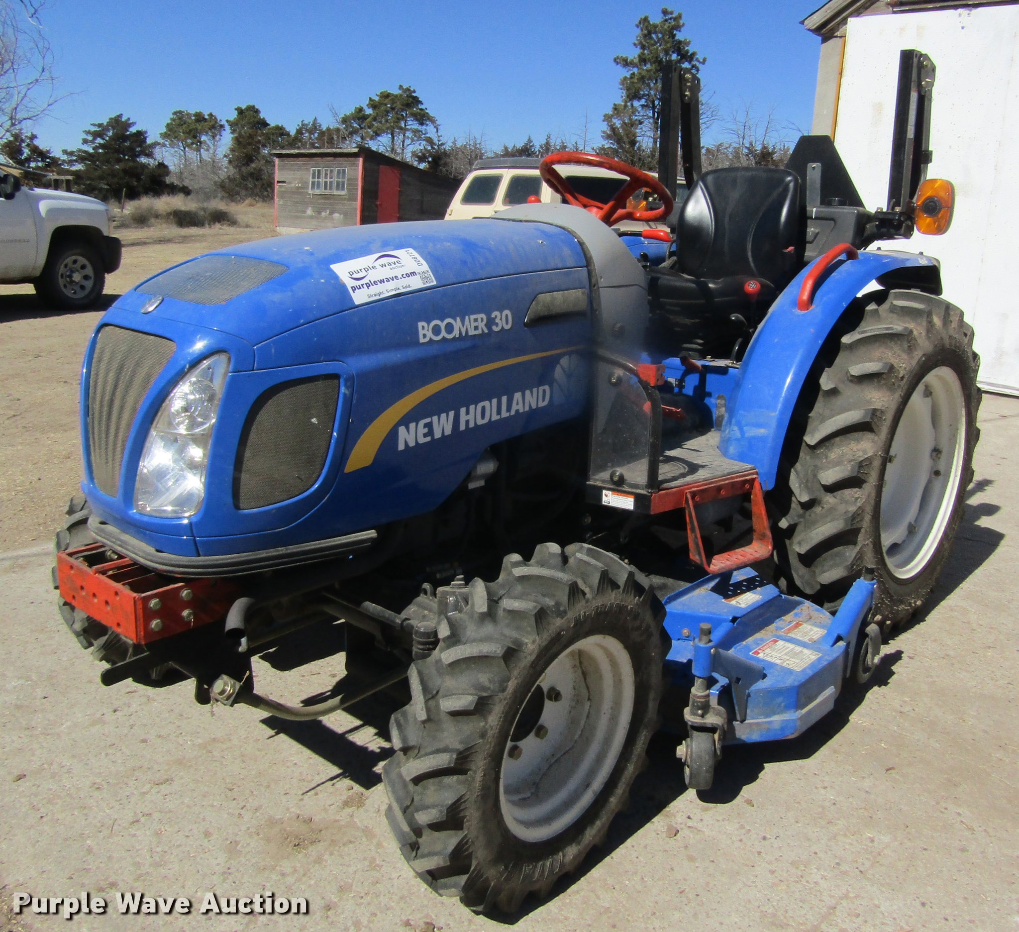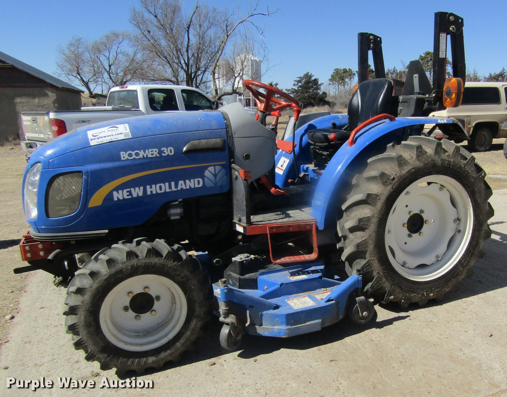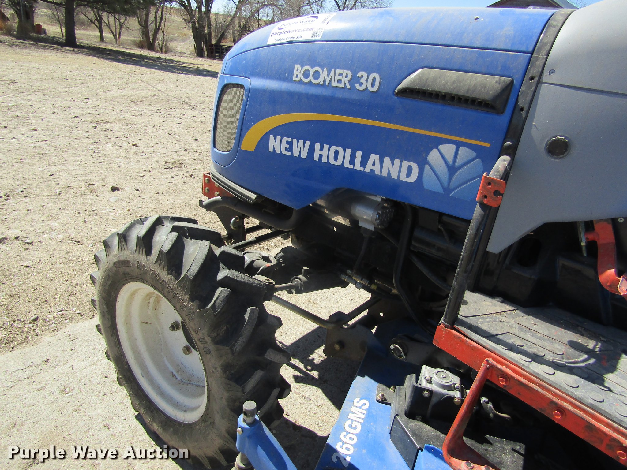 Purple Wave is selling a used Tractor in Kansas. This item is a 2012 New Holland Boomer 30 HFWD tractor with the following: 146 hours on meter, Mitsubishi S4L 1.5L four cylinder diesel engine, 28 HP, Serial 31A9307806, Synchro transmission, 12F-12R gears, Left-hand reverser, Differential lock, ROPS, Suspension seat, Three point, Top link, 540 PTO, Draw bar, (2) front hydraulic remote sets, Rear hydraulic remote set, New Holland 266GMS mower deck, 66"W, 66" wheelbase, 7-14R front tires, 11.2-24 rear tires, Manuals, Serial 2107013994
