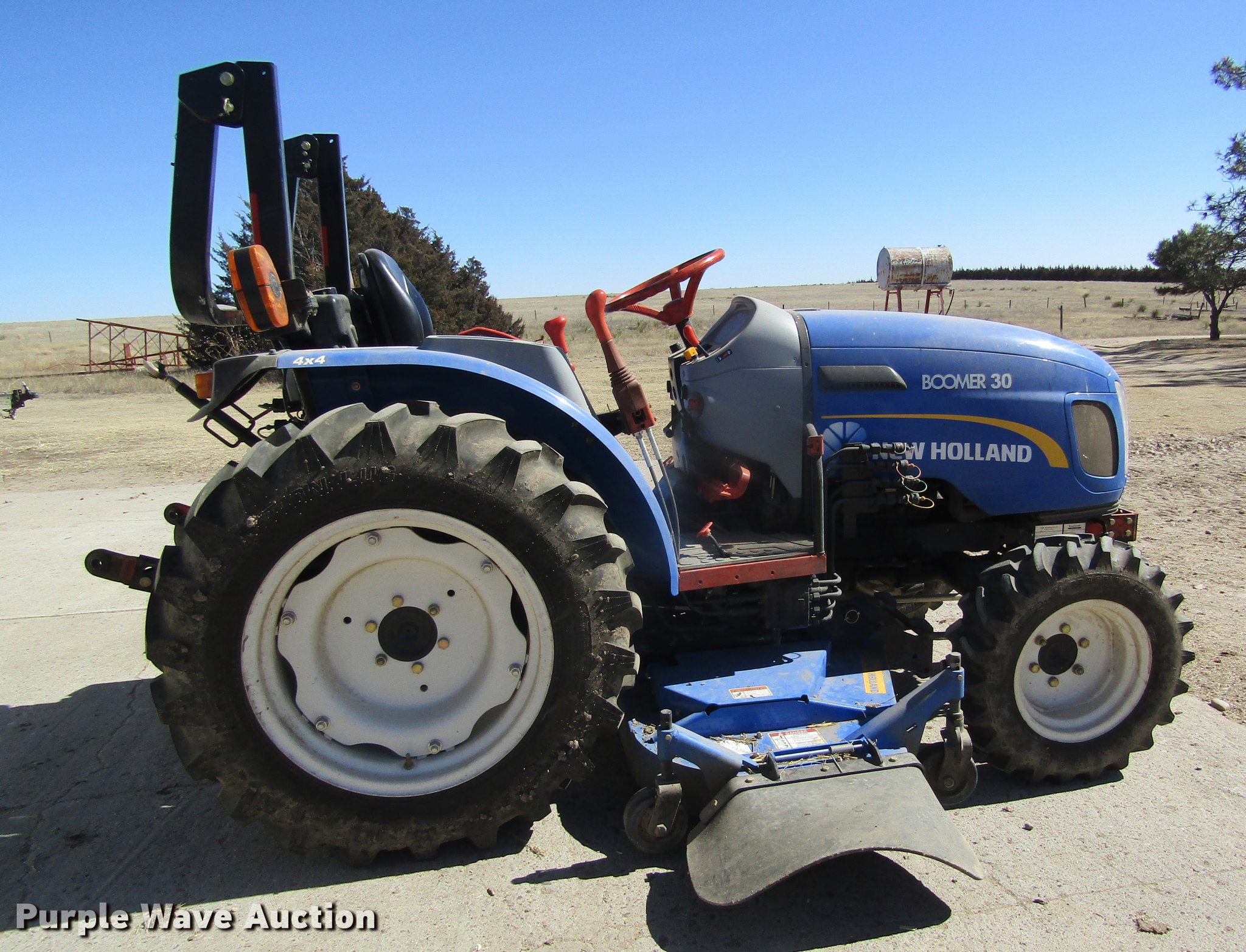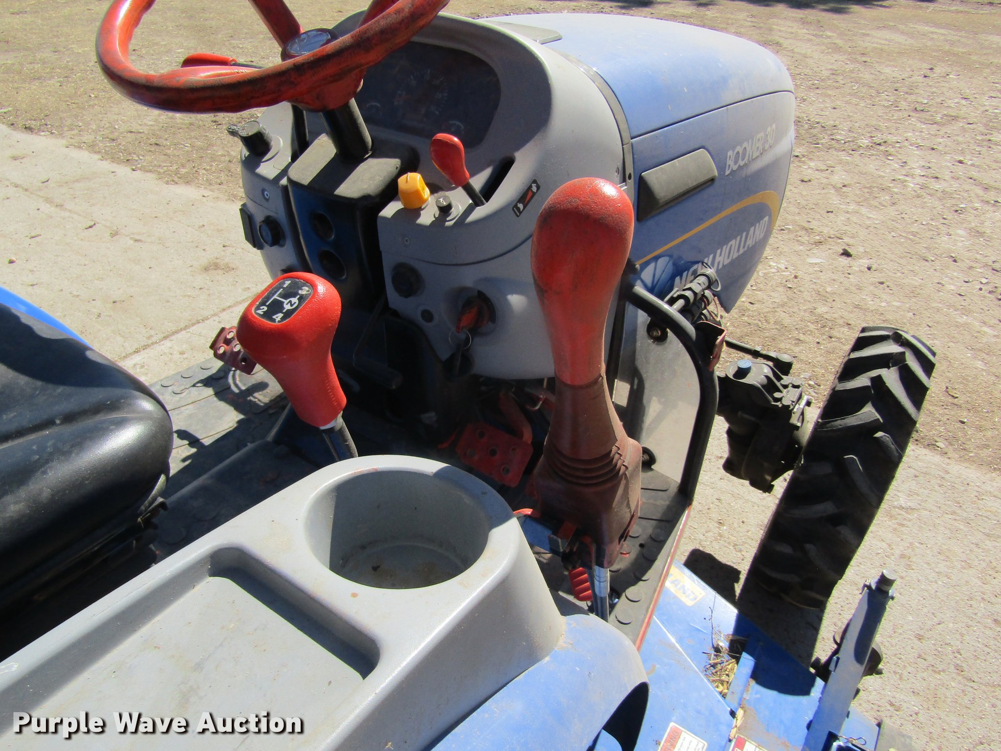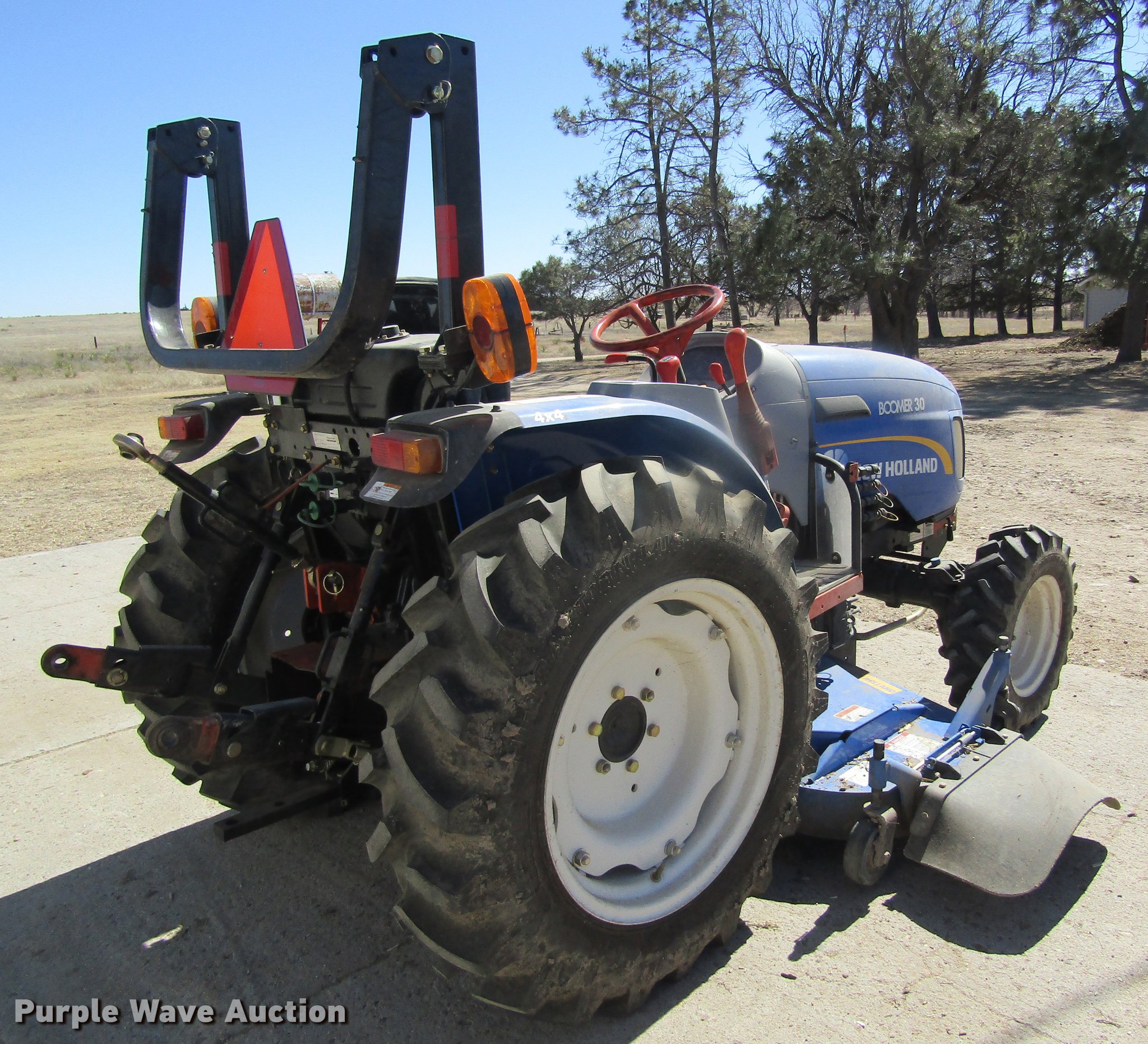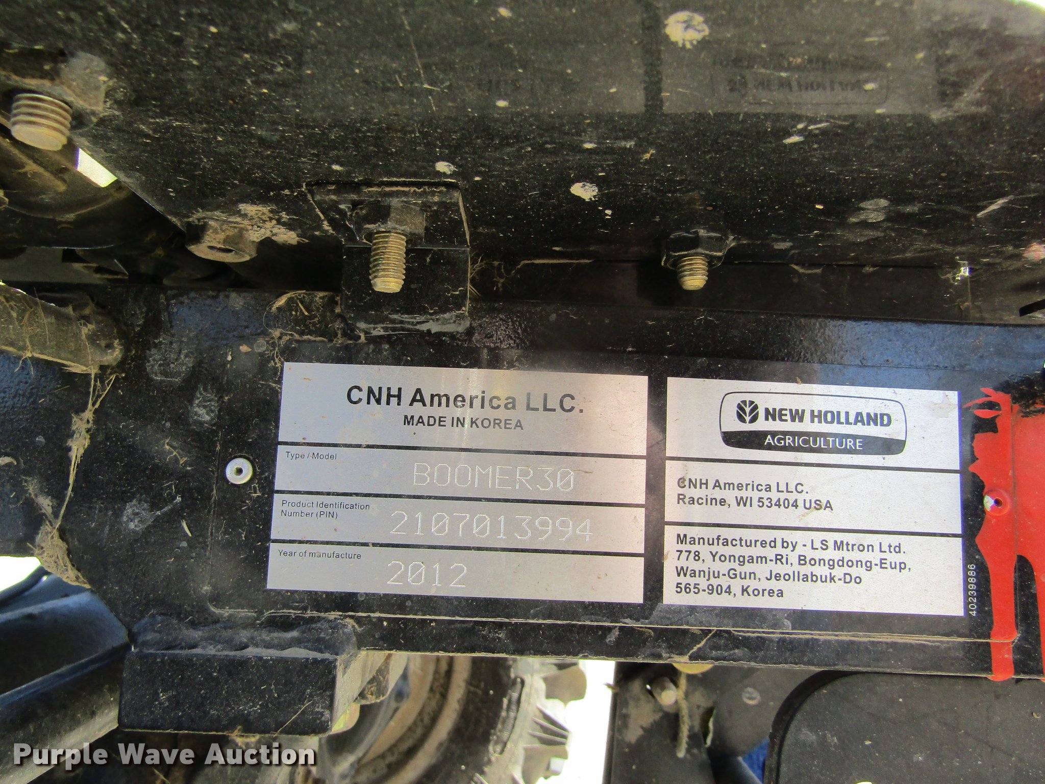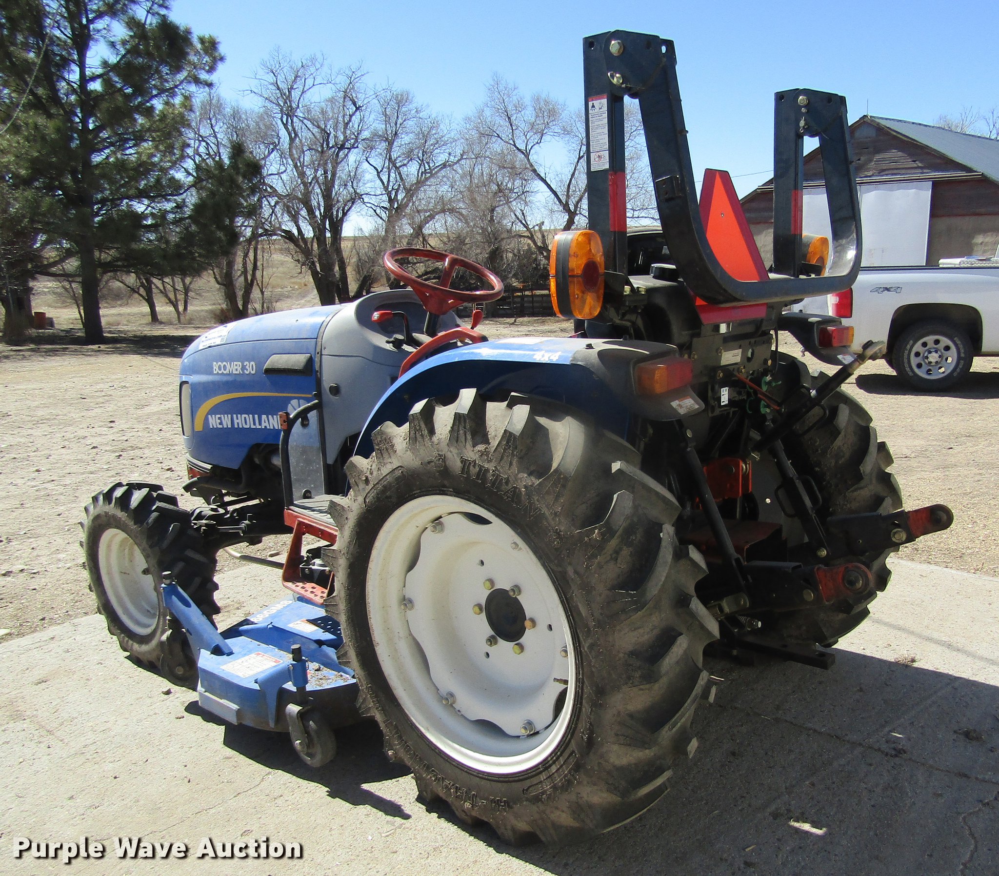 Purple Wave is selling a used Tractor in Kansas. This item is a 2012 New Holland Boomer 30 HFWD tractor with the following: 146 hours on meter, Mitsubishi S4L 1.5L four cylinder diesel engine, 28 HP, Serial 31A9307806, Synchro transmission, 12F-12R gears, Left-hand reverser, Differential lock, ROPS, Suspension seat, Three point, Top link, 540 PTO, Draw bar, (2) front hydraulic remote sets, Rear hydraulic remote set, New Holland 266GMS mower deck, 66"W, 66" wheelbase, 7-14R front tires, 11.2-24 rear tires, Manuals, Serial 2107013994