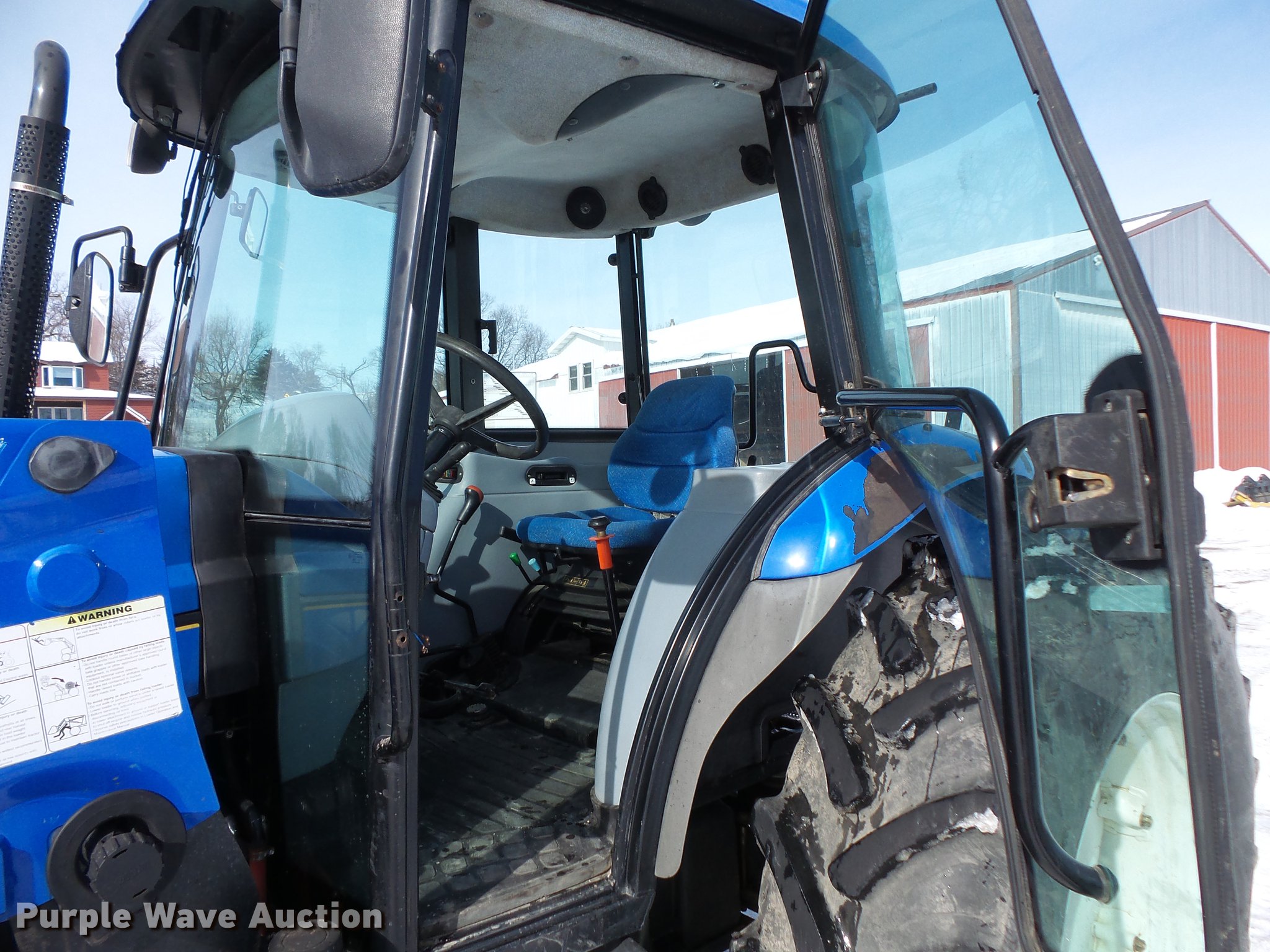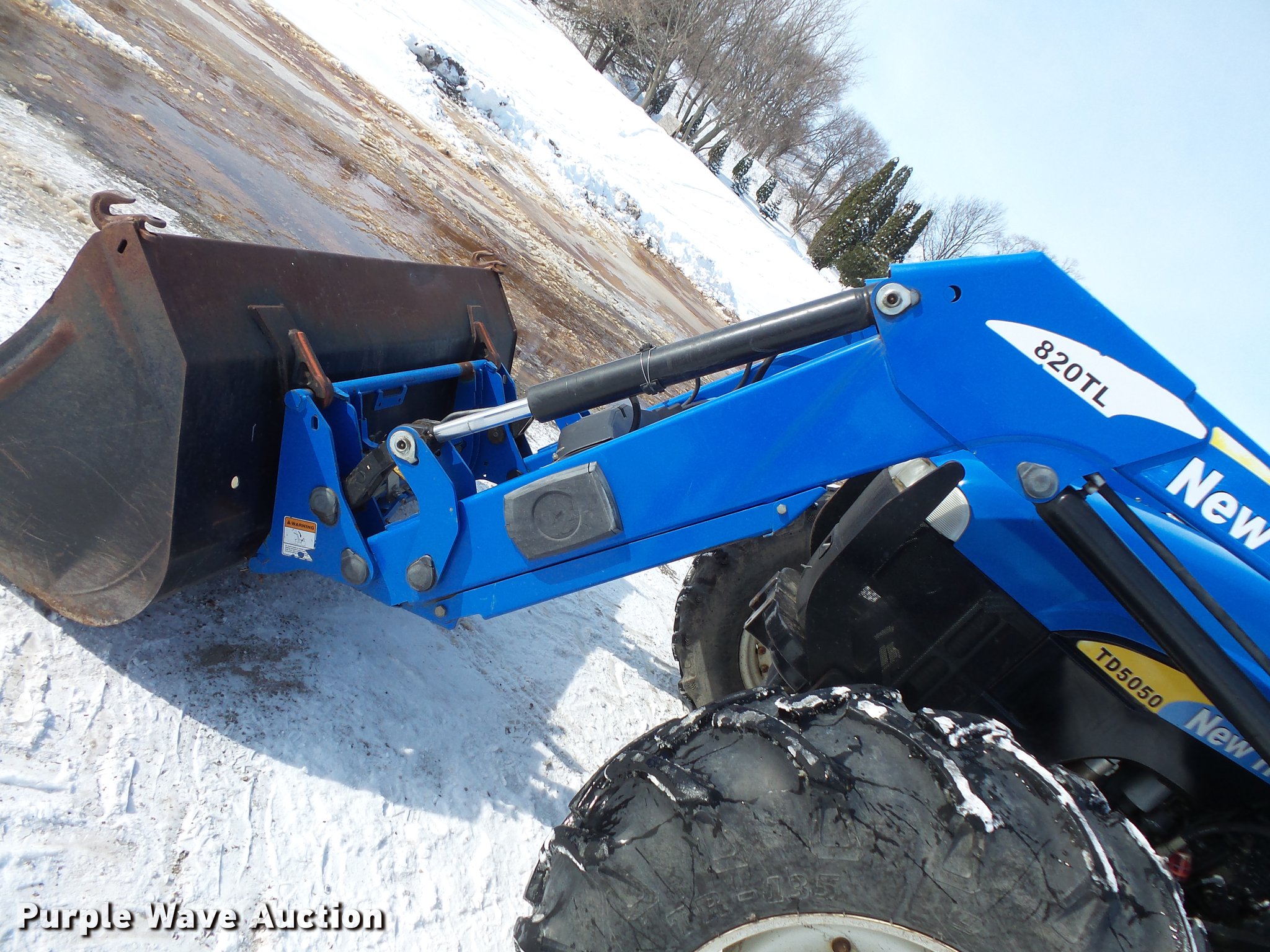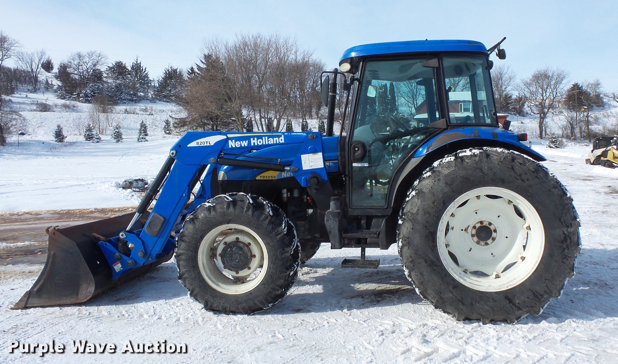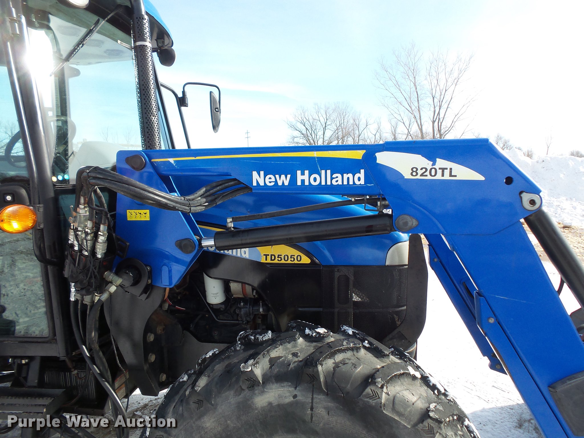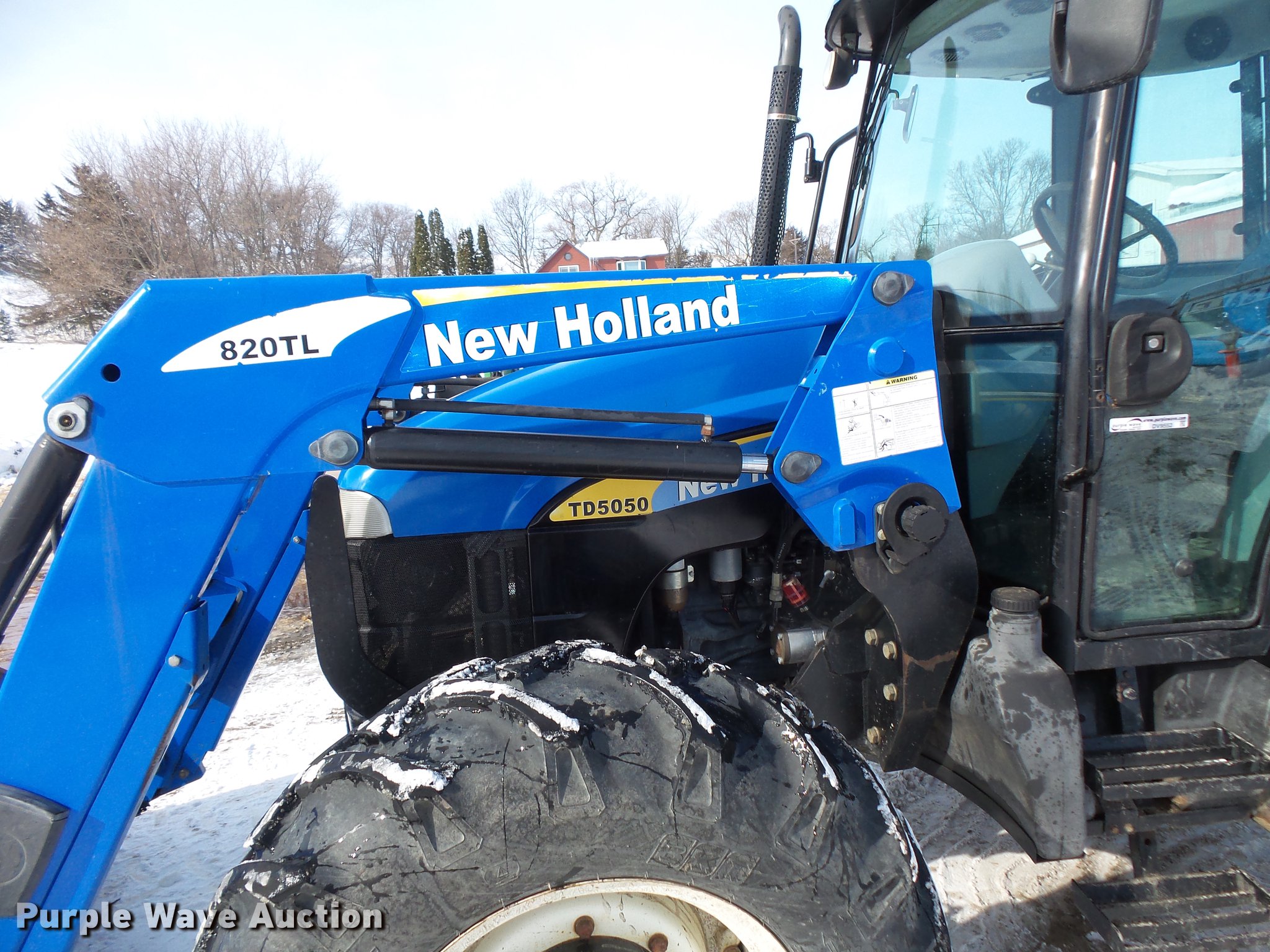 Purple Wave is selling a used Tractor in Minnesota. This item is a 2009 New Holland TD5050 MFWD tractor with the following: 111 hours on meter, 274 C.I.D. four cylinder turbo diesel engine, Model 445TA/MNE, Serial 641756, Manual transmission, 12F-12R gears, Differential lock, AC and heat, Tilt steering wheel, AM/FM, Suspension seat, Shade, New Holland 820TL loader, 72"W bucket, Quick attach, Joystick controls, Serial Y8WLE0389, Three point, Quick attach, Seven pin outlet, 540 PTO, Rear hydraulic remote sets, 340/85R24 front tires, 460/85R34 rear tires, Serial Z8JN00536