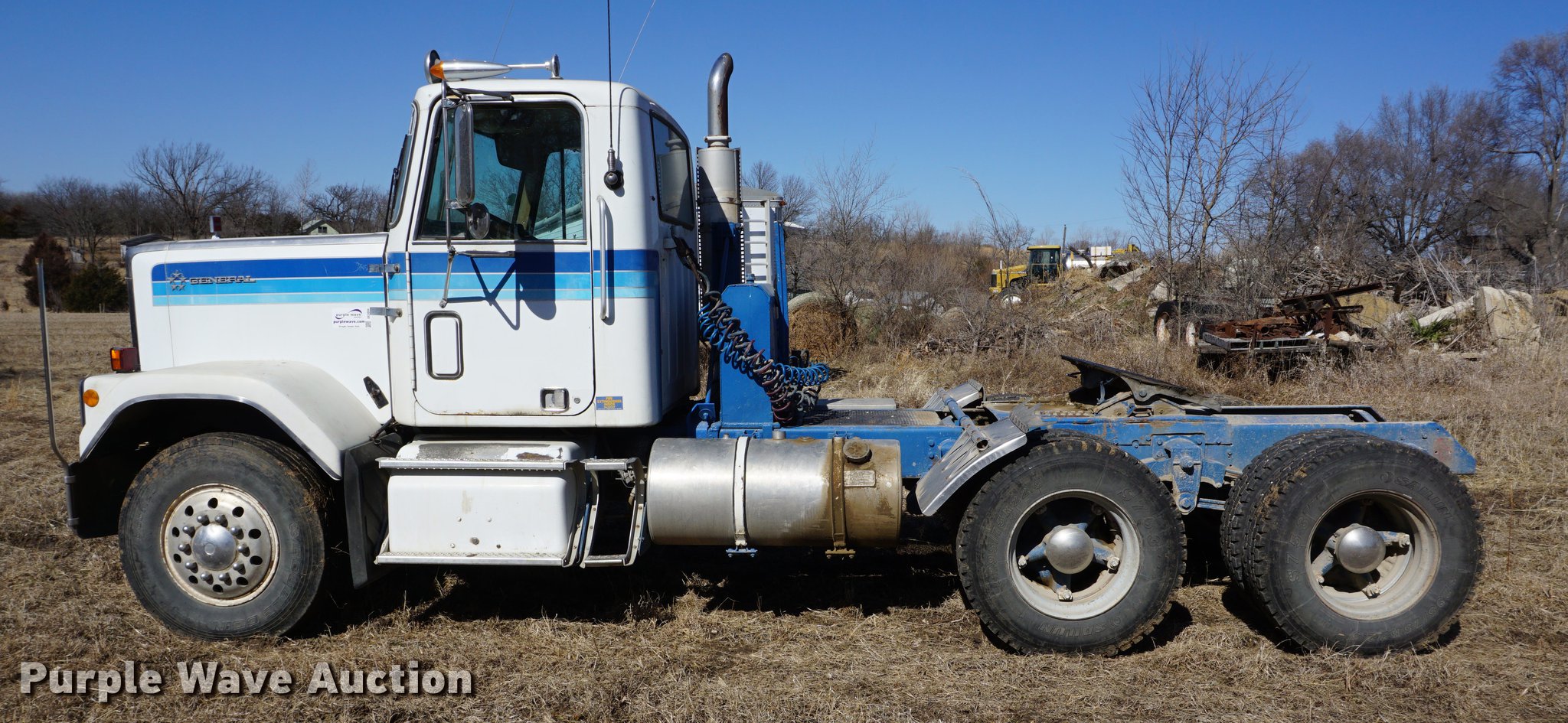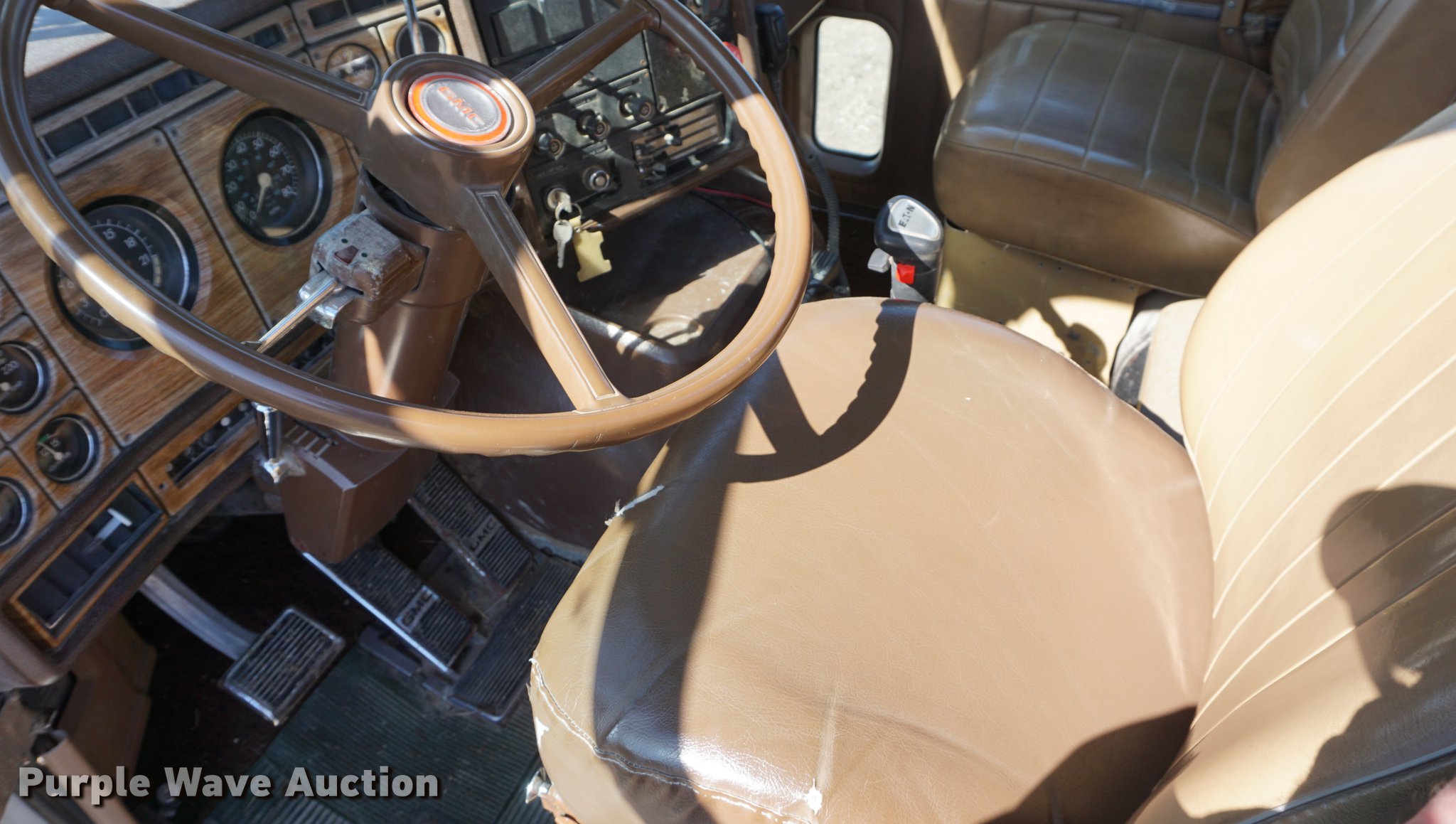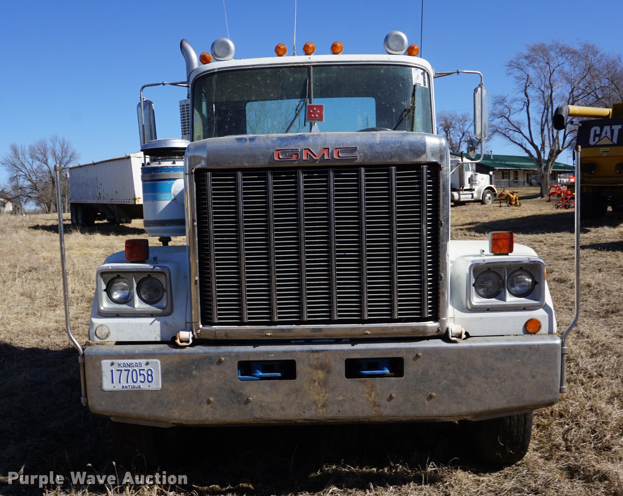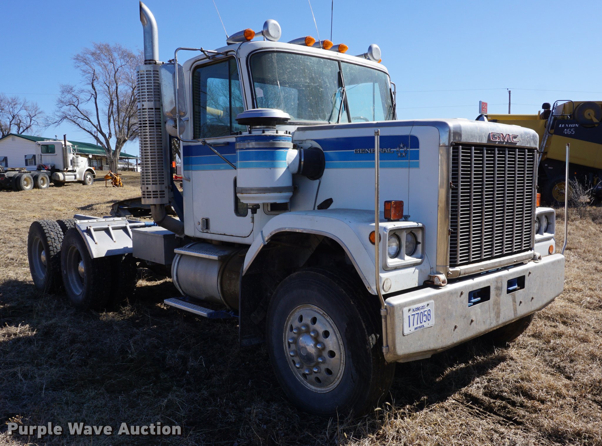 Purple Wave is selling a used Truck Tractor in Kansas. This item is a 1978 GMC General semi truck with the following: 425,138 miles on odometer, 9,727 hours on meter, Cummins NTC six cylinder turbo diesel engine, 290 HP, Eaton Fuller nine speed manual transmission, Tandem axle, Inter-axle differential lock, AC and heat, Tilt, AM/FM, Air suspension seat, PTO, Wet kit, Single exhaust stack, Steel deck plate, Sliding fifth wheel plate, Dual fuel tanks, Spring suspension, Air brakes, 10.00R20 front tires, 295/75R22.5 rear tires, GVWR 44,860 lbs, FAWR 10,860 lbs, IAWR 17,000 lbs, RAWR 17,000 lbs