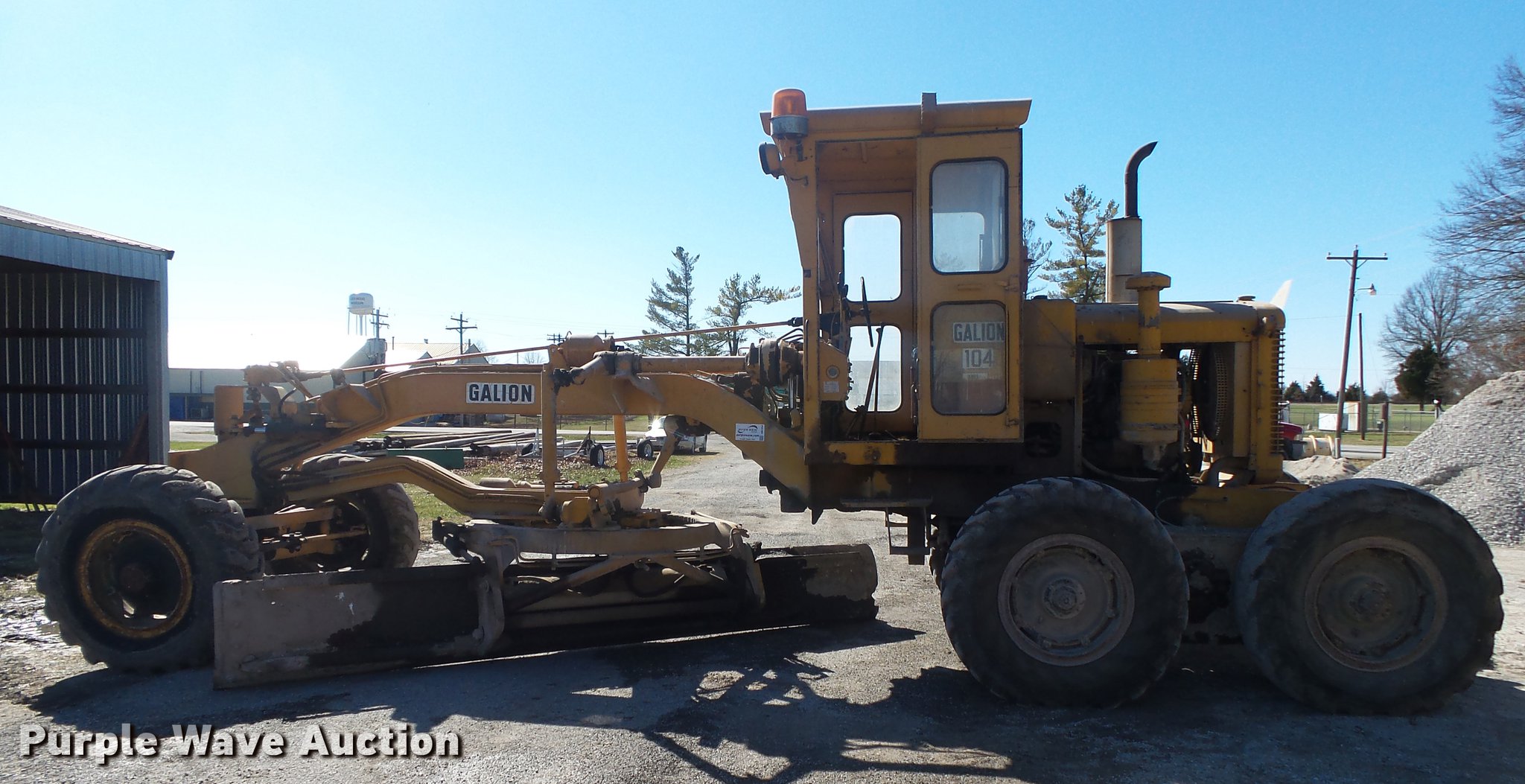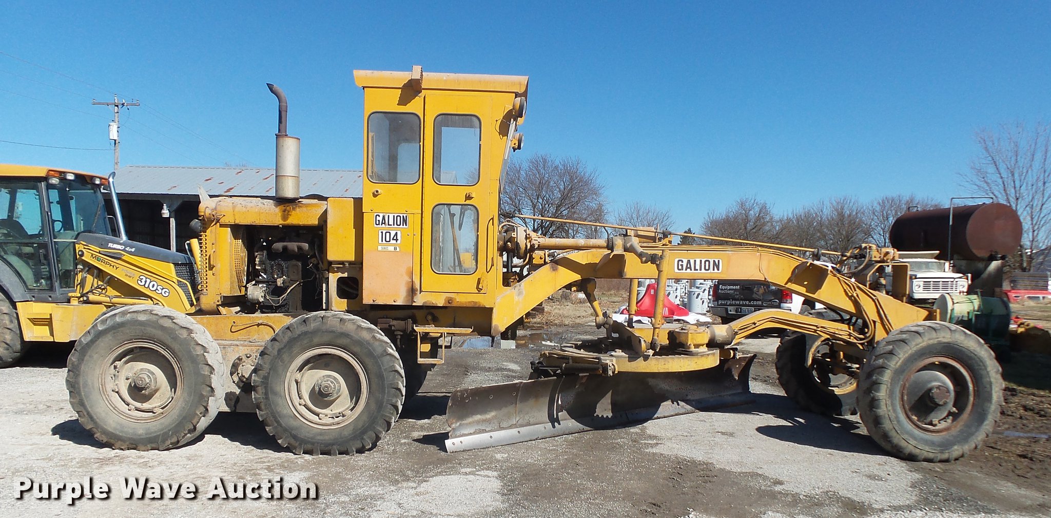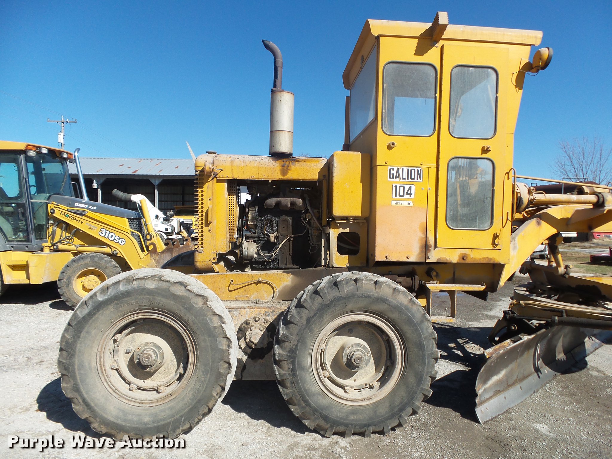 Purple Wave is selling a used Motor Grader in Missouri. This item is a 1969 Galion 104B rigid frame motor grader with the following: 1,444 hours on meter, GM 43 diesel engine, 6F-2R gears, Heat, Suspension seat, Seven control valves, Front work lights, 14'W moldboard, Side shift, 13.00-24TG tires, Oil leaks, Hydraulic cylinder leaks, Blade damaged, Tires dry rotted, Serial 104B-GC10216