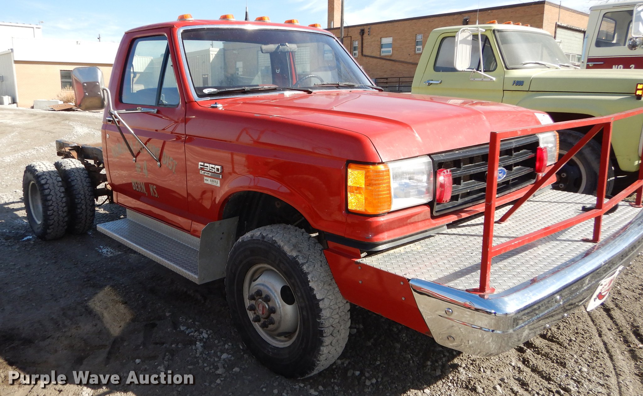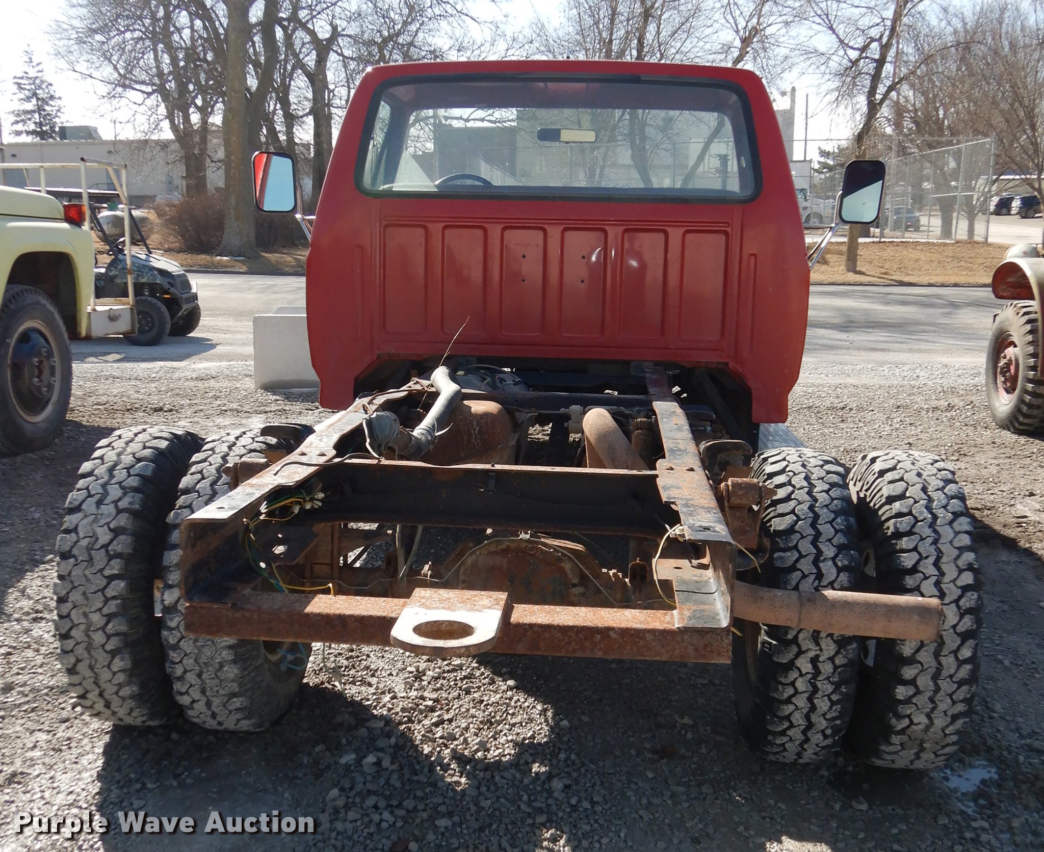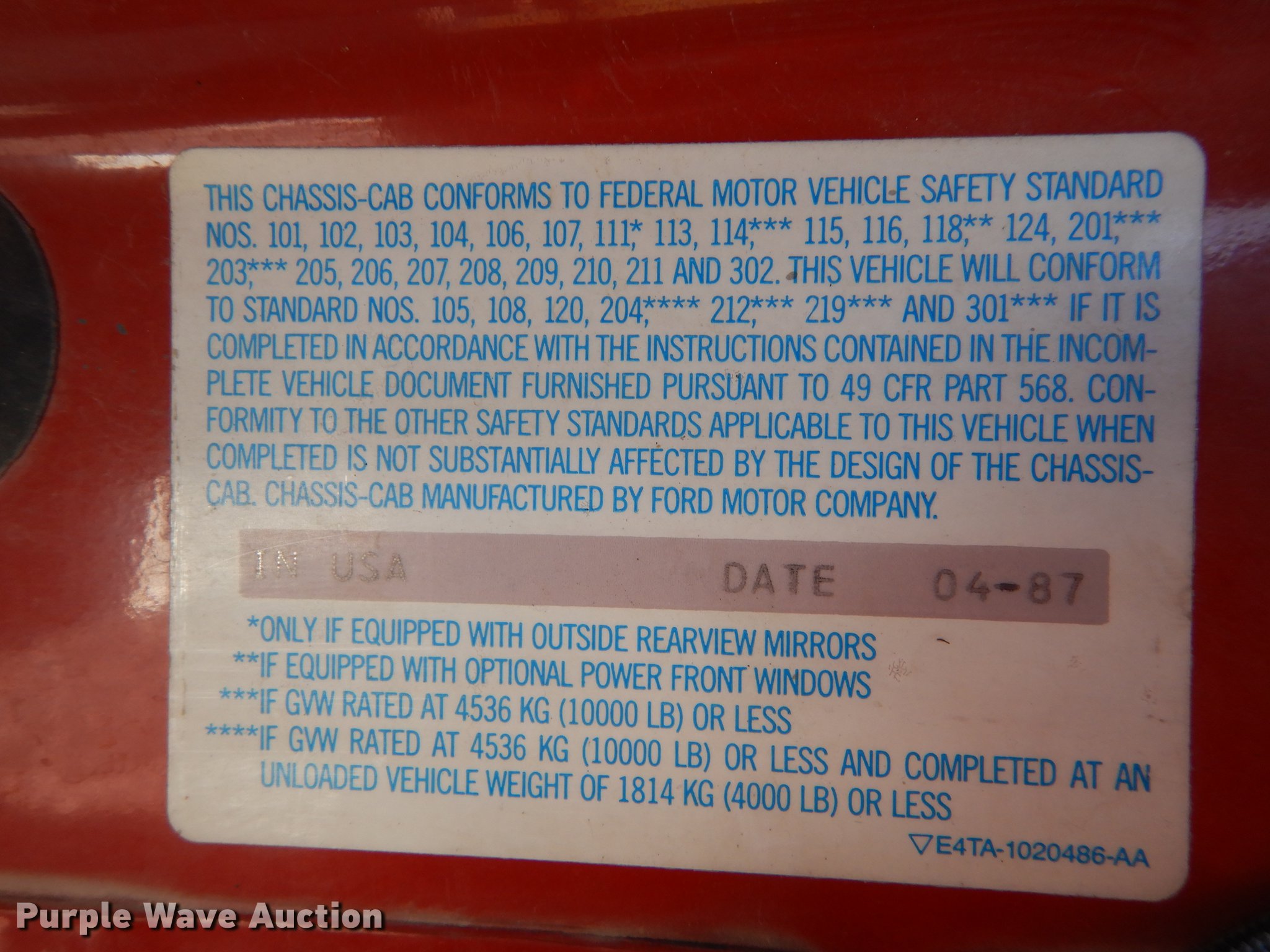 Purple Wave is selling a used 3/4 or 1 Ton Pickup or Van in Kansas. This item is a 1987 Ford F350 Custom pickup truck cab and chassis with the following: 7,079 miles on odometer, 7.5L V8 OHV 16V gas engine, Four speed manual transmission, Four wheel drive, Heat, Manual windows and locks, Vinyl interior, Front tow hooks, Running boards, Front catwalk, 235/85R16 tires, GVWR 11,000 lbs, No taillights