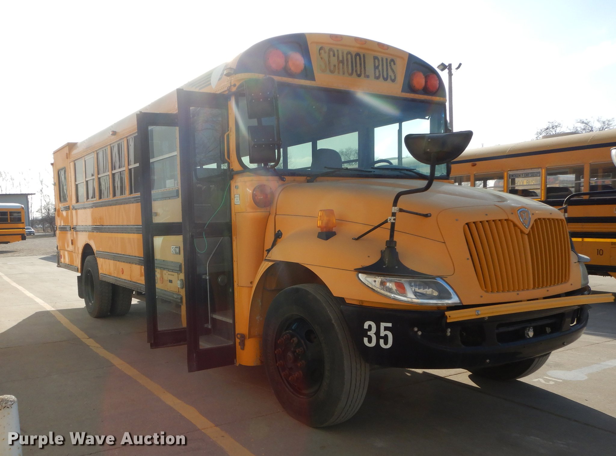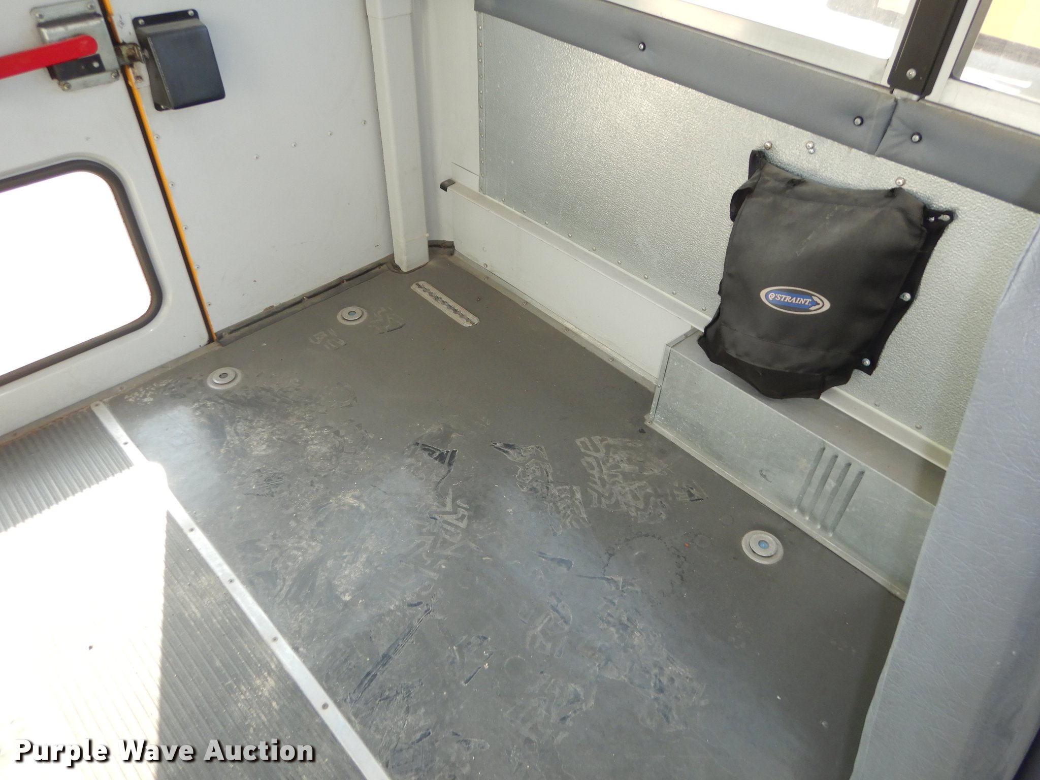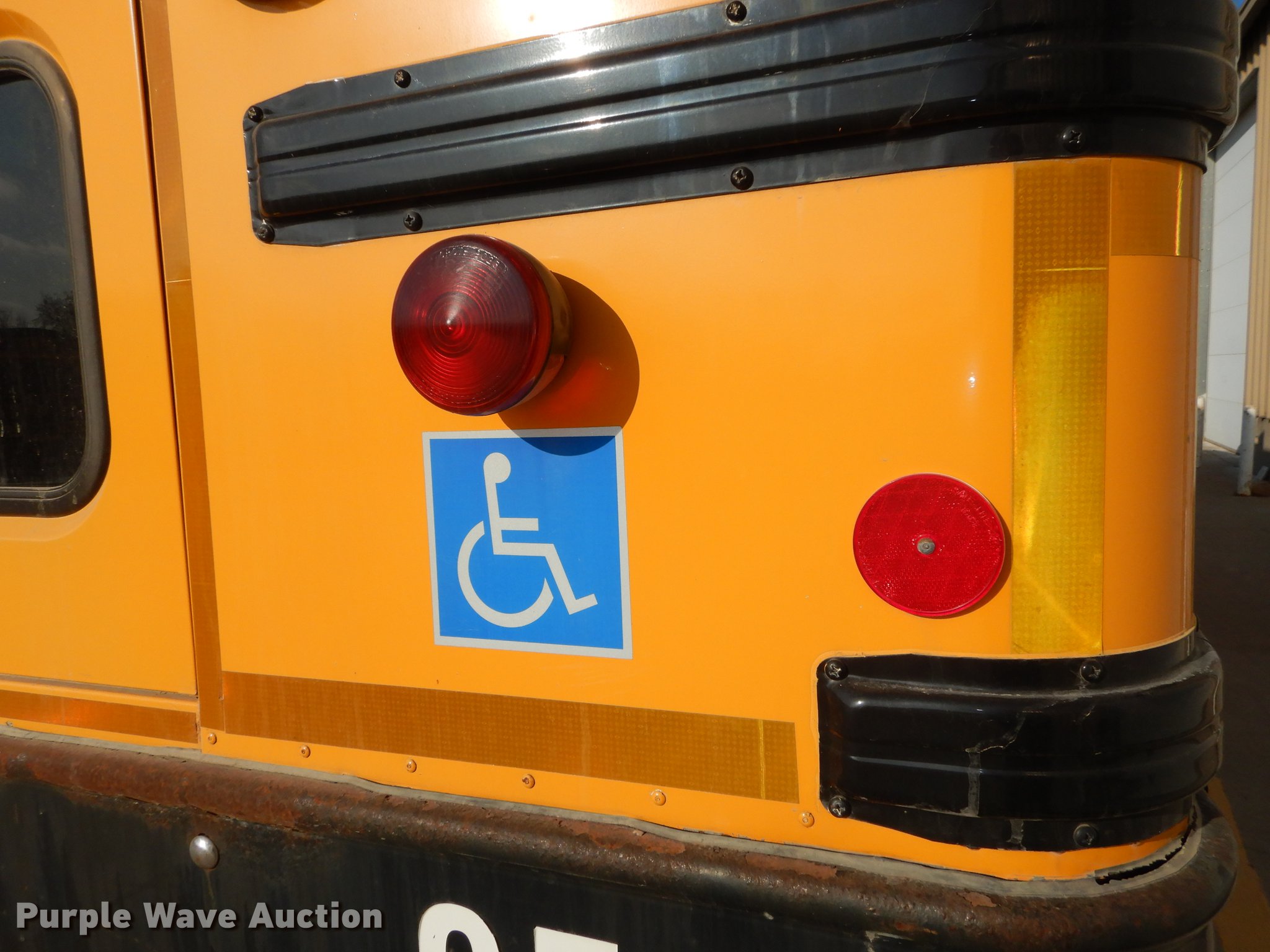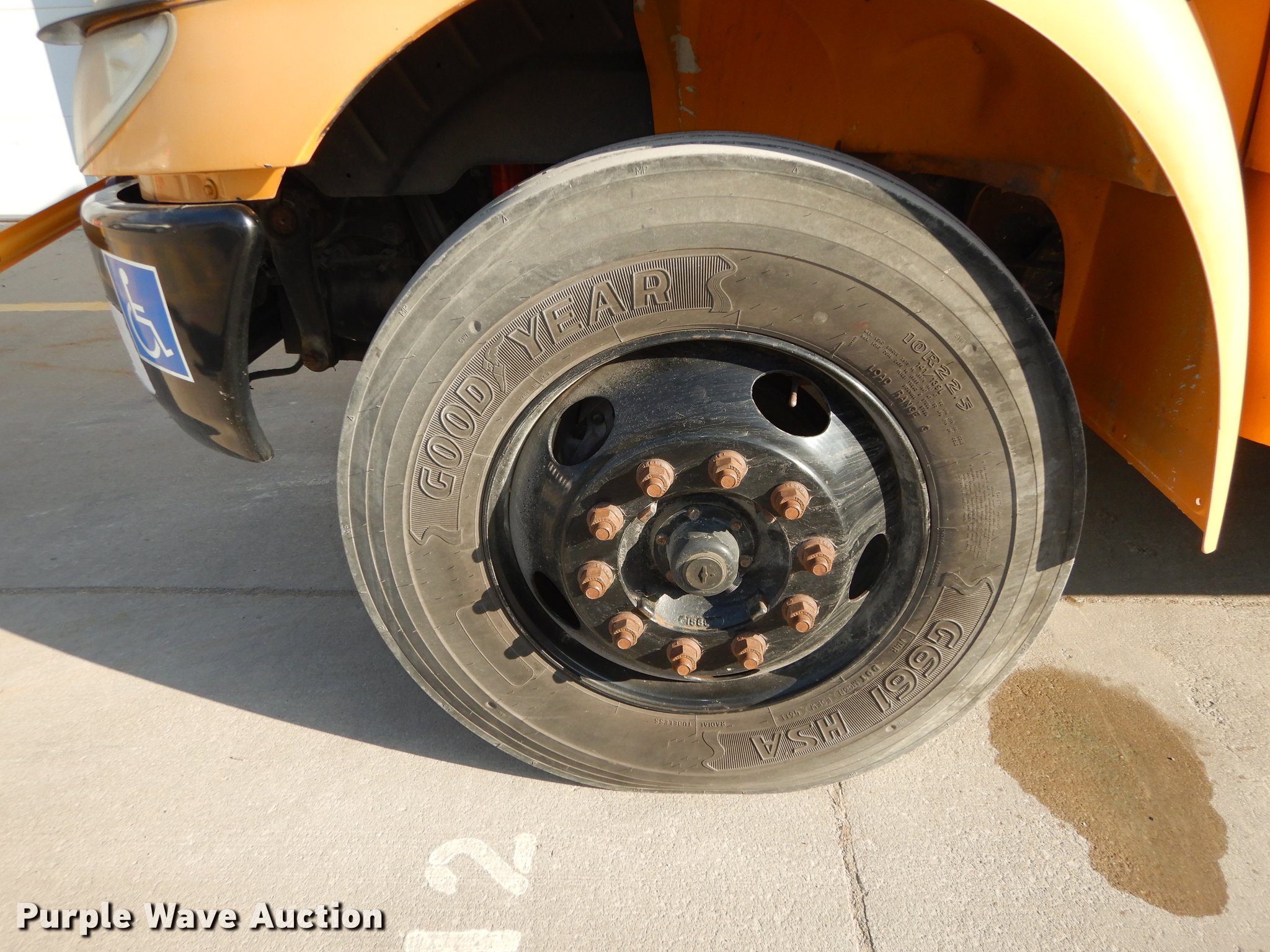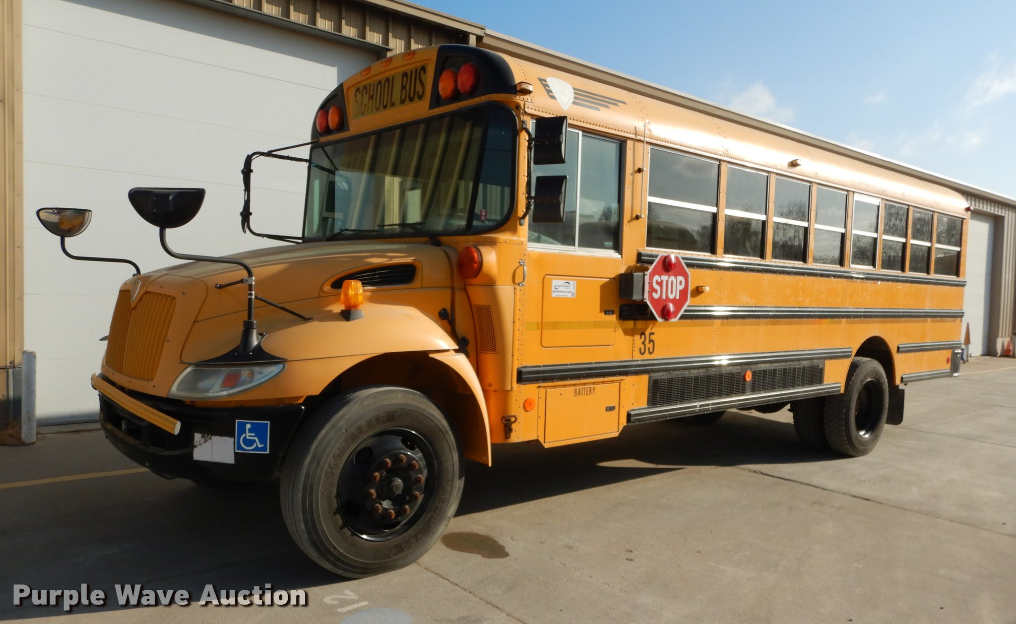 Purple Wave is selling a used Bus in Kansas. This item is a 2006 International CE200 school bus with the following: 123,609 miles on odometer, 8,871 hours on meter, International VT365 6.0L V8 turbo diesel engine, Automatic transmission, Single axle, Heat, Cruise, AM/FM/cassette, Heated mirrors, Air suspension drivers seat, Vinyl interior, 10 passenger capacity, One set of seat belts, (4) wheelchair tie down areas, Ceiling, rear, and side emergency exits, Lighted stop sign, Crossing bar, Carrier roof AC unit, Block heater, Backup alarm, Fear tow hooks, Spring suspension, Hydraulic brakes, 218" wheelbase, Goodyear 10R22.5 tires, GVWR 27,500 lbs, Unit# 35