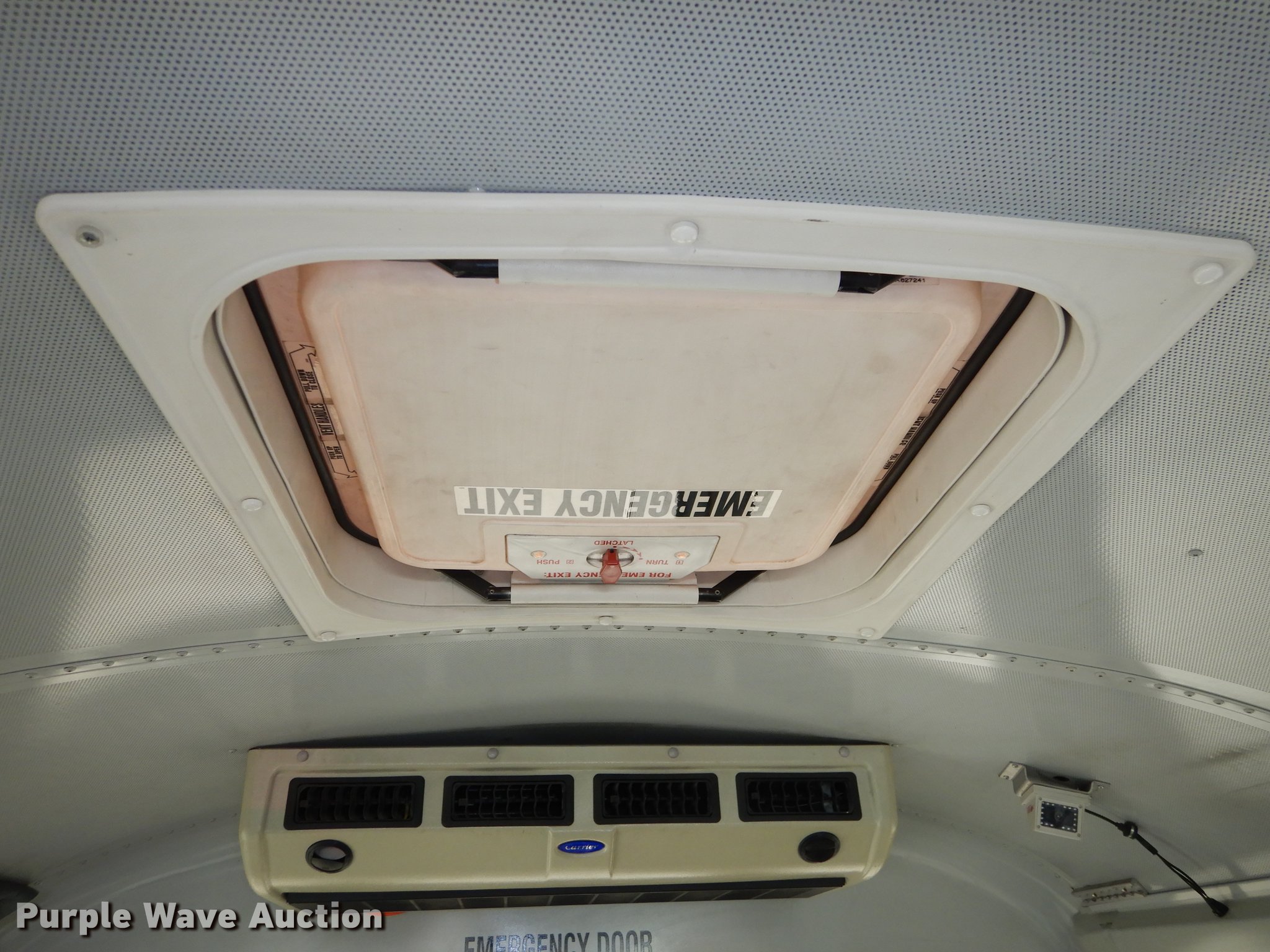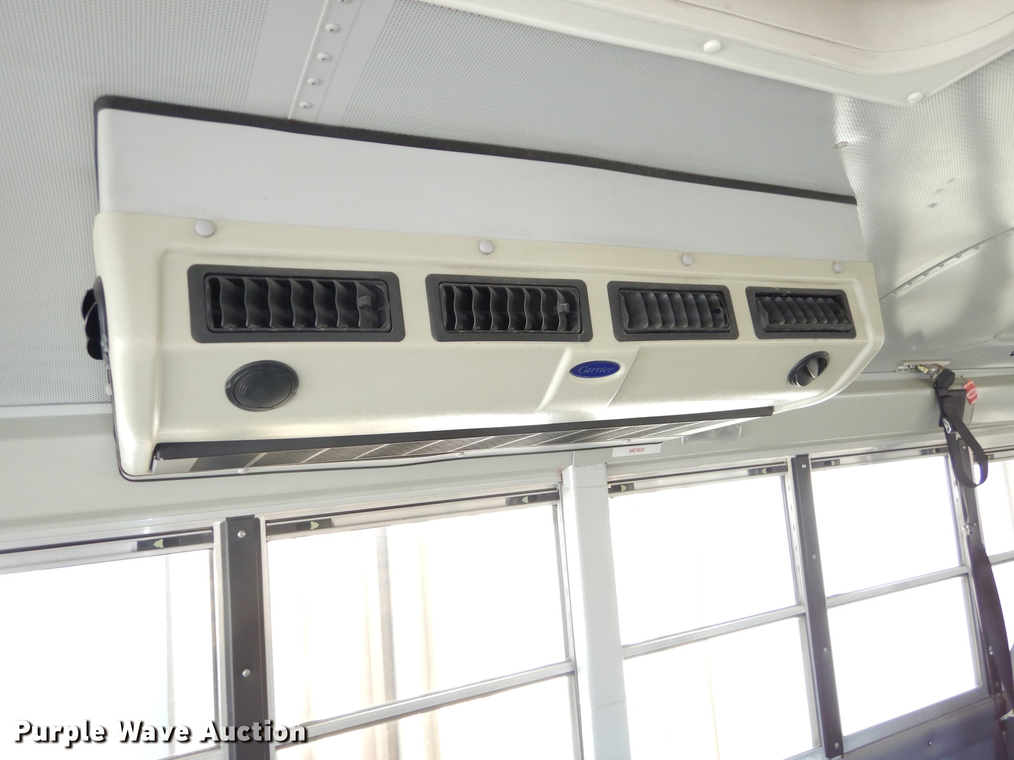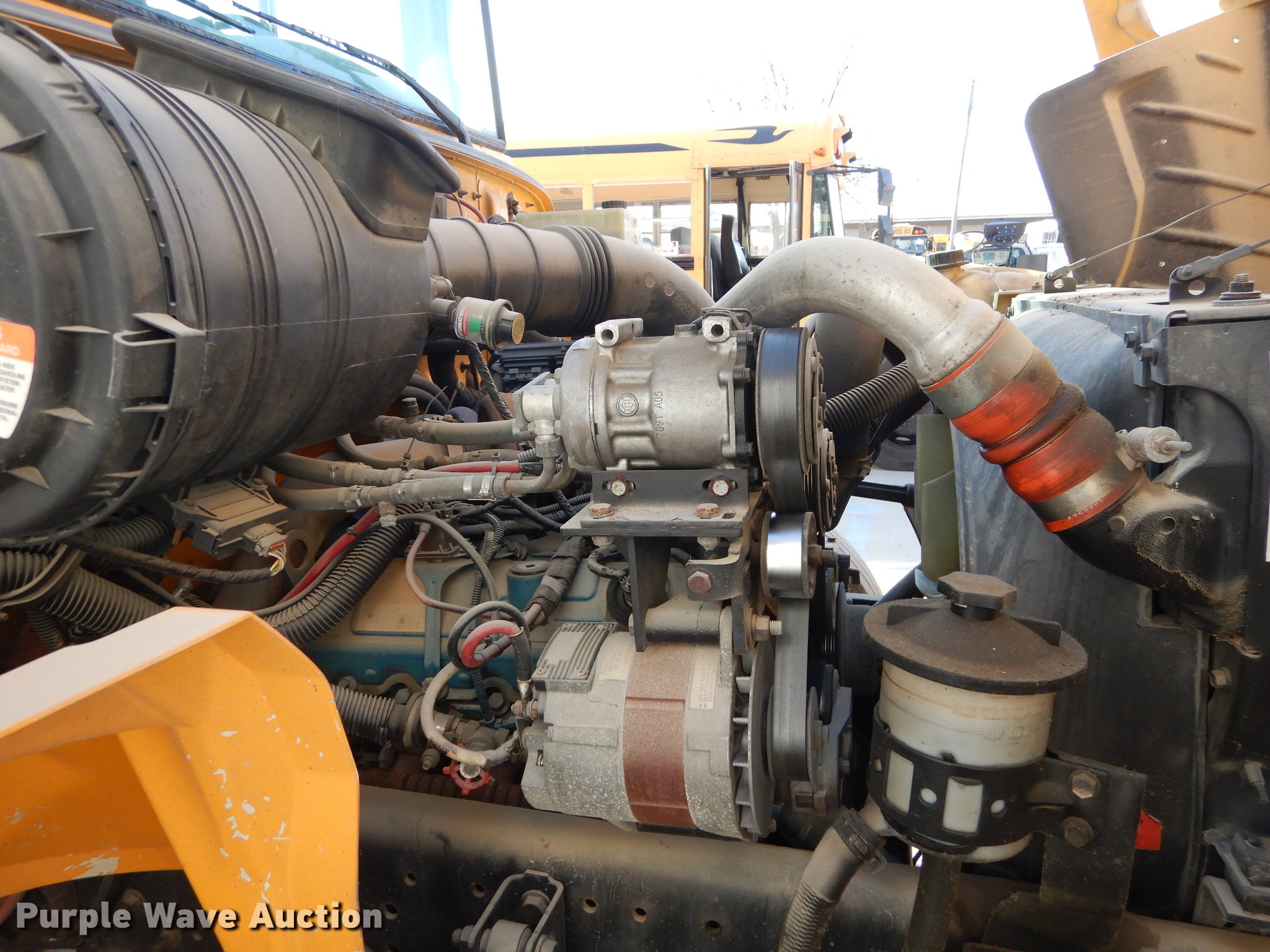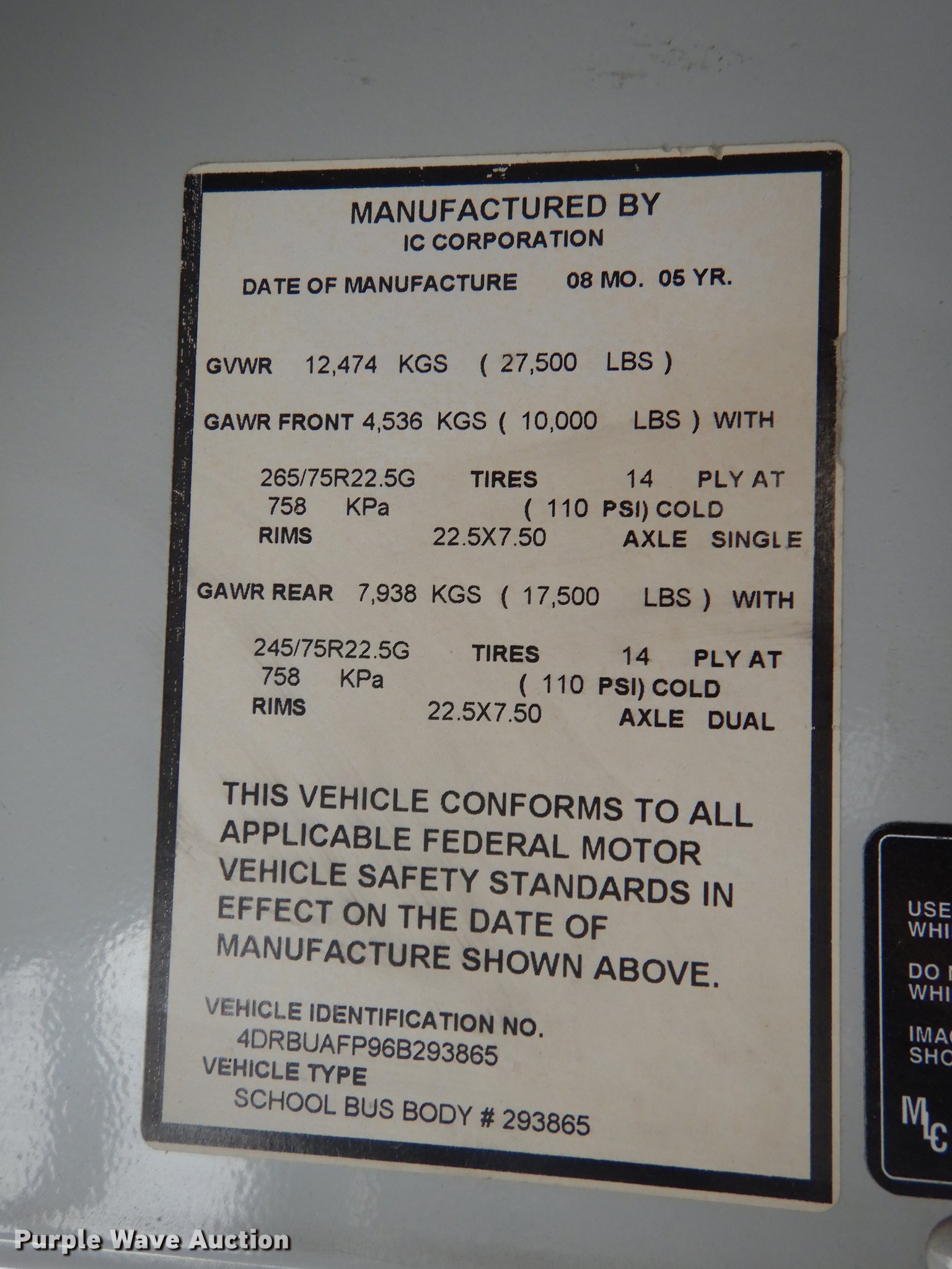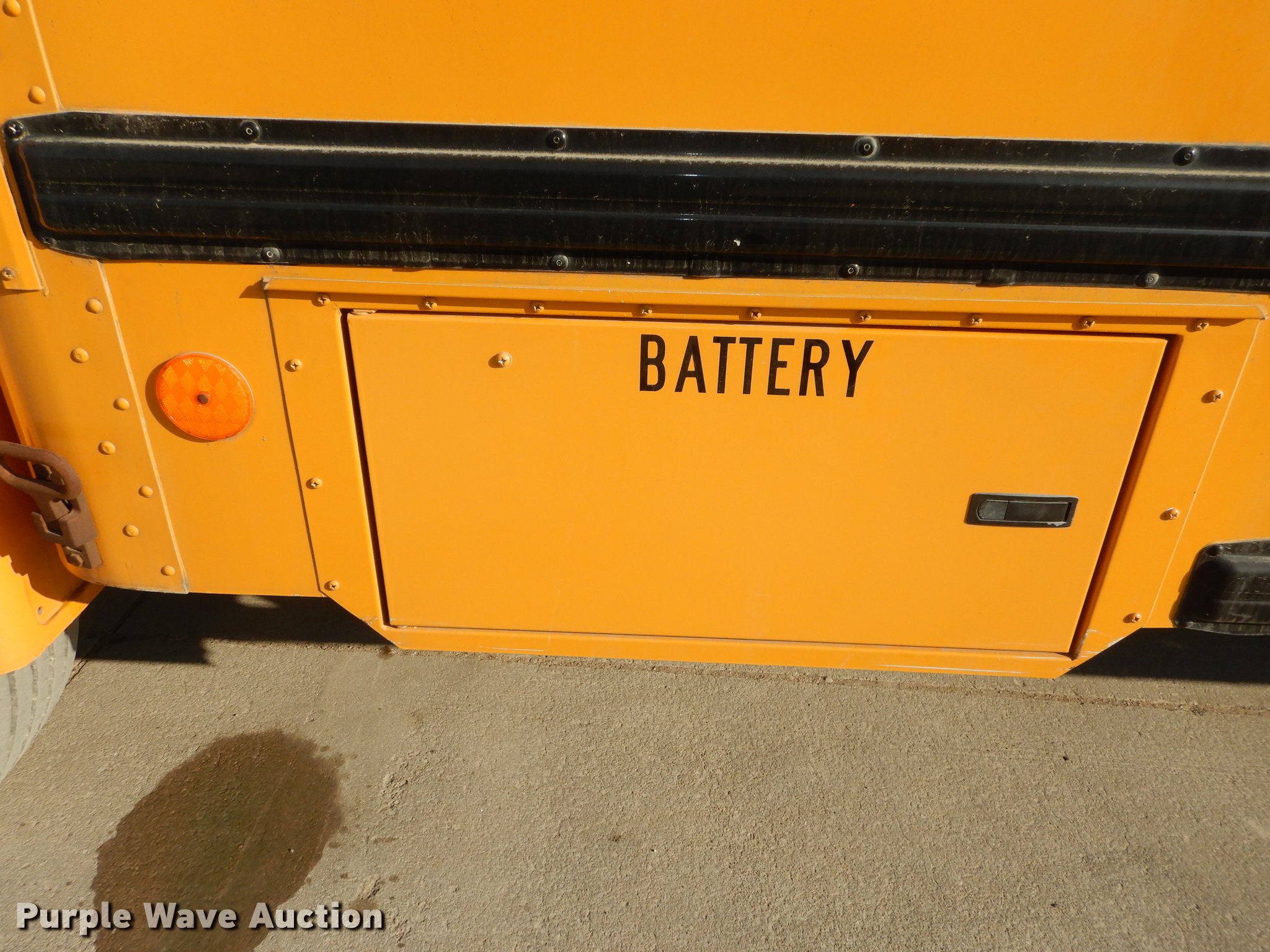Purple Wave is selling a used Bus in Kansas. This item is a 2006 International CE200 school bus with the following: 123,609 miles on odometer, 8,871 hours on meter, International VT365 6.0L V8 turbo diesel engine, Automatic transmission, Single axle, Heat, Cruise, AM/FM/cassette, Heated mirrors, Air suspension drivers seat, Vinyl interior, 10 passenger capacity, One set of seat belts, (4) wheelchair tie down areas, Ceiling, rear, and side emergency exits, Lighted stop sign, Crossing bar, Carrier roof AC unit, Block heater, Backup alarm, Fear tow hooks, Spring suspension, Hydraulic brakes, 218" wheelbase, Goodyear 10R22.5 tires, GVWR 27,500 lbs, Unit# 35