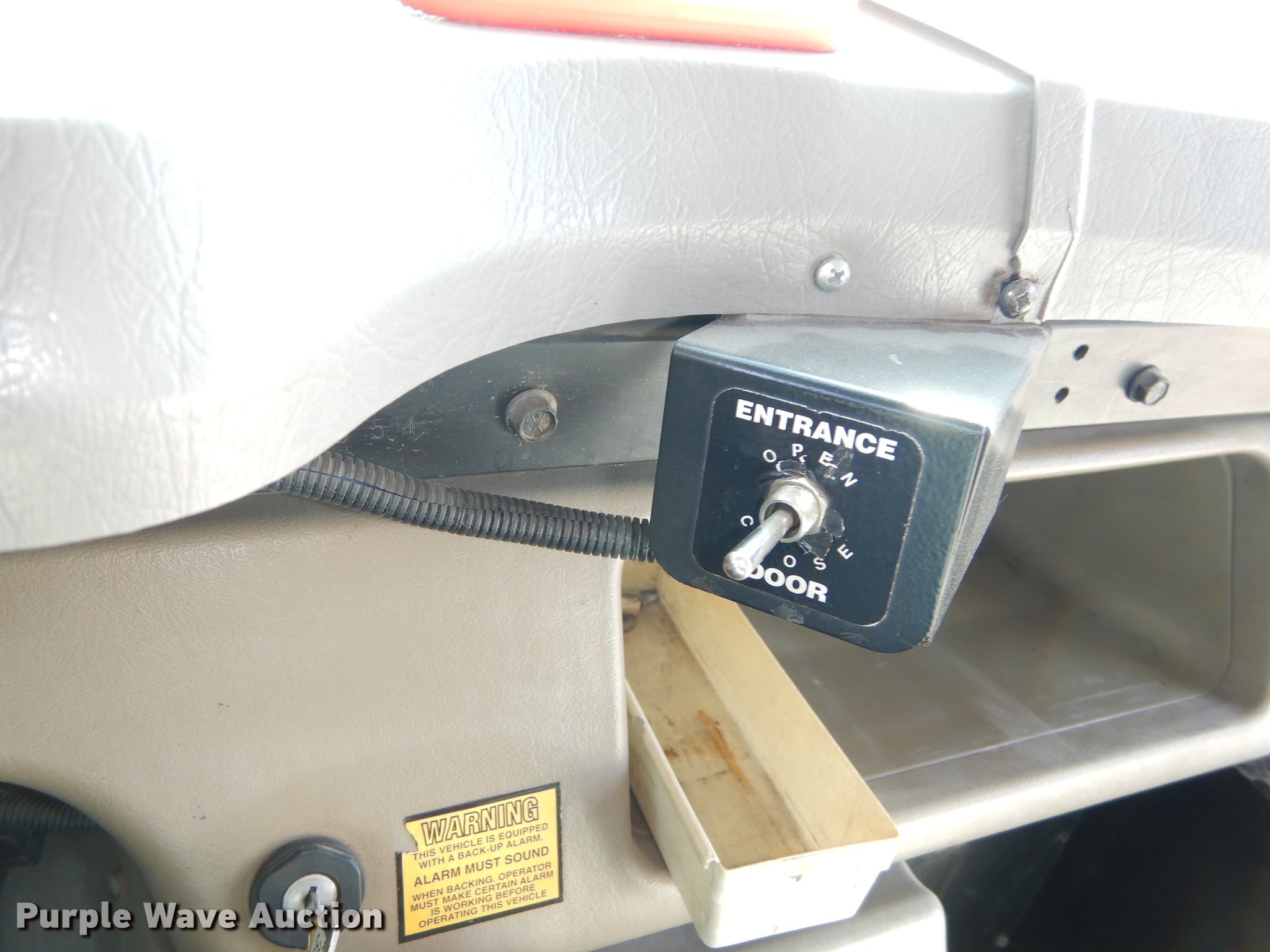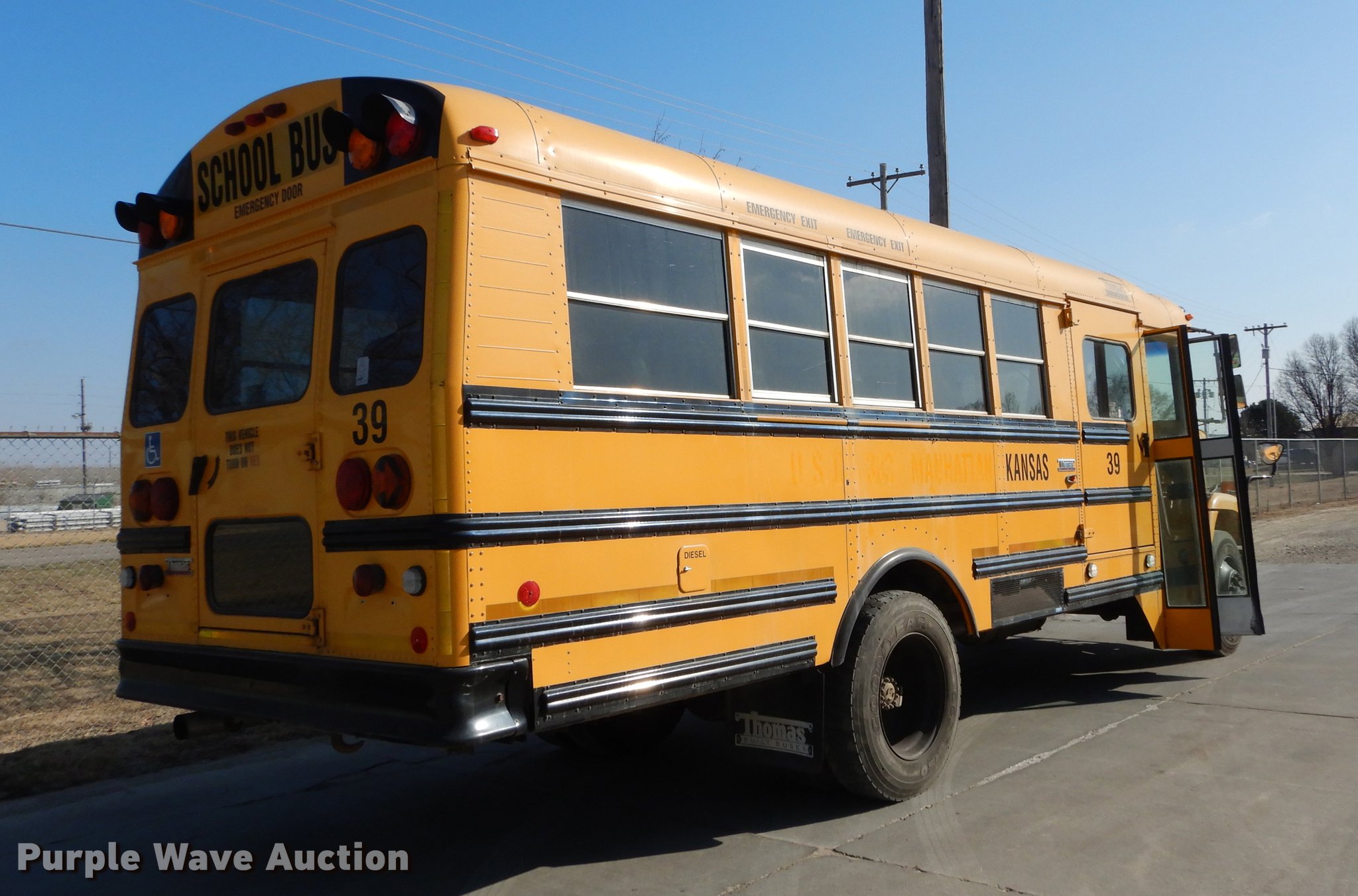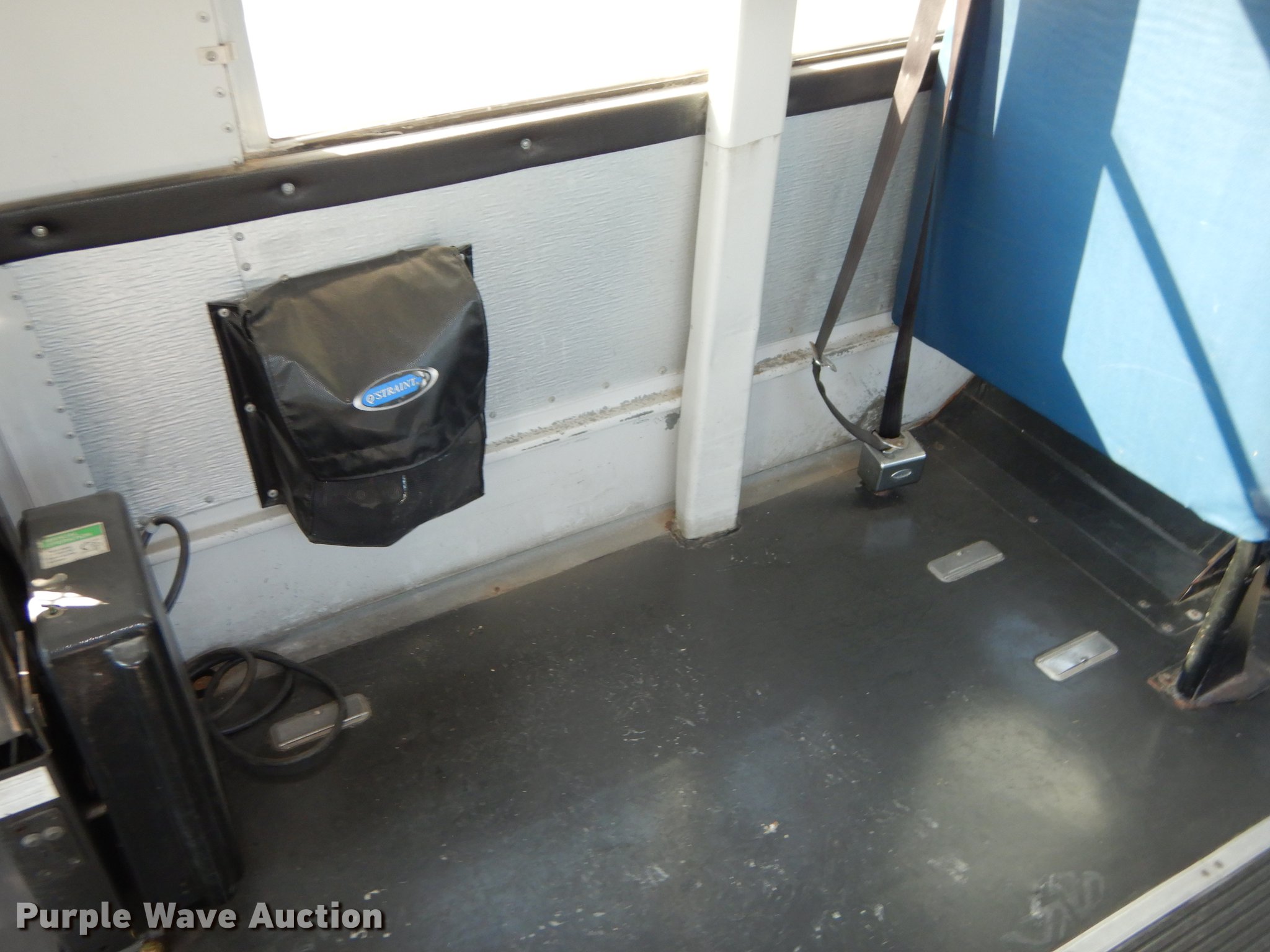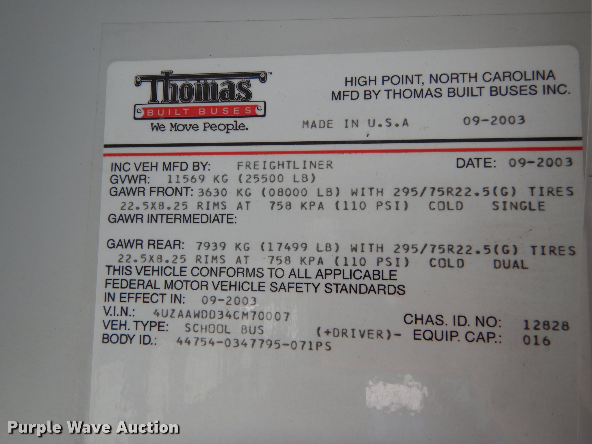 Purple Wave is selling a used Bus in Kansas. This item is a 2004 Freightliner FS65 Thomas school bus with the following: 153,414 miles on odometer, 9,624 hours on meter, Caterpillar C7 7.2L L6 turbo diesel engine, Automatic transmission, Single axle, Heat, Cruise, AM/FM/cassette, Heated mirrors, Leather air suspension drivers seat, Vinyl passenger seat, 10 passenger capacity, Braun wheelchair lift, (4) wheelchair tie down areas, Ceiling, rear, and side emergency exits, Lighted stop sign, TransAir roof AC unit, Block heater, Backup alarm, Front and rear tow hooks, Spring suspension, Hydraulic brakes, 192" wheelbase, 10R22.5 tires, GVWR 25,500 lbs, Unit# 39